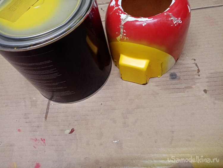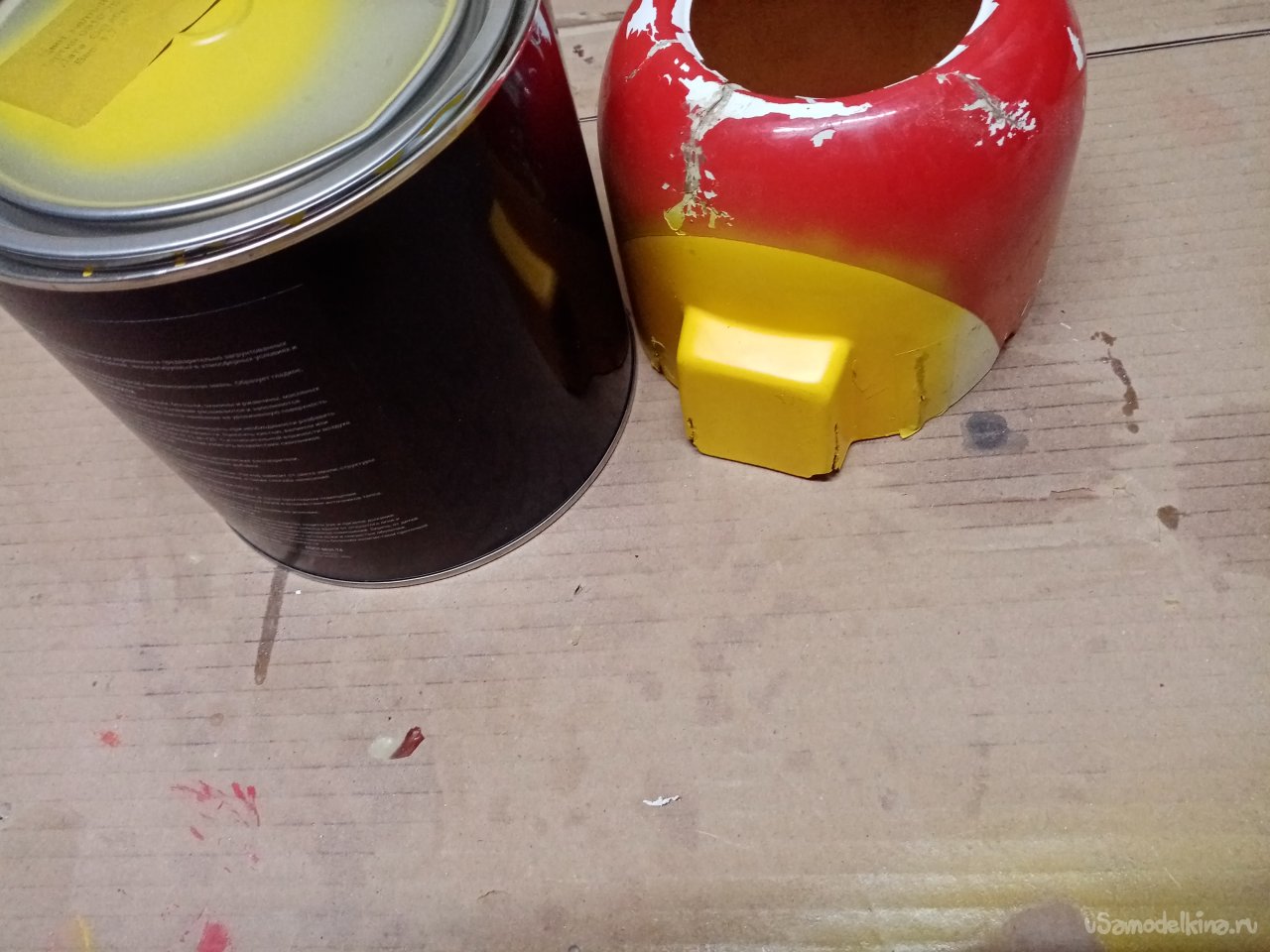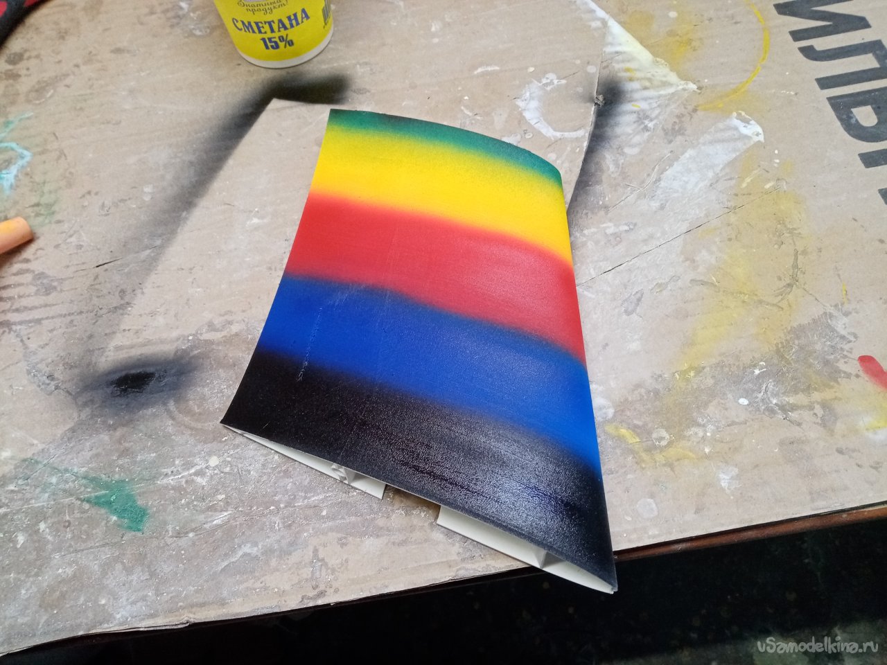 Можно было и верх красить одновременно. Но не мог сразу представить картину сверху. Поэтому пришлось тщательно промывать аэрограф от черной. Разбирать и чистить полностью все каналы. После помывки можно переходить к верхней части. Желтый цвет уже изначально нанесен. Наклеиваю защиту из малярного скотча и прохожу красным. Еще защита из малярного скотча и наношу синий. Была задумка сочетания синего с желтым. Но такой вариант сейчас не патриотичен, хотя смотрится свирепо. Не буду же доказывать вопрошающим, что Швеция типа «трэ крунур» нравится.