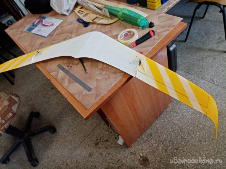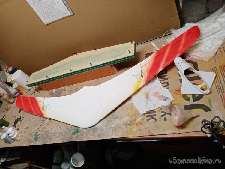 Покрываю фюзеляж, кок винта и крышки сервоприводов этой замечательной жидкостью для полной гарантии последующего прилегания красочного слоя. В моей задумке по окраске основной акцент буду делать на желтый цвет. Постараюсь окрасить крыло в яркий вариант. Чтобы хорошо читалось в полете. С этой целью нужно разделить визуально верхнюю и нижнюю части крыла. Полетит вверх ногами я и не замечу..