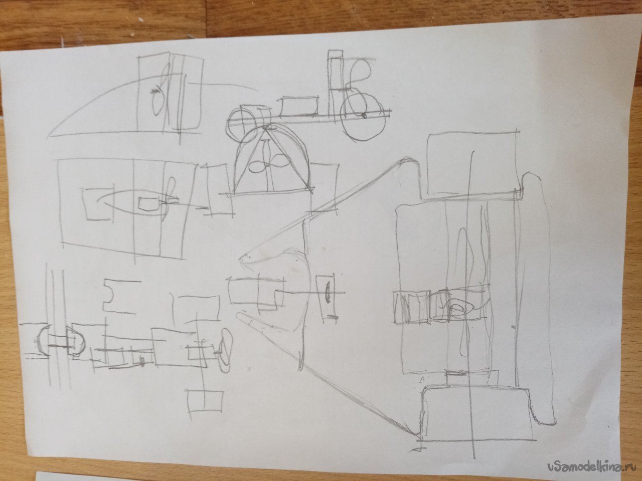 По традиции нашего друга Валериана с сайта, набросал компоновочный чертеж. На нескольких листах. Изначально хотел изготовить четырех колесную конструкцию. Но нашел только три колеса примерно одинаковой конструкции. Получится трицикл. Конструкция не очень устойчива на поворотах. Поэтому без дрифта, осторожненько в повороте. Вторая мысль поставить на конструкцию камеру и гонять оп очкам. Но идея остановилась. Придется делать амортизацию на колеса и значительно, чтобы изображение не прыгало. Возвращаюсь к первоначальному варианту.