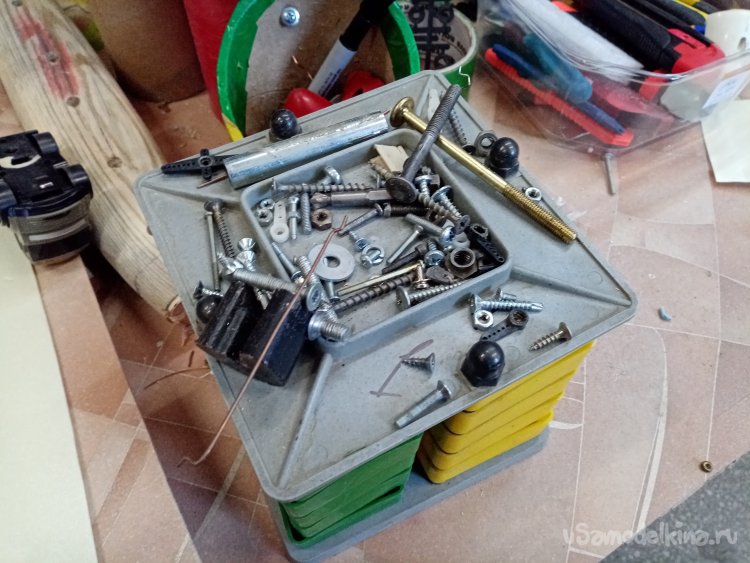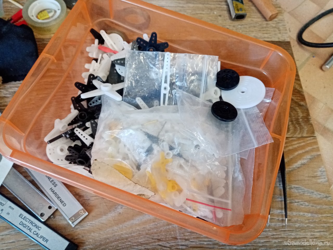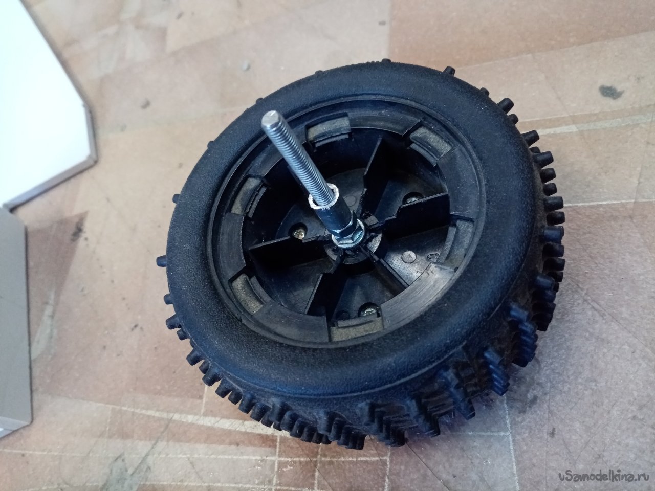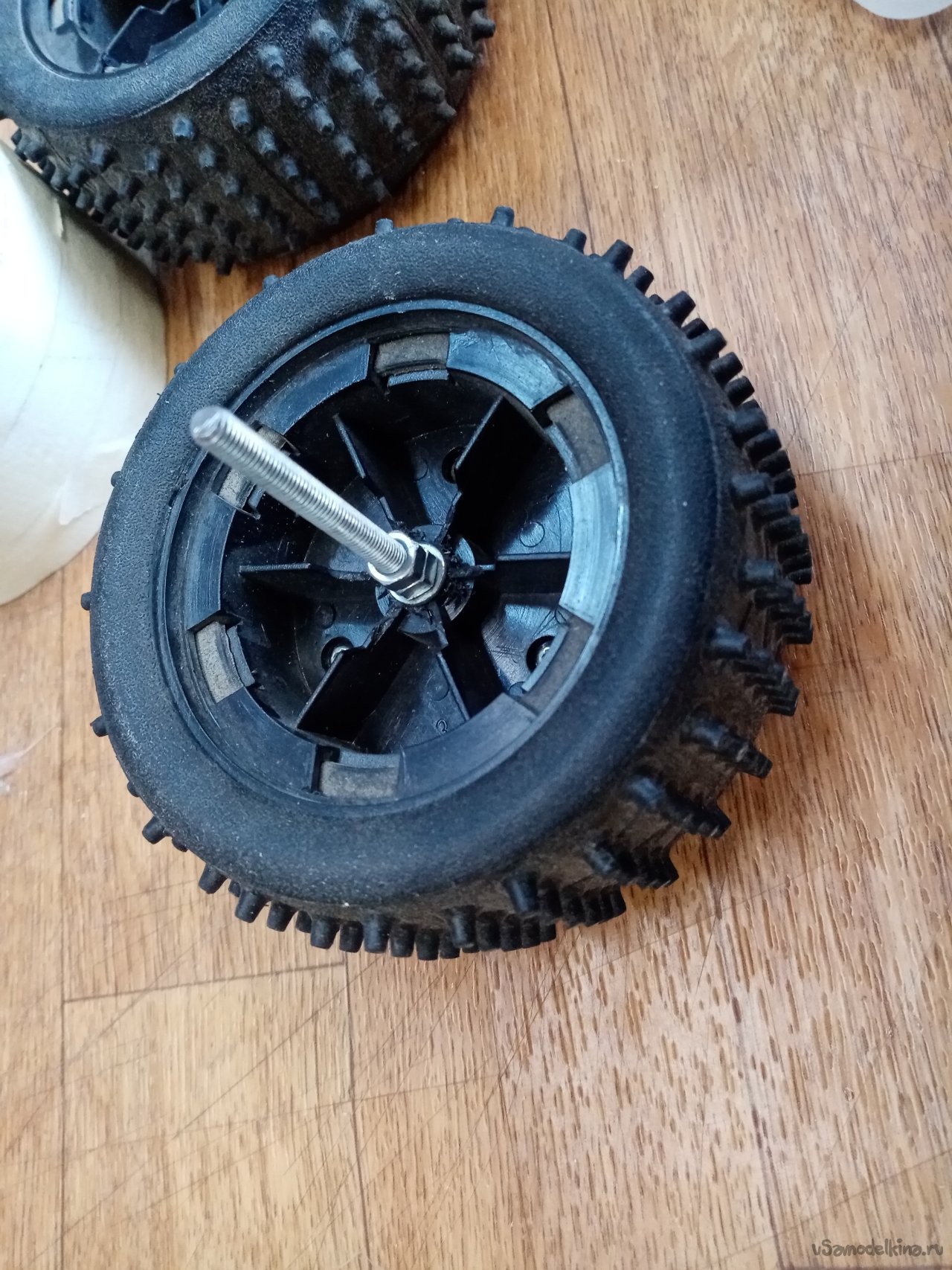 Нужно еще подобрать качалку нужного размера на ось колеса. В течение времени этого добра у меня набралось целая коробочка. Есть контакт! Качалка очень туго к оси. Не беда нарезаю резьбу и накручиваю её на место. Фиксирую гайкой сверху. Устанавливаю и закрепляю сервопривод. Не забываю вывести провод управления вверх.