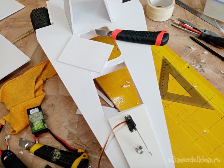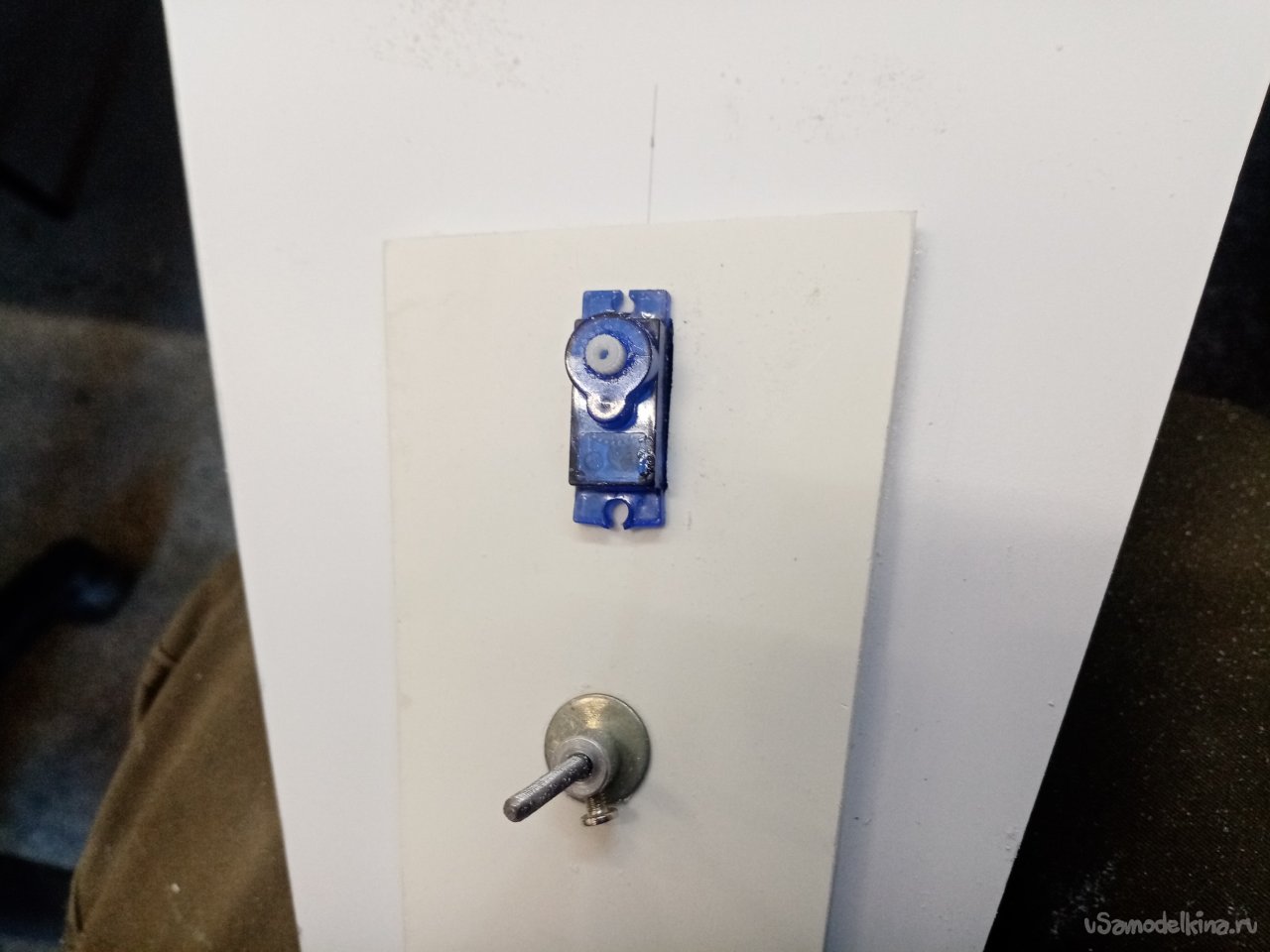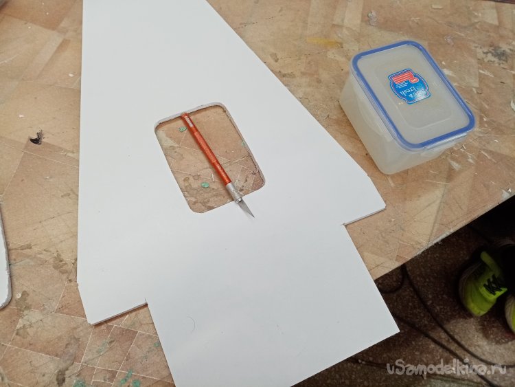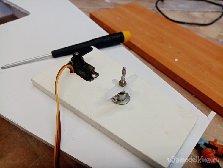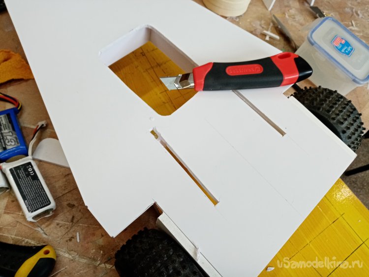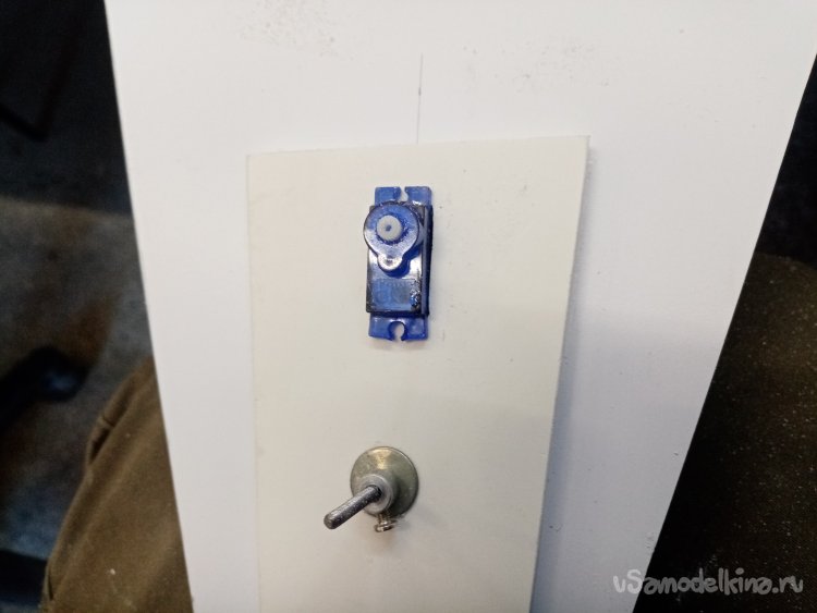 Отверстие готово примеряю контрольный сервопривод. Хорошо подходит. В боковой грани нужно вырезать отверстие для провода управления. Его нужно вывести наверх платформы, протянуть к контейнеру управления. Что и было сделано при помощи треугольного ножа для творчества.