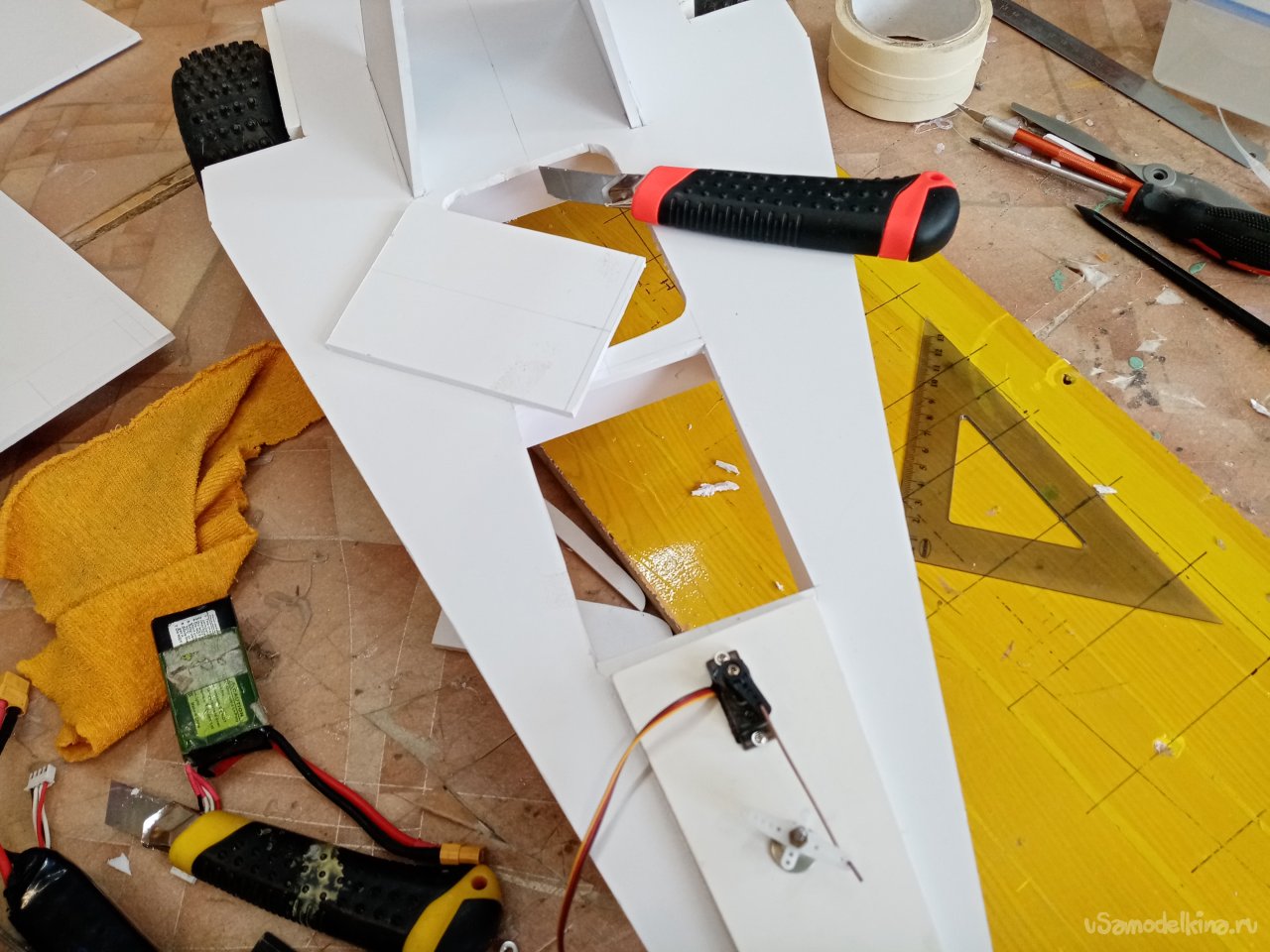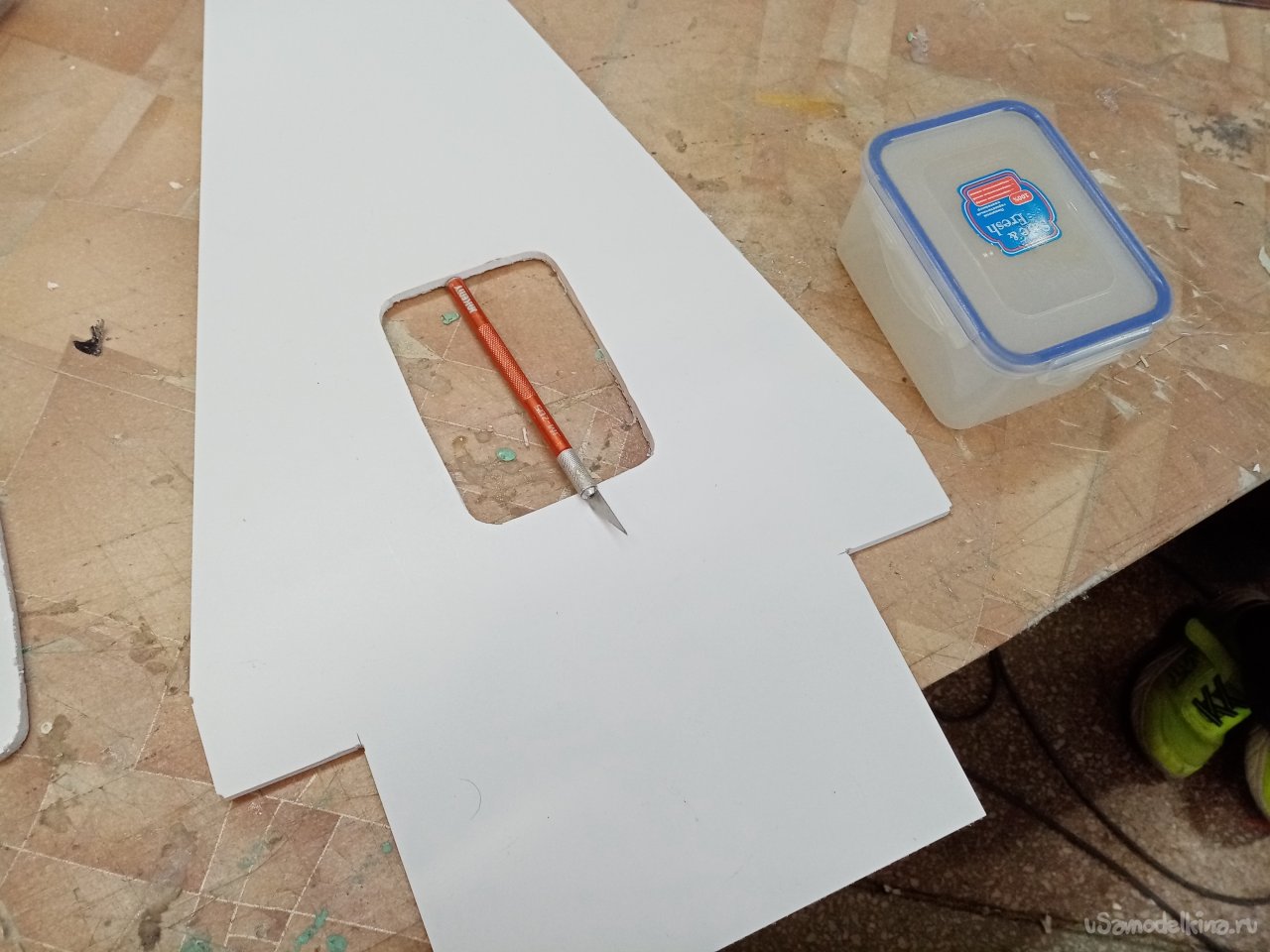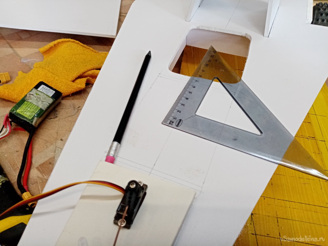 Отверстие готово примеряю контрольный сервопривод. Хорошо подходит. В боковой грани нужно вырезать отверстие для провода управления. Его нужно вывести наверх платформы, протянуть к контейнеру управления. Что и было сделано при помощи треугольного ножа для творчества.
