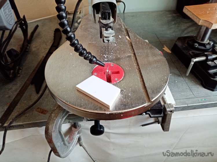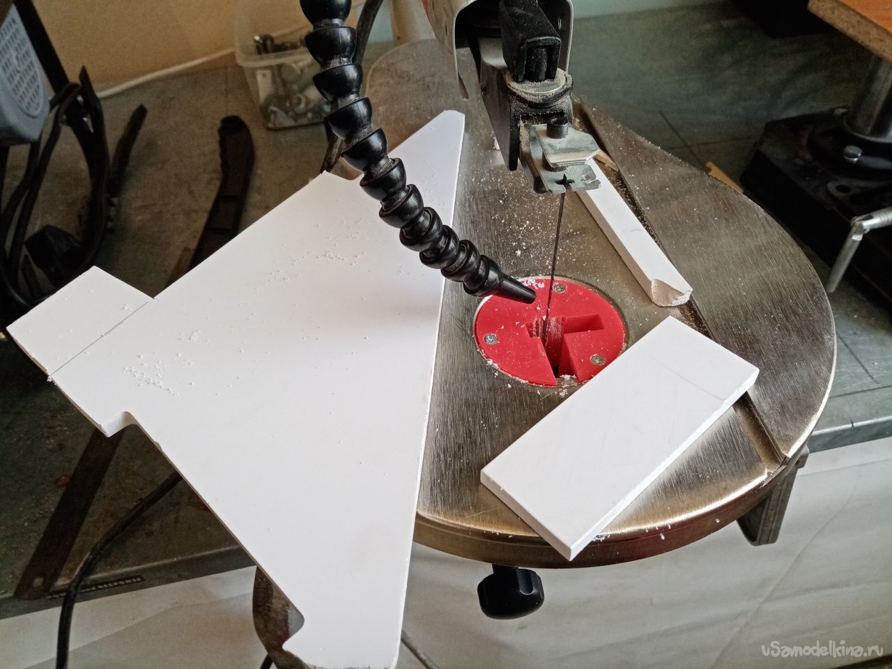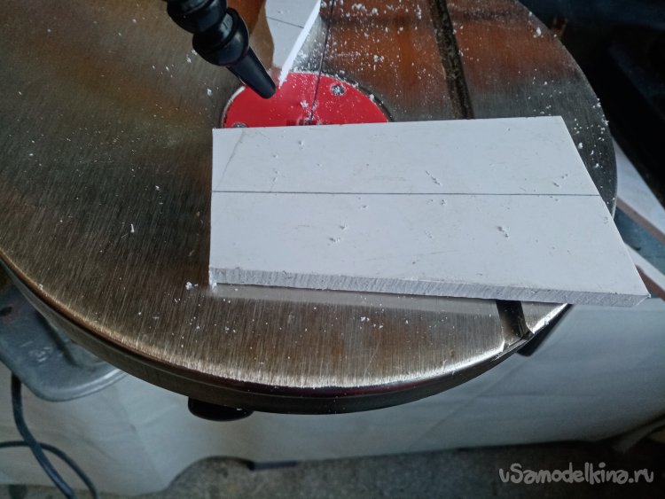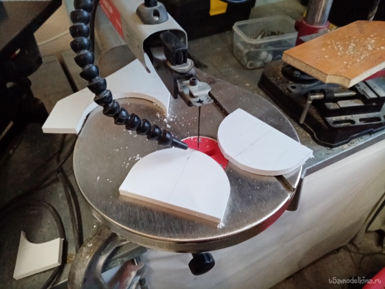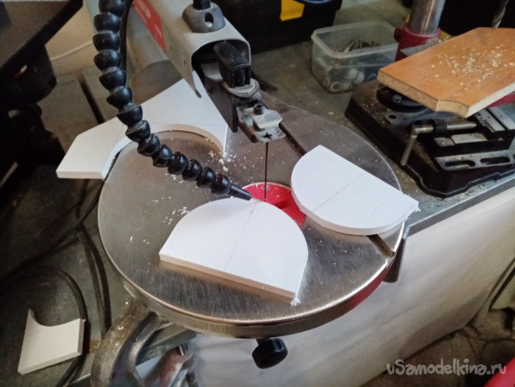 Еще раз примеряю основные колеса. Нужно закрепить и желательно прочно. В дело пойдут обрезки более толстого пластика а точнее в 10 миллиметров. Разметив контуры деталей, бодро выпиливаю на механическом стационарном лобзике парочку.