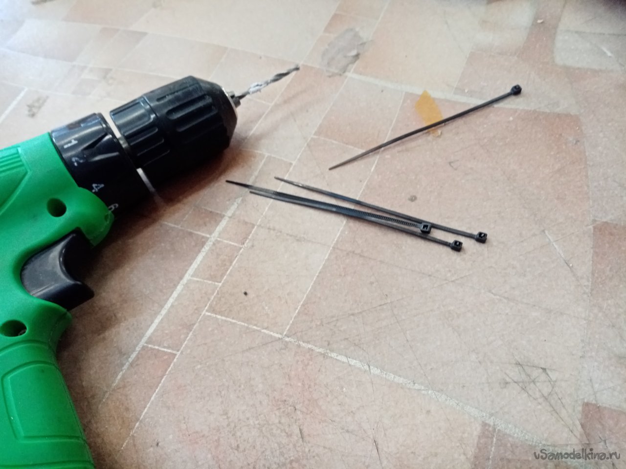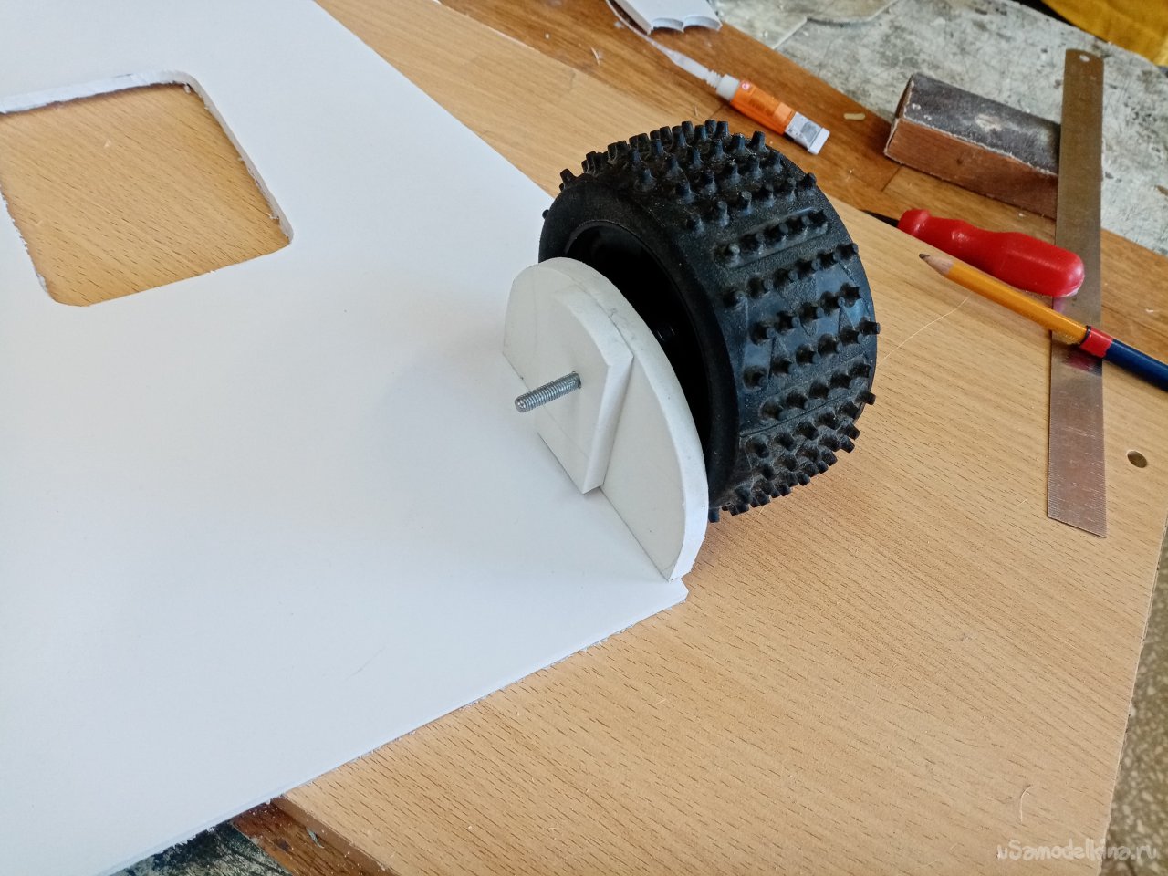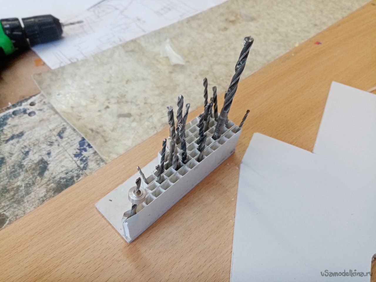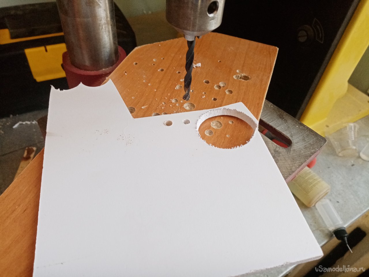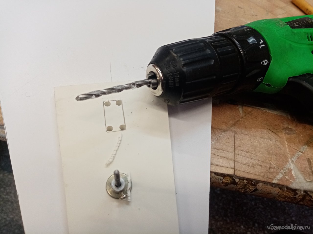 Нужно отверстие под ось основных колес. Выбираю подходящего диаметра сверло. Для гарантии организую контрольное отверстие. И примеряю по месту.