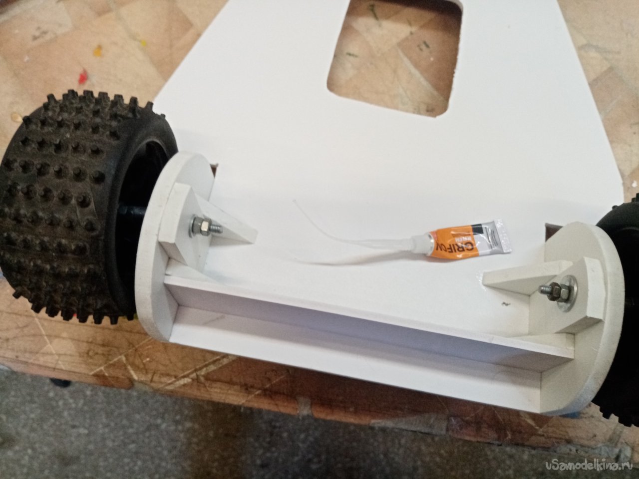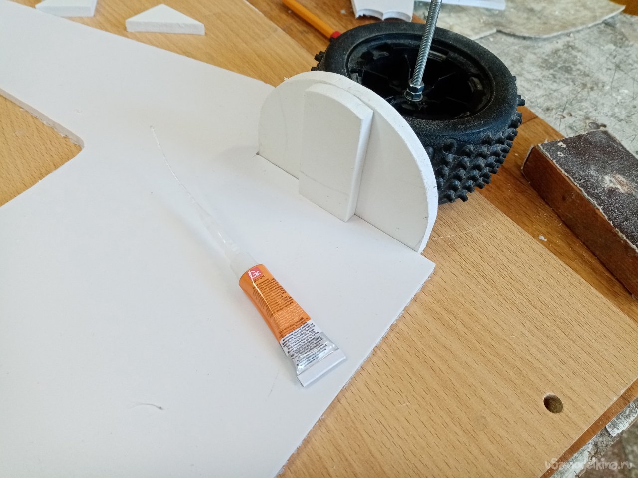 Немного поправляю вырезанные детали при помощи самодельного утюжка со шкуркой. Можно собирать конструкцию крепления основных колес. Некоторые детали склеиваю при помощи циакрина и помещаю под пресс. Примеряю по месту. Затем сверлю отверстия под оси колес и окончательно приклеиваю на место.