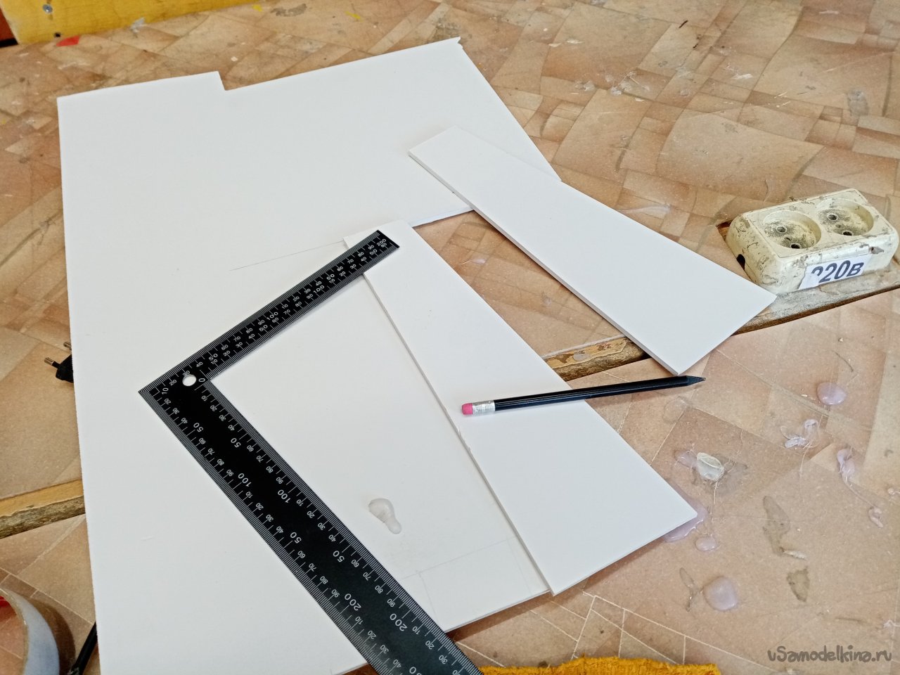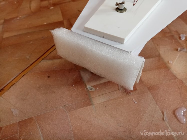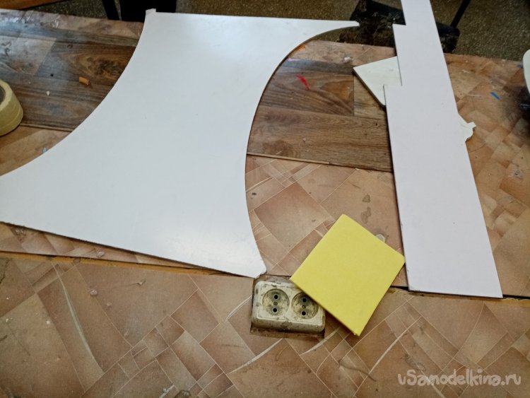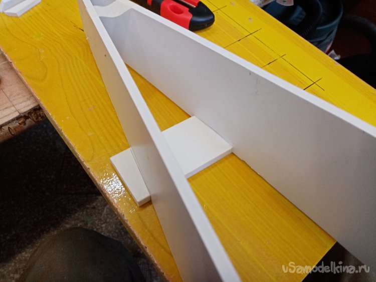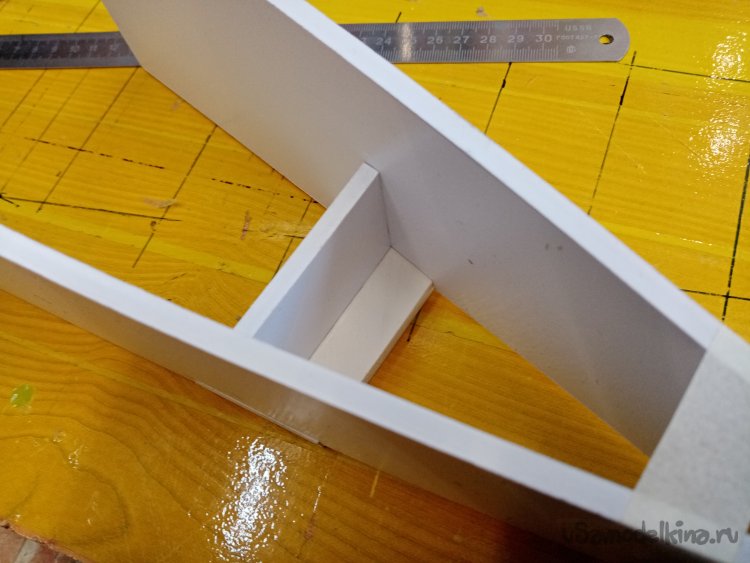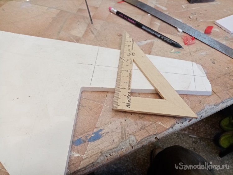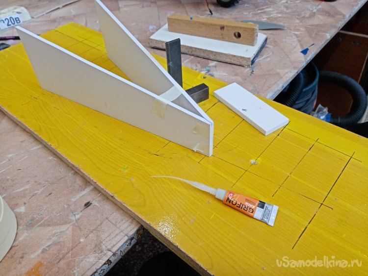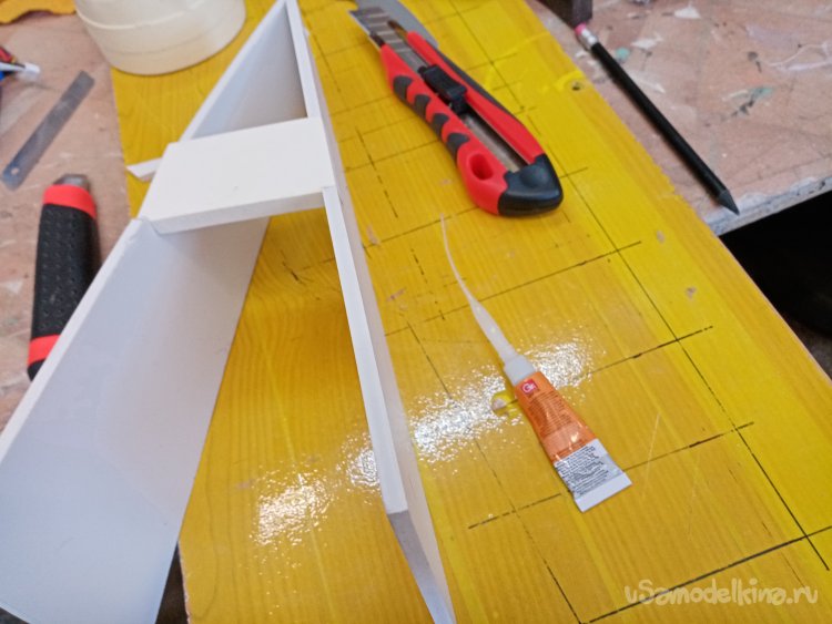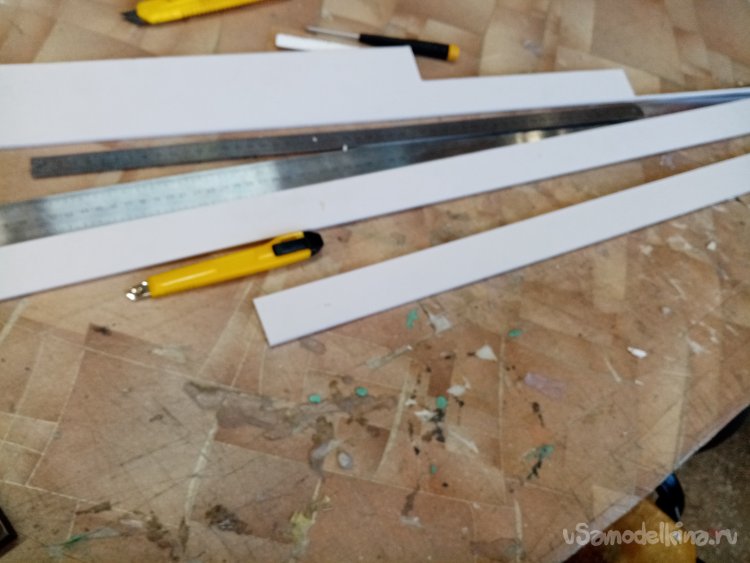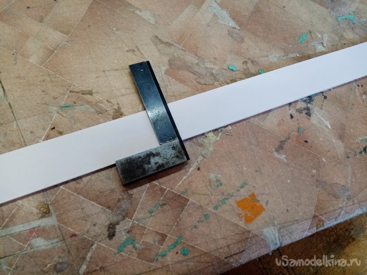 Так, что имею. Платформа из 5 мм пластика прогибается немного. Начинаю укреплять. Вырезаю ножом полоски укрепления из пластика в 5 мм. Кончики подгоняю под вертикаль при помощи угольника. Примеряю по месту и отрезаю как нужно. Приклеиваю на место.