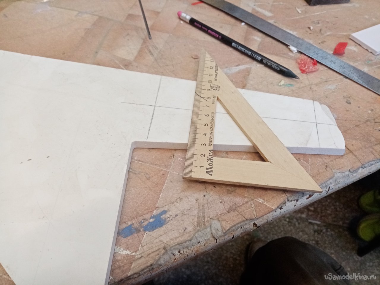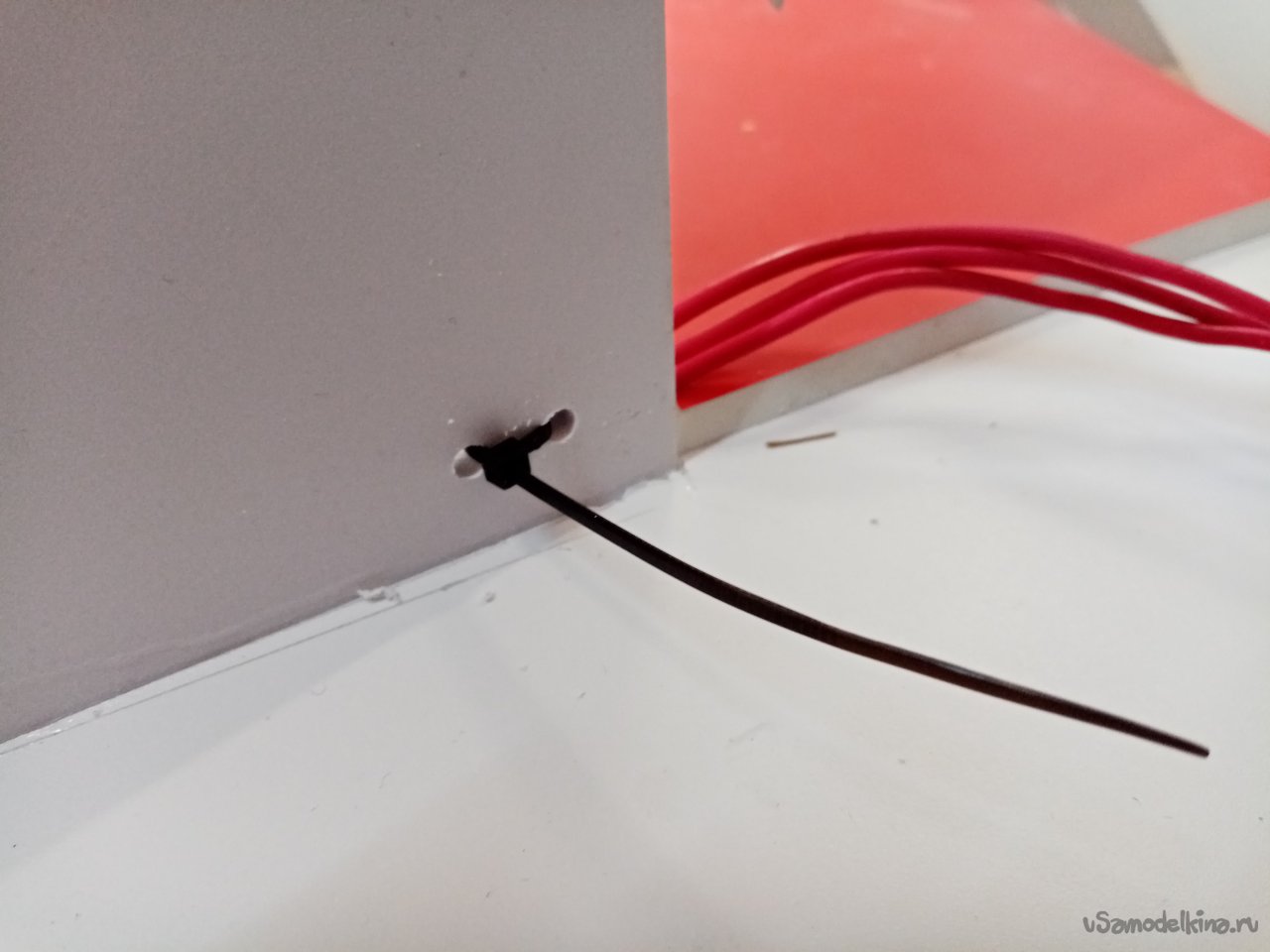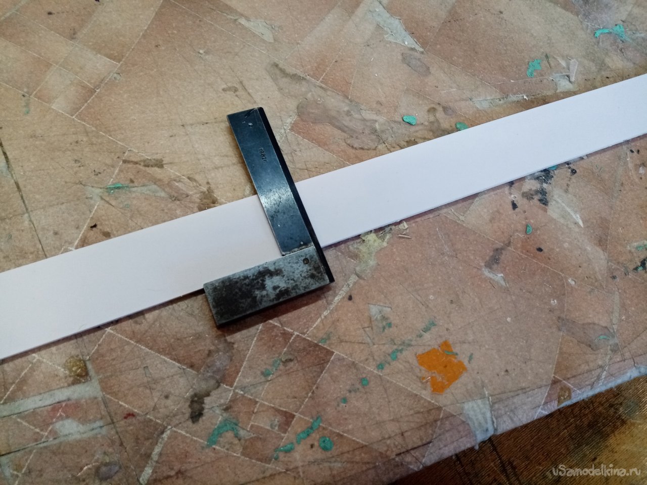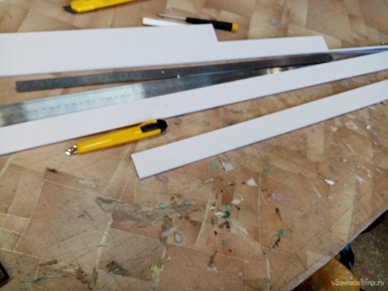 Так, что имею. Платформа из 5 мм пластика прогибается немного. Начинаю укреплять. Вырезаю ножом полоски укрепления из пластика в 5 мм. Кончики подгоняю под вертикаль при помощи угольника. Примеряю по месту и отрезаю как нужно. Приклеиваю на место.