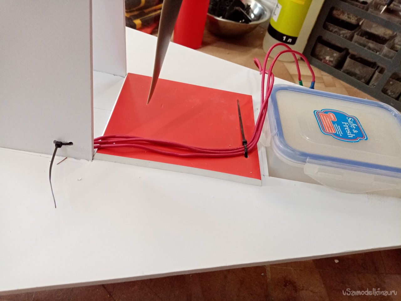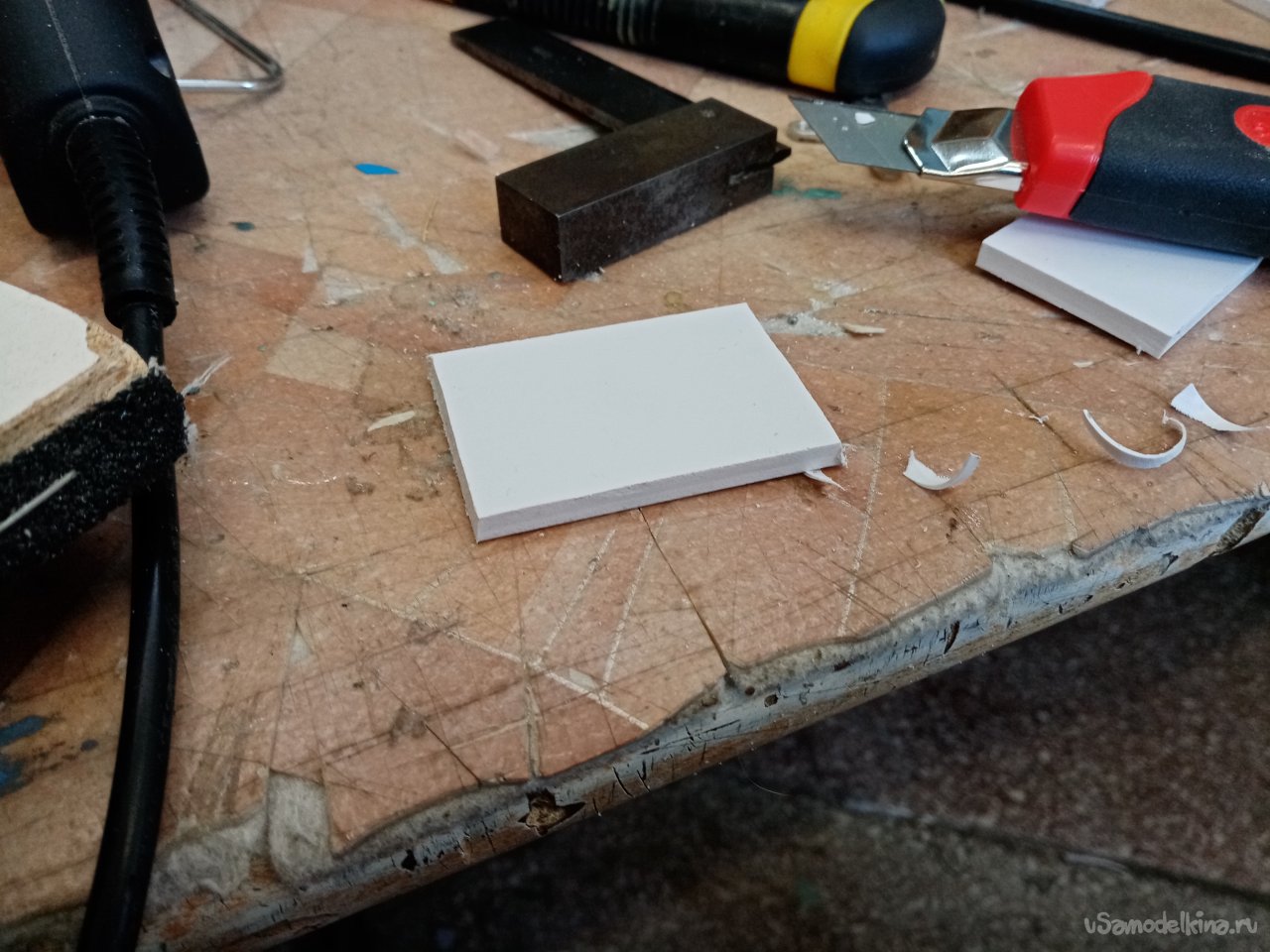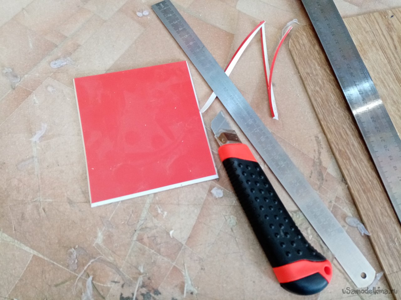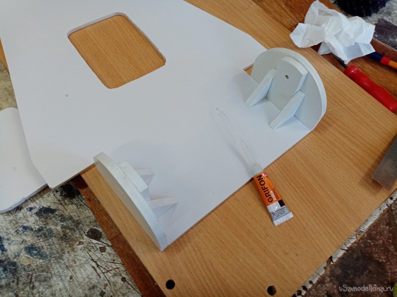 Так, что имею. Платформа из 5 мм пластика прогибается немного. Начинаю укреплять. Вырезаю ножом полоски укрепления из пластика в 5 мм. Кончики подгоняю под вертикаль при помощи угольника. Примеряю по месту и отрезаю как нужно. Приклеиваю на место.