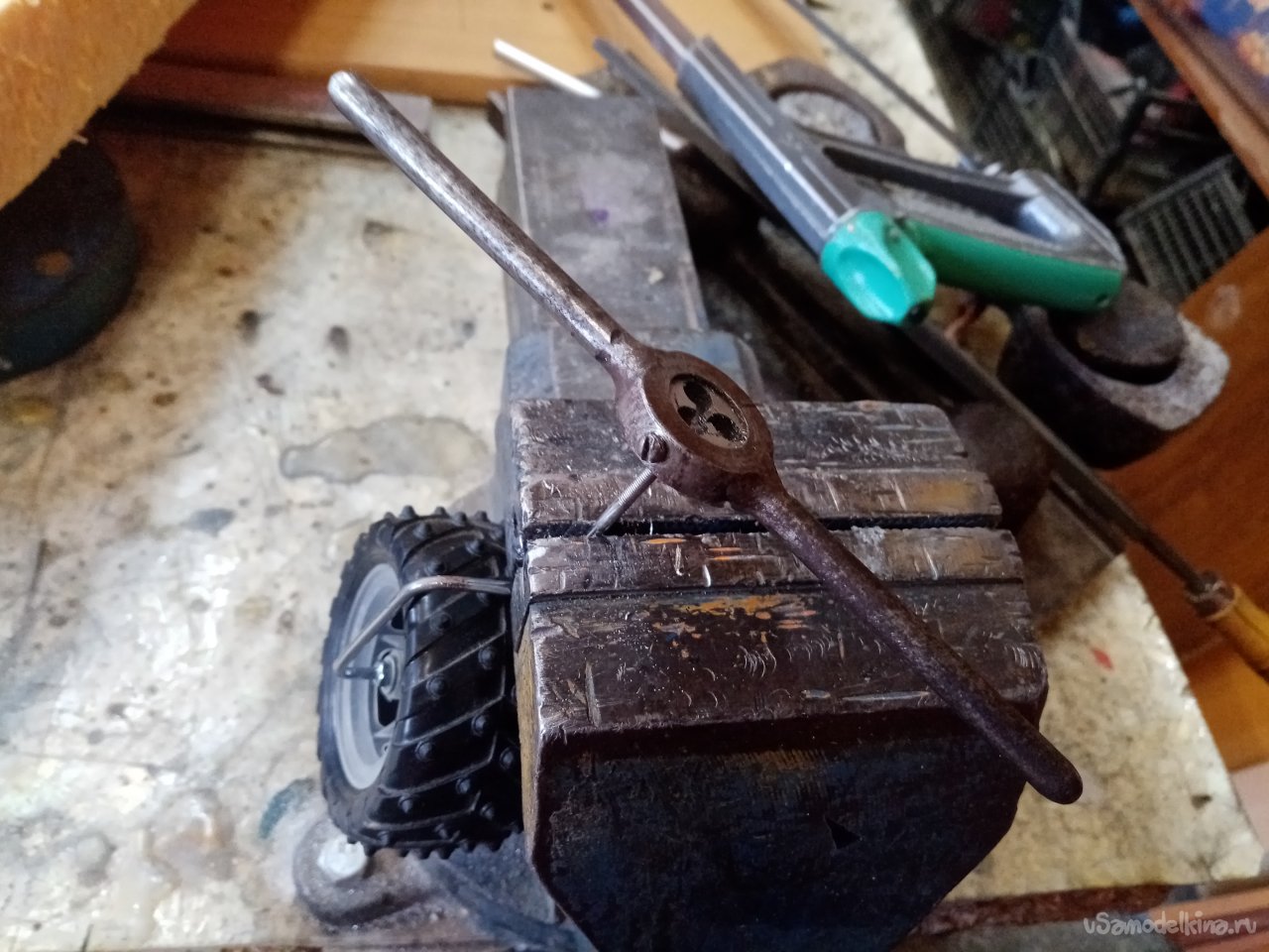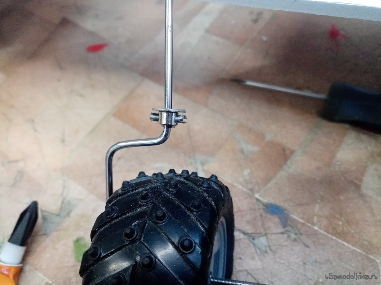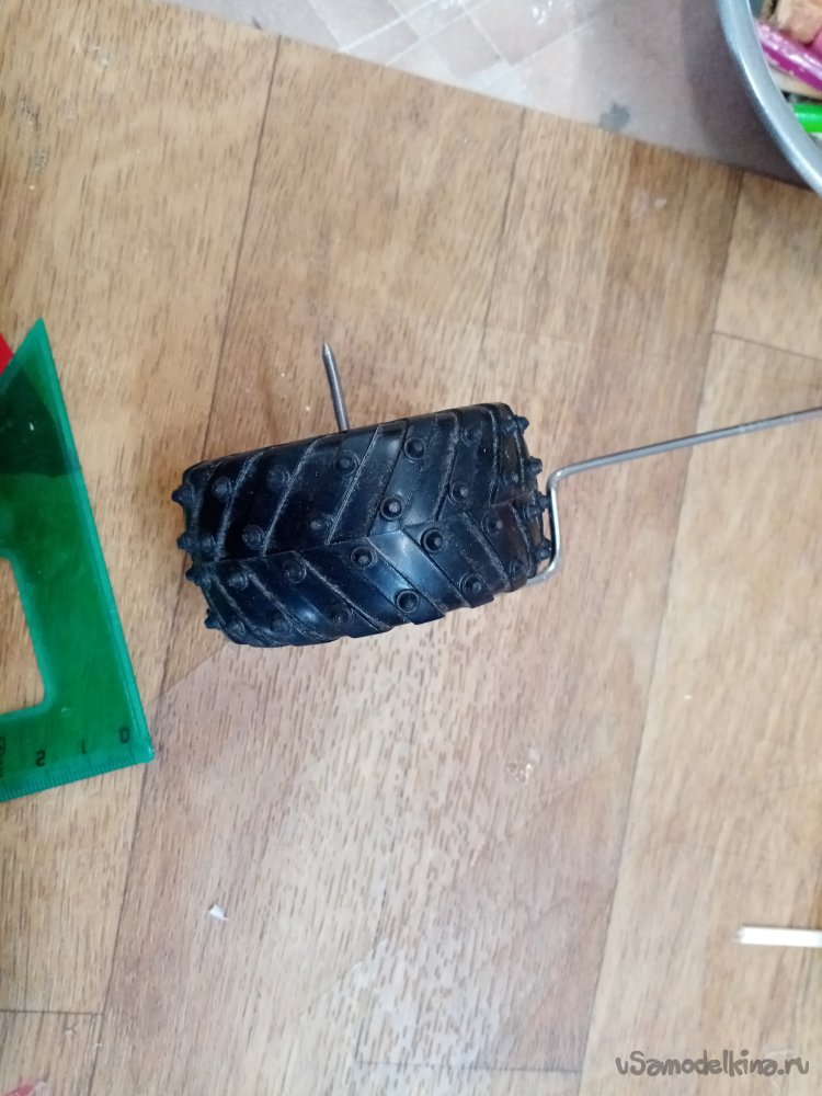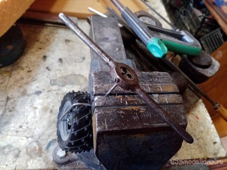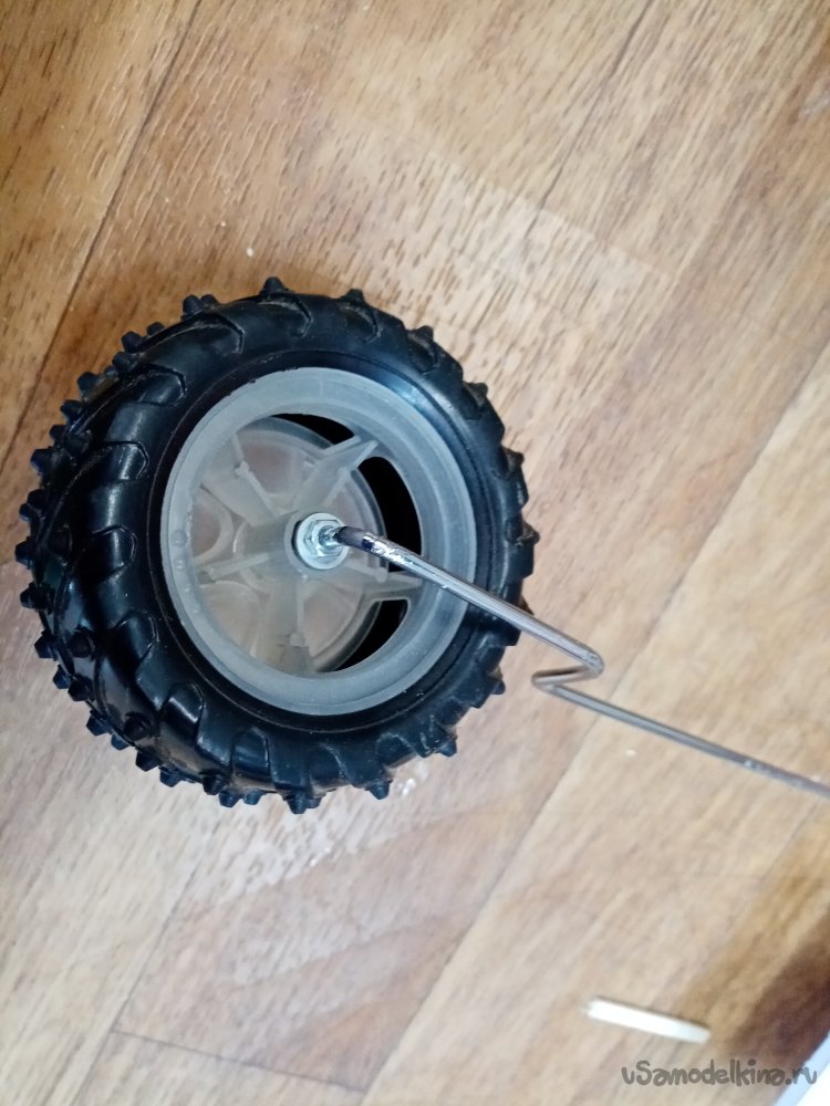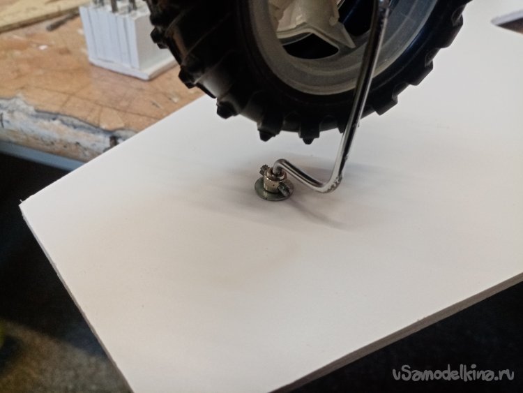 Но пока думаю, как изготовить подвеску переднего колеса управления. Из хромированного прутика выгибаю нужную конструкцию. Предварительно нарезав резьбу на кончике. Для фиксации колеса.