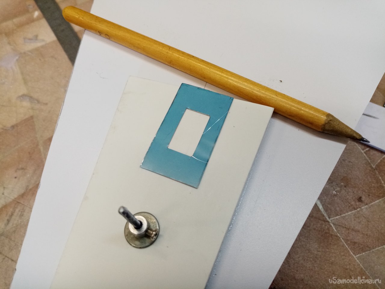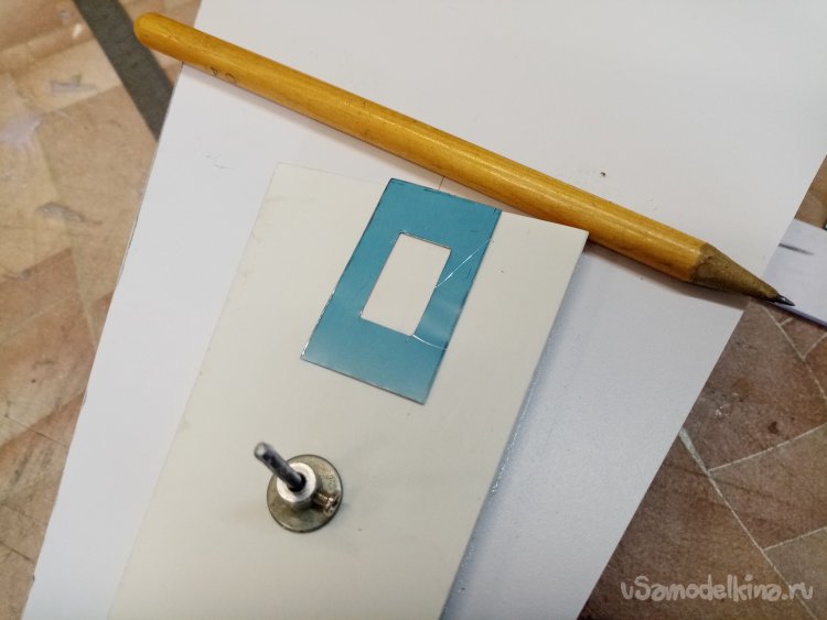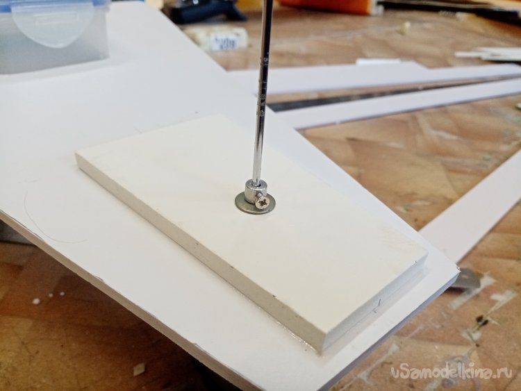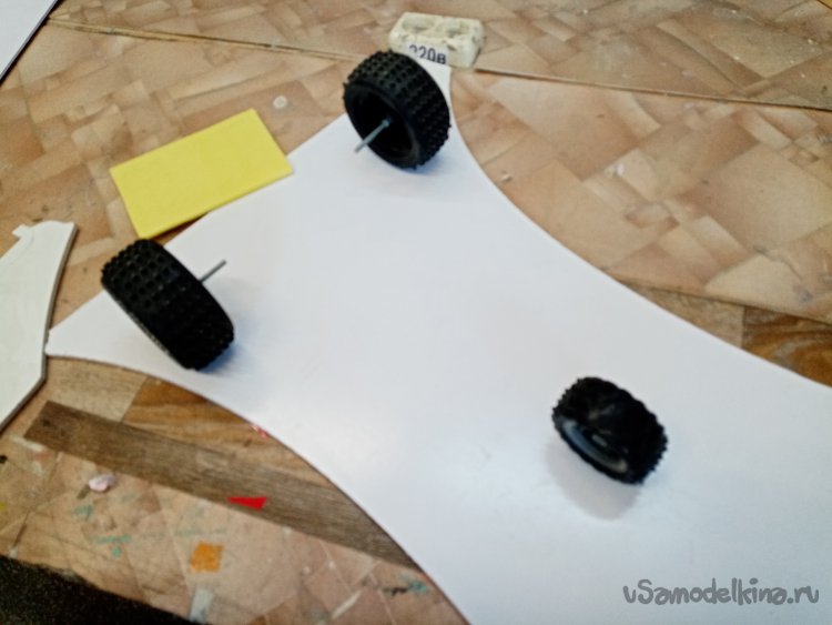 На кусочке пластика размечаю положение шасси. Сомнения появились. Поэтому из картона изготовил несколько вариантов платформы. Путем «инженерного тыка» выбираю более реальное расположение элементов.
