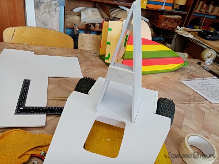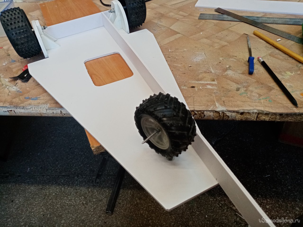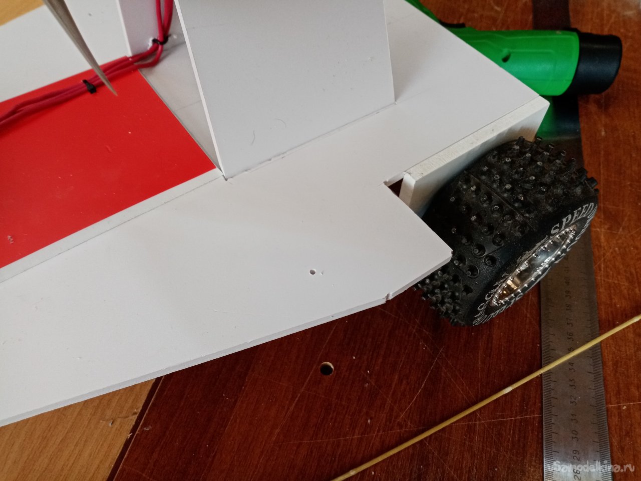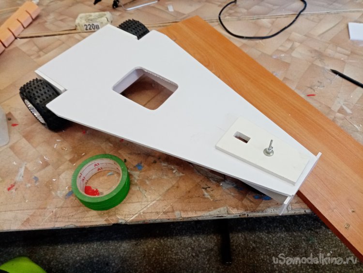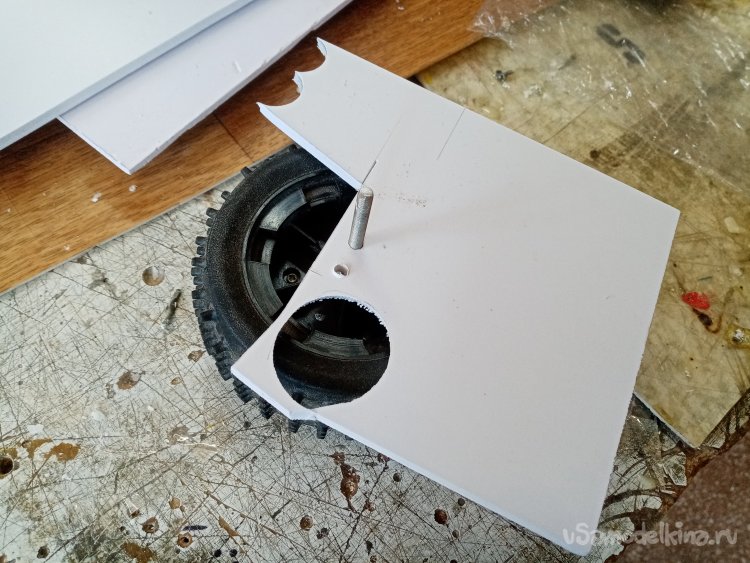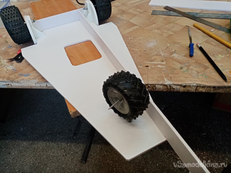 По ширине моторамы выбираю в стенках паз на нужном расстоянии от основания. Чтобы винт не цеплял платформу. С небольшим наклоном вперед. В процессе работы поток от винта будет немного прижимать переднее колесо. В паз вставляю мотораму, промеряю, расстояние и ненужное отрезаю.