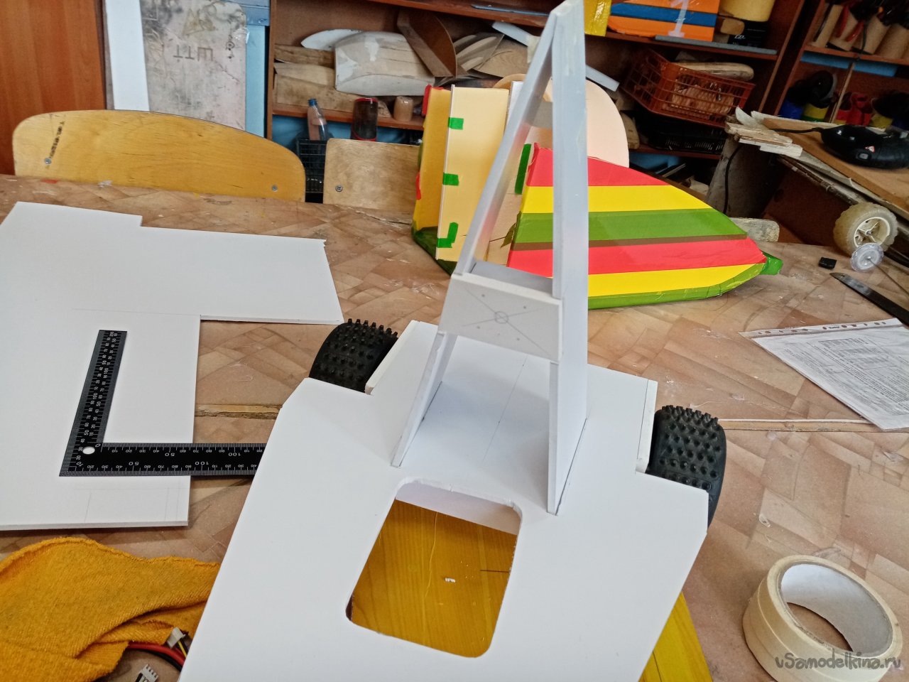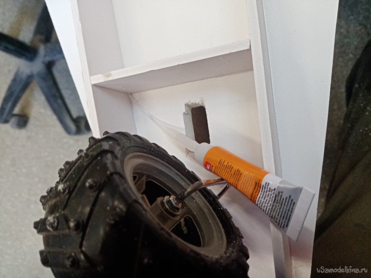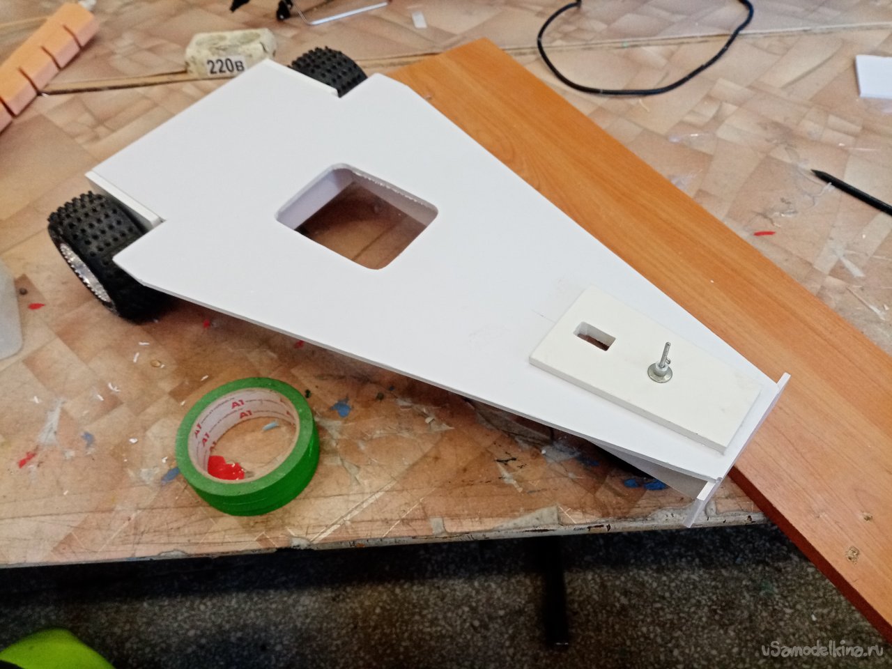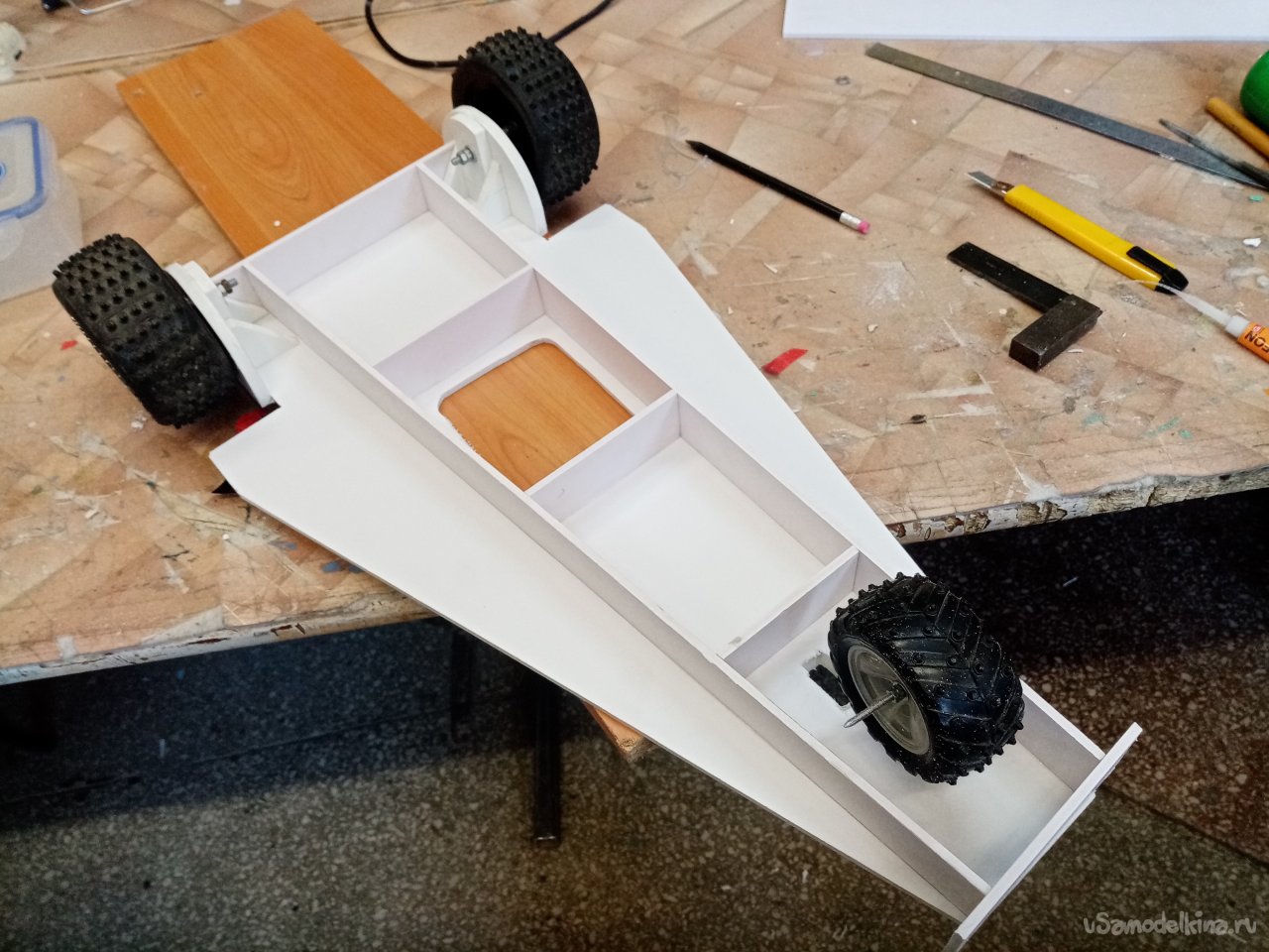 По ширине моторамы выбираю в стенках паз на нужном расстоянии от основания. Чтобы винт не цеплял платформу. С небольшим наклоном вперед. В процессе работы поток от винта будет немного прижимать переднее колесо. В паз вставляю мотораму, промеряю, расстояние и ненужное отрезаю.