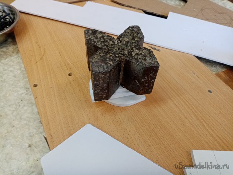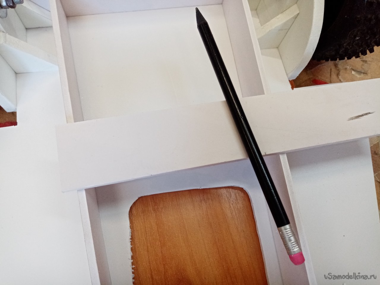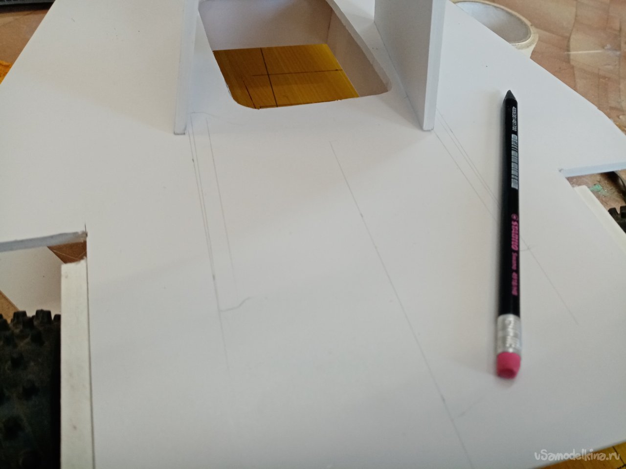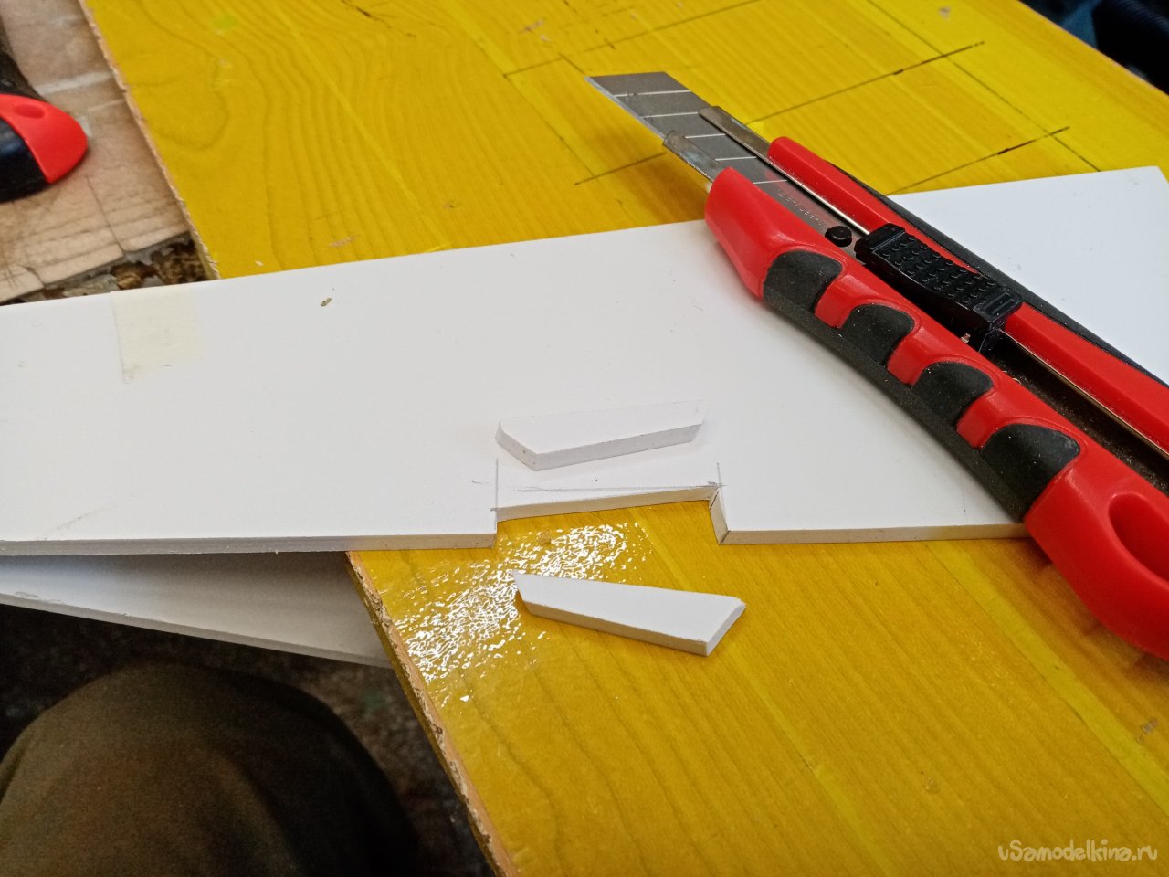 Готовую конструкцию нужно установит на платформу. Примеряю положение ножек по месту. Размечаю положение пазов и прорезаю их под нужным углом при помощи треугольного ножа для творчества. Немного поправляю большим ножом. Все готово. Можно собирать.