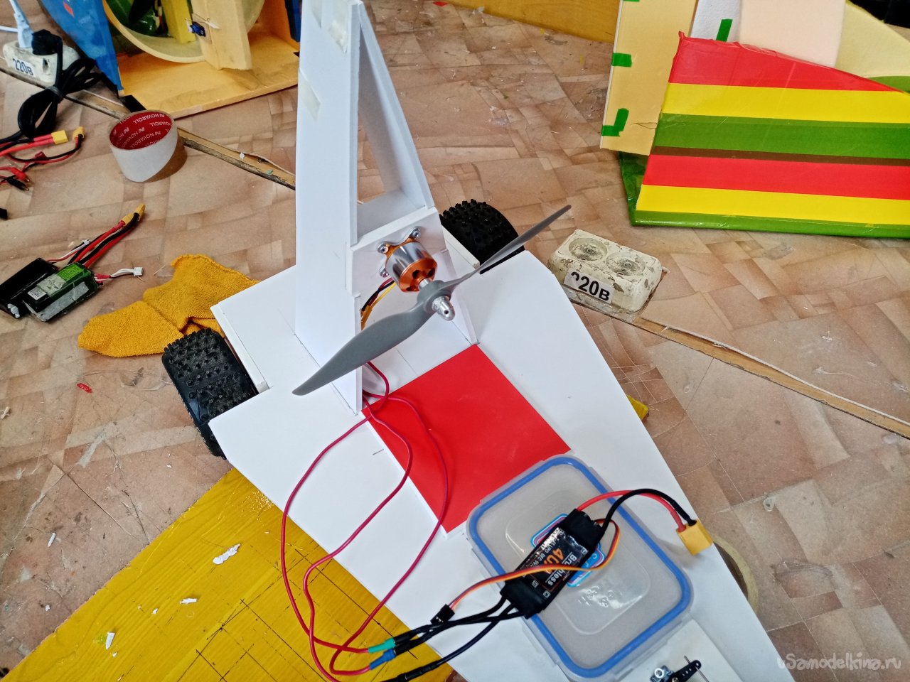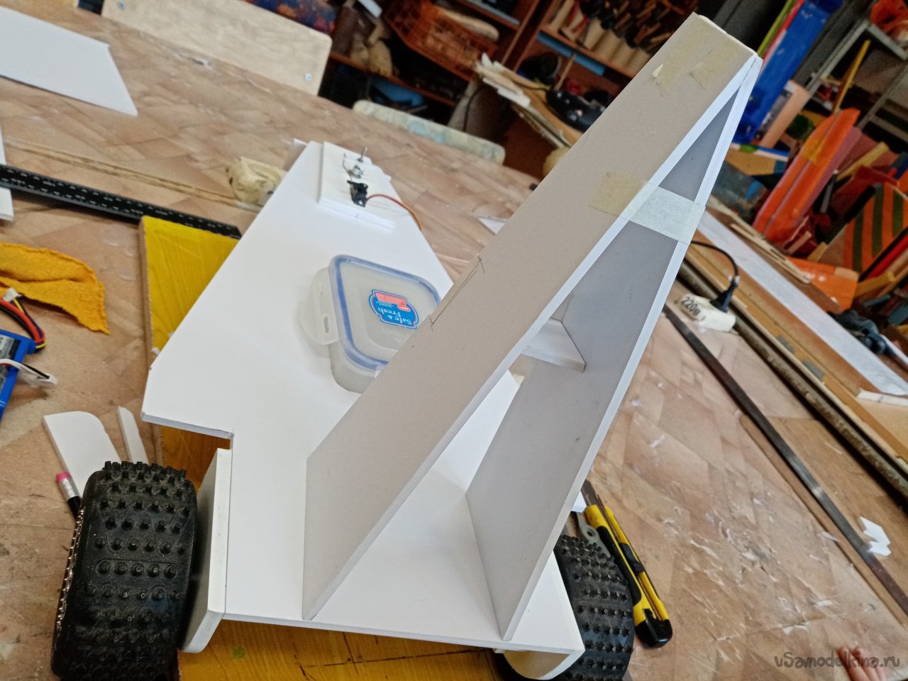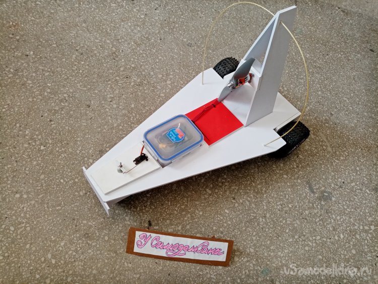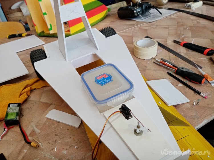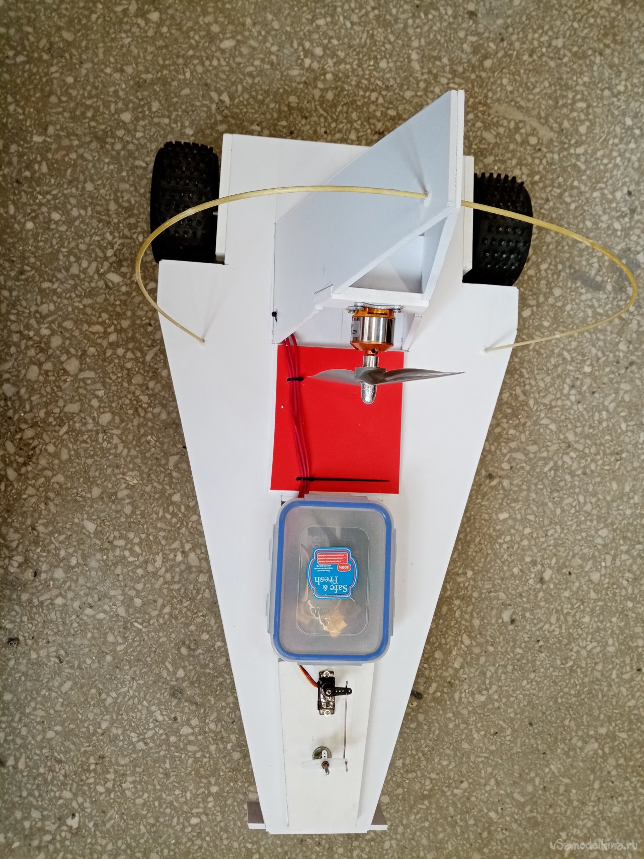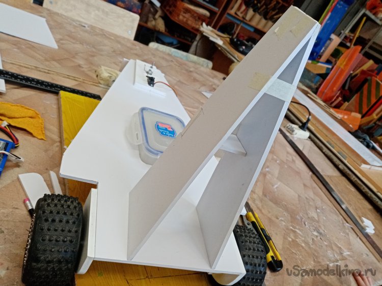 Мне нравится такой процесс творчества, прямо в момент сборки пробной конструкции. Вот и пришла мысль нагрузить еще переднее колесо. Поэтому передвигаю контейнер с аппаратурой ближе к передней части. В контейнере лежит и аккумулятор. Тоже тяжеленькая деталь. Дополнительно будет еще и усилие прижима от наклоненного винта. Что улучшит управление.