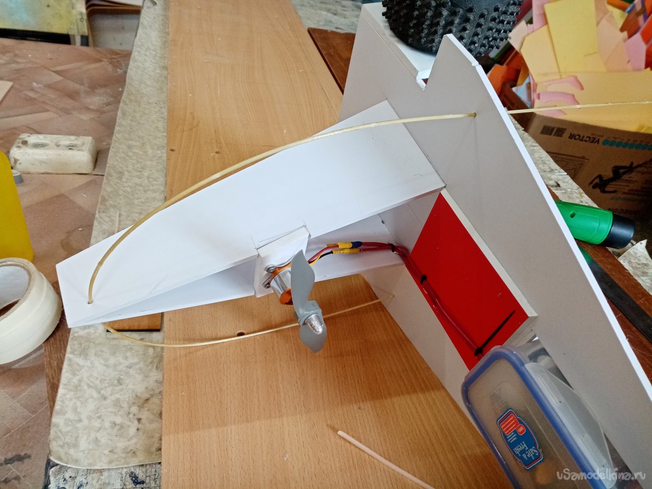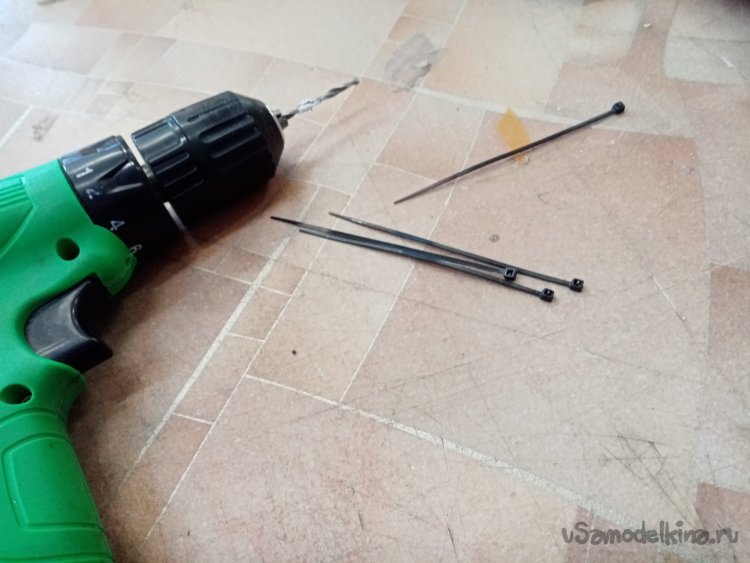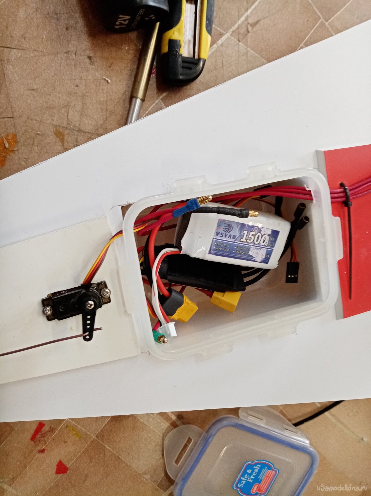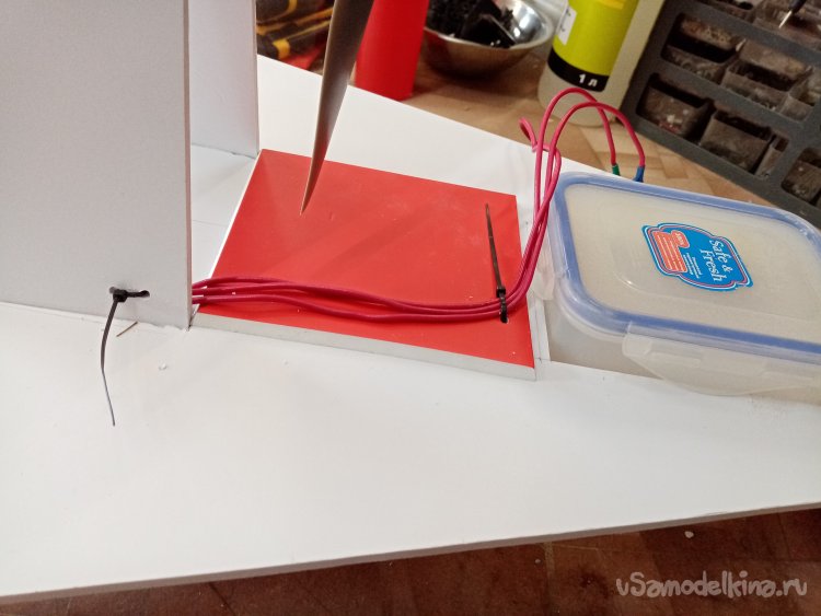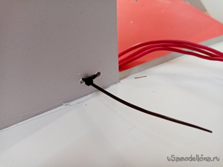 Проводов управления хватает до изменившего положение контейнера. но силовые провода на двигатель нужно удлинить. Проблема не большая из провода достаточного сечения паяю удлинители. Нужно закрепить провода на верхней палубе конструкции, чтобы не попали под винт. Небольшими стяжками решаю задачу. Сверлю отверстия и креплю все.