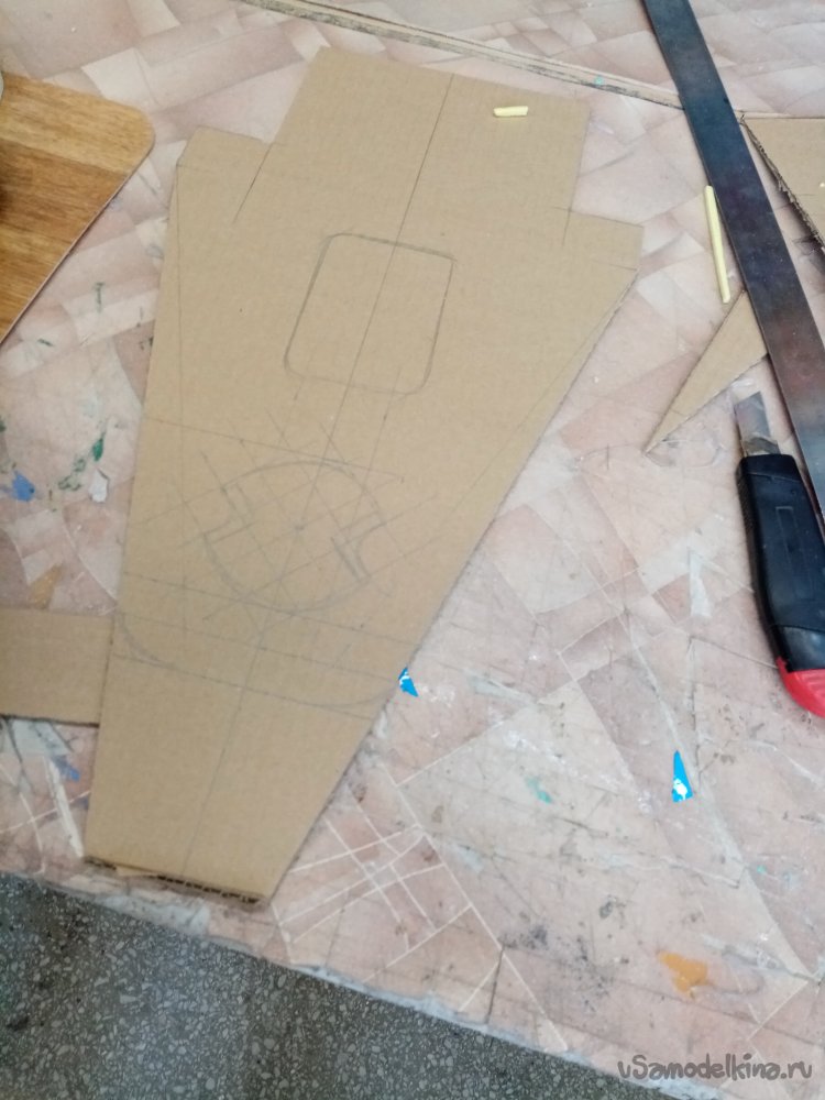 По утвержденному шаблону из картона вырезаю платформу. И отверстие для установки контейнера с элементами управления и электроникой.