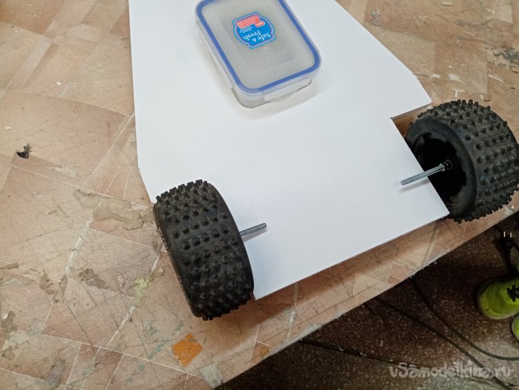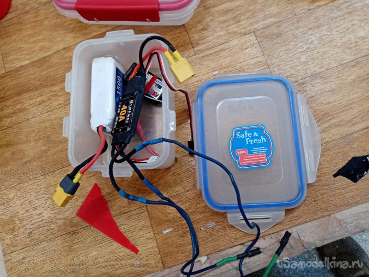 В боку контейнера сверлю отверстия для проводов и собираю в кучу се провода управления. Размещаю в контейнере все части управления и аккумулятор. Конструкция готова к покатушкам.