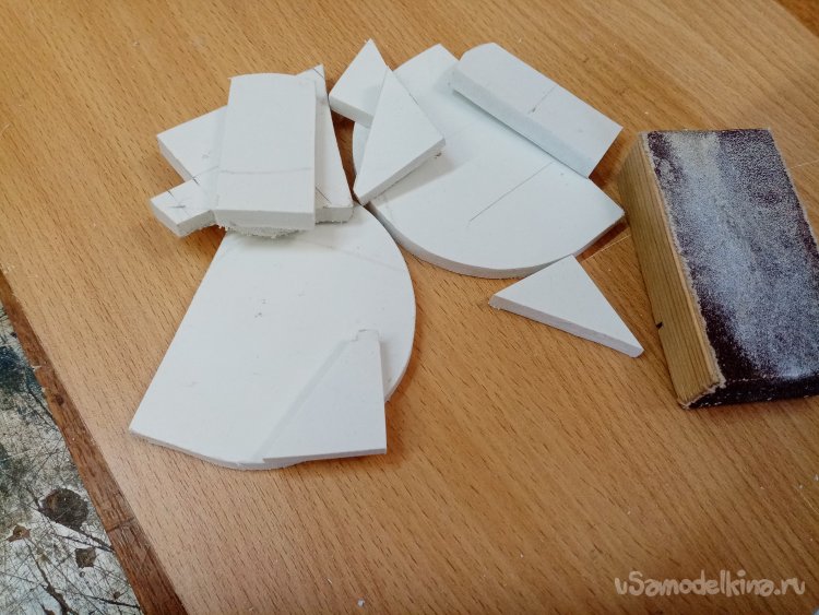 Для платформы выбираю рекламный пластик толщиной в 5мм. Подарили обрезки в рекламной компании. Даром, все равно на выброс. Разложил кусочки на столе. Реализую задумку исходя из размера самого большого куска пластика.
