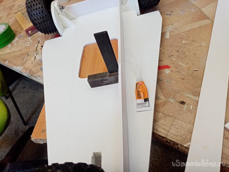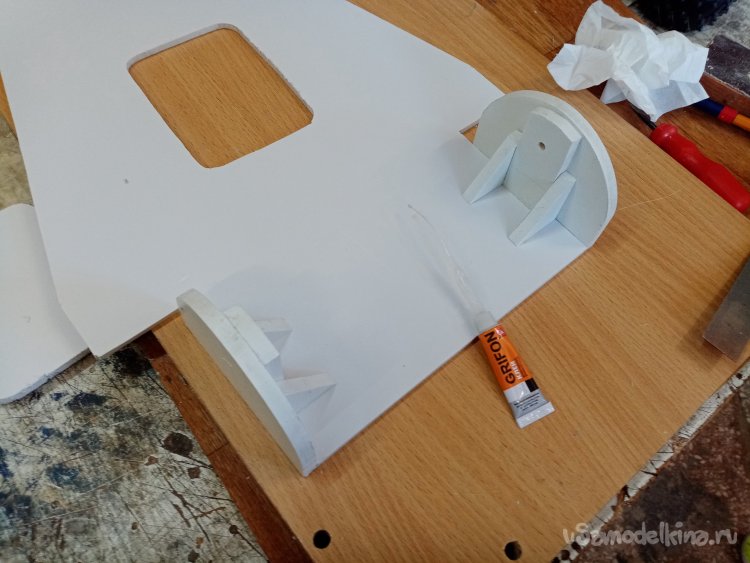 В носовой части есть желание увеличить толщину пластика в месте прохождения оси переднего колеса. Вырезаю из подходящего кусочка еще одну площадку и приклеиваю на место при помощи циакрина.