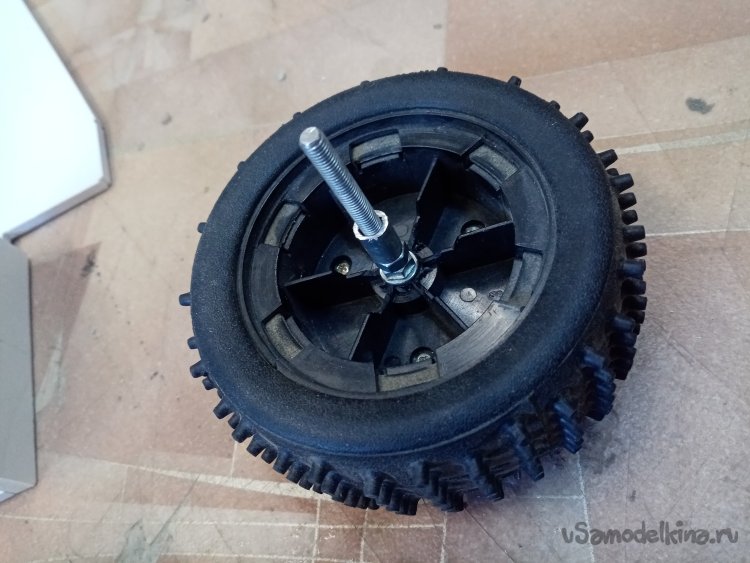 Подобрал нужного диаметра болтик в качестве осей и гаечки. Но к сожалению нет гаек с фиксацией. Буду придумывать в дальнейшем. И так три колеса готовы к работе.