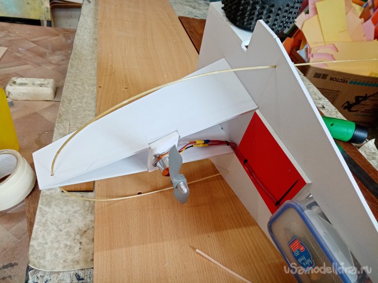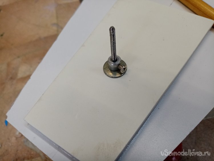 Заднее отверстие закрываю красивой пластиковой крышечкой. На стойке закрепляю мотор с винтом.