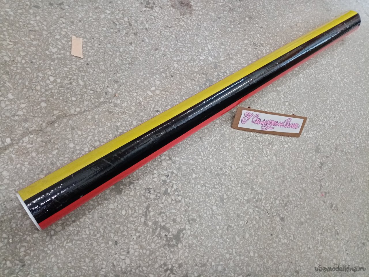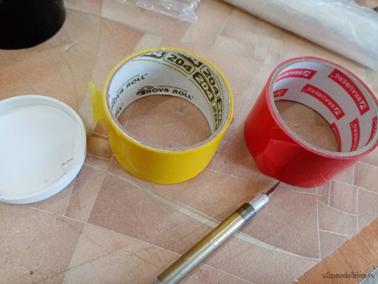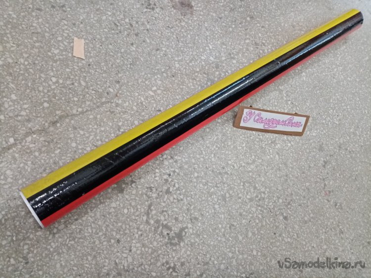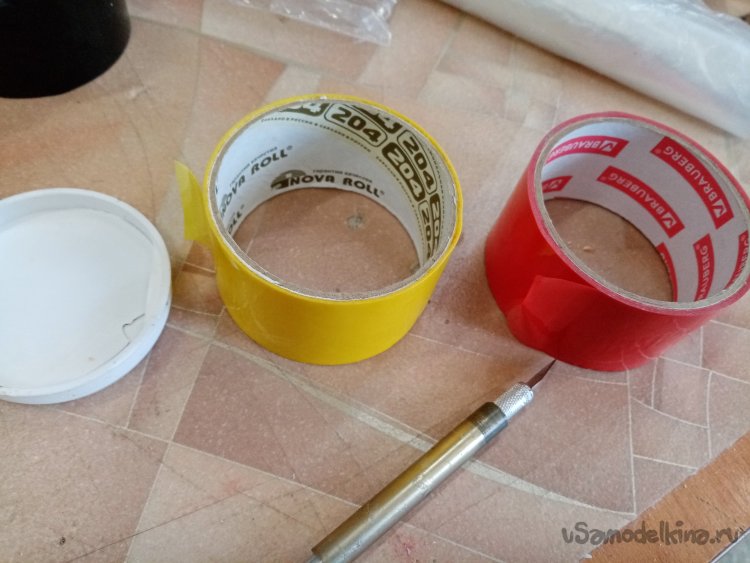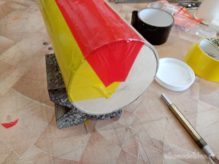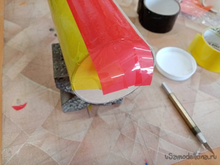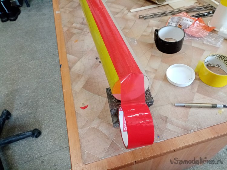 Оклейку произвожу вдоль конструкции. Технология достаточно проста. Приклеиваю один конец скотча к краю заготовки и затем разматываю рулон на нужную длину. Слегка натягивая, прикладываю полосу к поверхности и приклеиваю её в районе дна. Затем приглаживаю к поверхности и отрезаю край с припуском. Полоску разрезаю на три части ножом, приклеиваю к днищу. Также поступаю с передним концом скотча. Только приклеиваю через край вовнутрь трубы.
