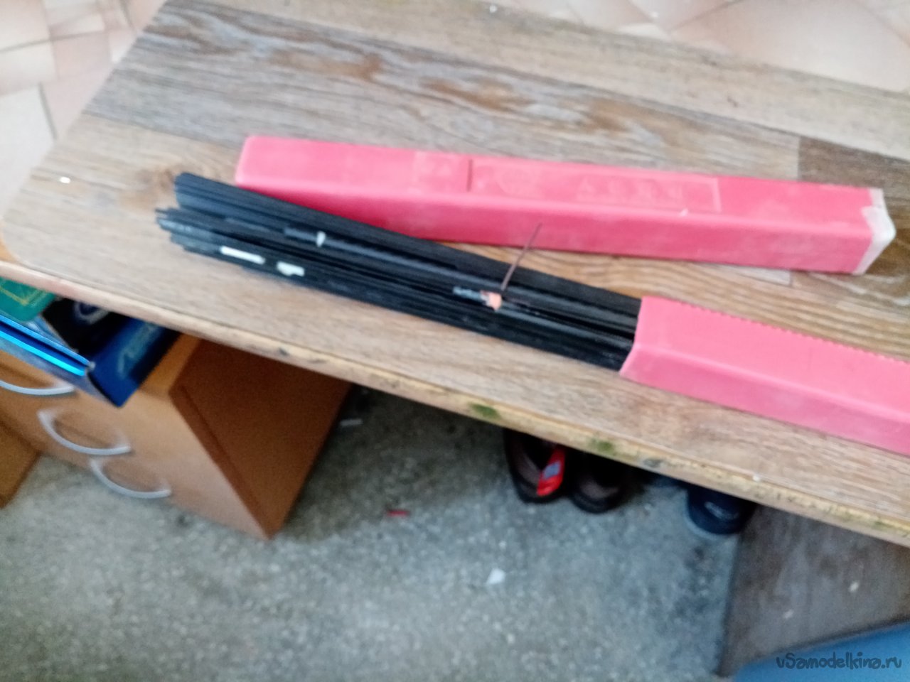 Процесс завершен, можно загружать пенал. Из разных уголков извлекаю карбоновые прутики, трубочки и планки. Практически все заготовки погонажа вошли в новый пенал.