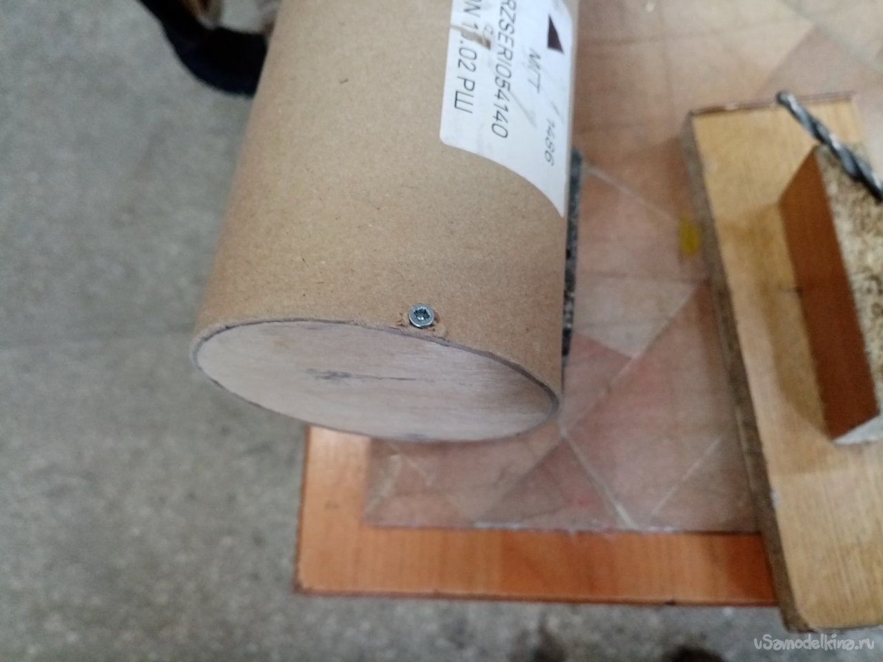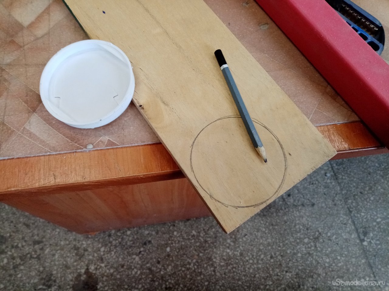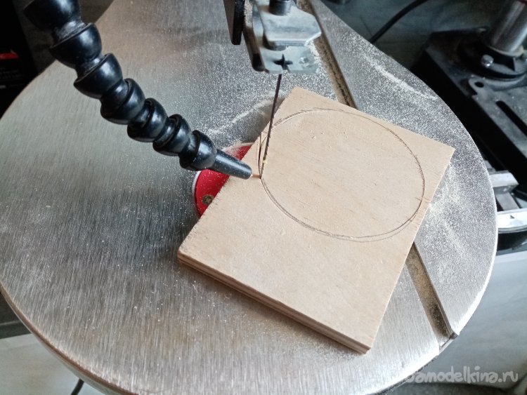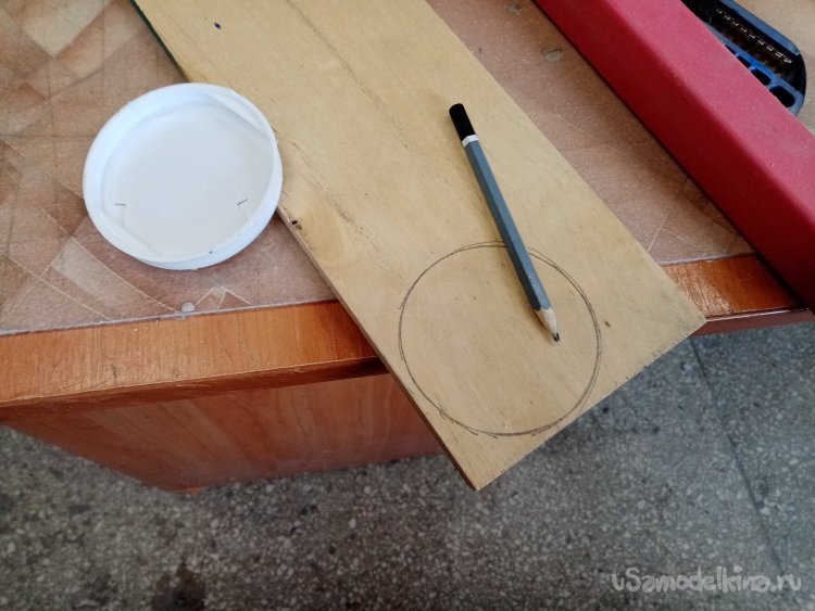 Дно сделаю из толстой фанеры. Кусочек нашелся закромах моделки. В качестве шаблона применяю пластиковую затычку. Обвожу по кругу и разметка окончена.