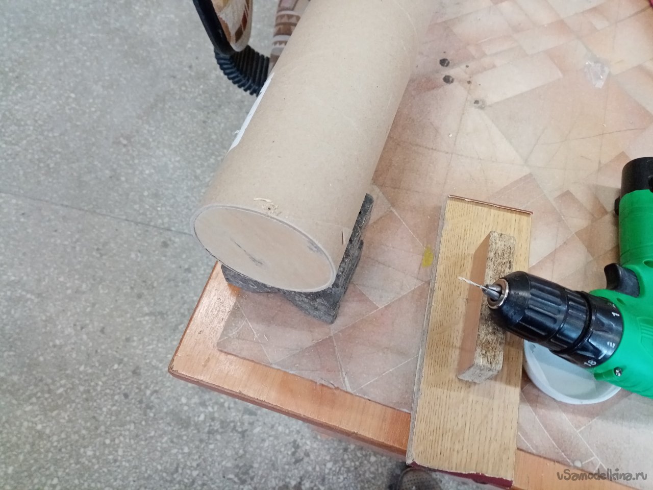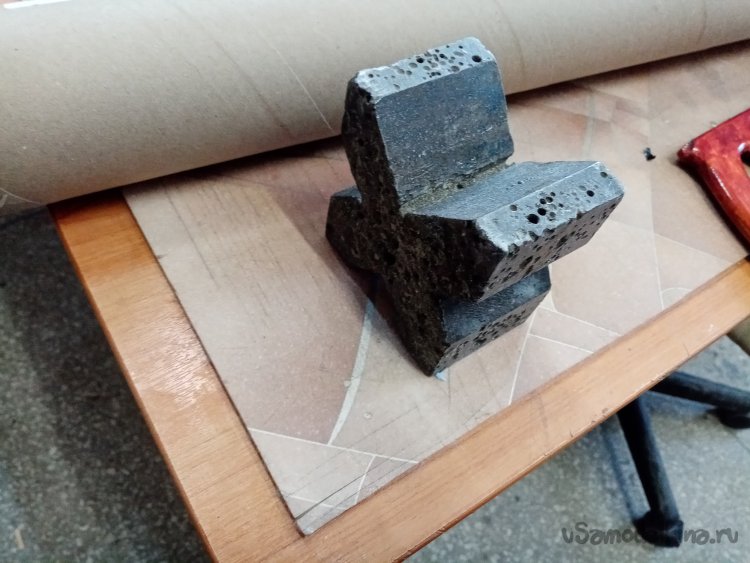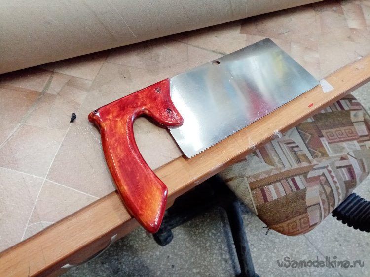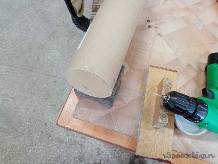 Чтобы заготовка не каталась по столу, её устанавливаю на крестик для трубок. Пилить картон вполне можно при помощи самодельной маленькой пилкой с мелкими зубьями.