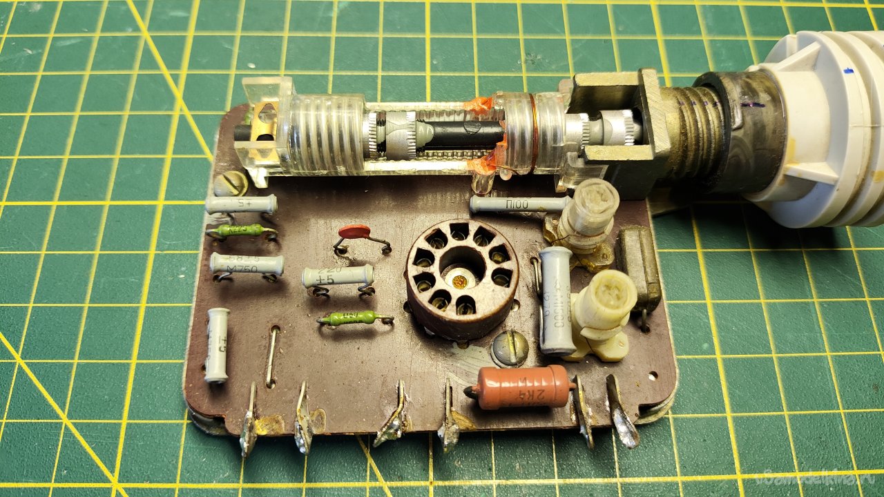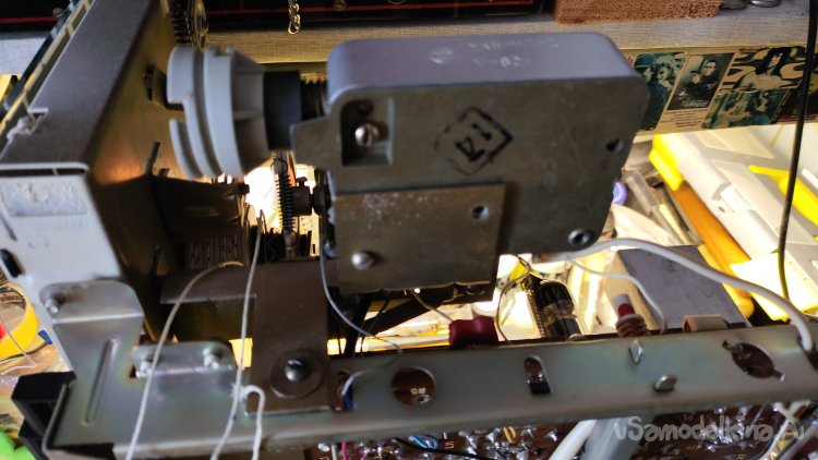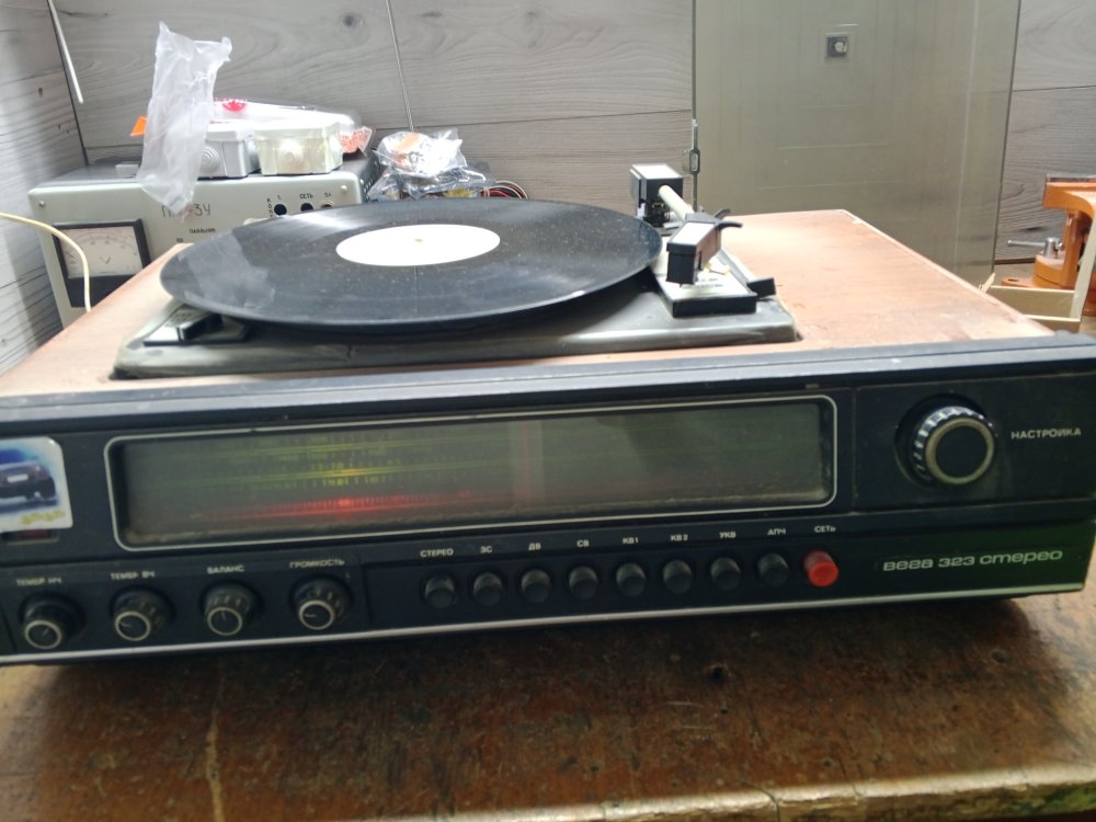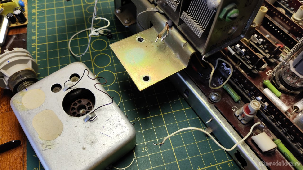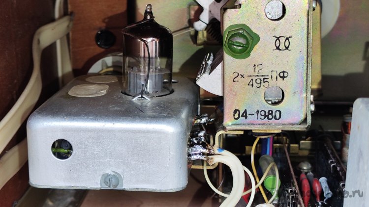 В ремонте старая советская радиола «Кантата-204». О ремонте и восстановлении радиолы будет отдельная большая статья, в которую физически не вмещается перестройка УКВ блока. Вот он на фото слева, закрытый алюминиевым экраном, блок с отверстием и лампой.