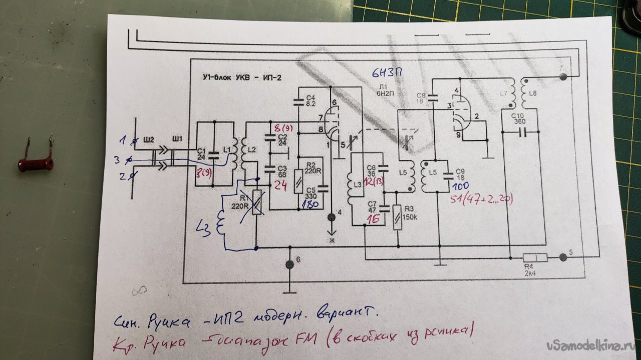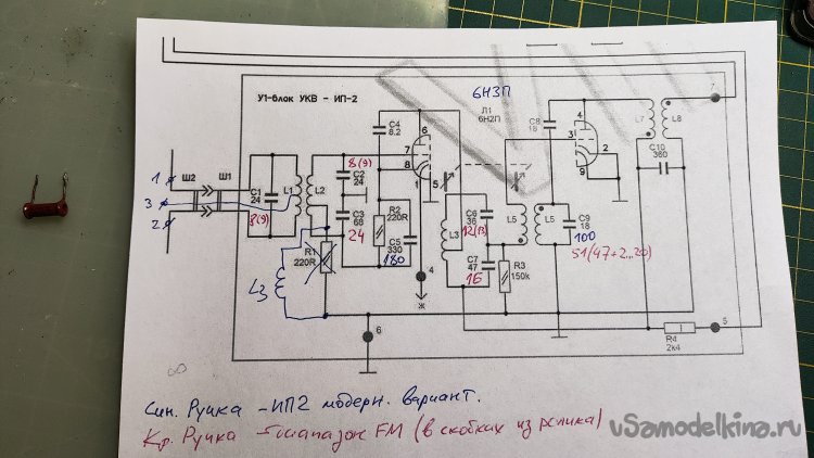 Напечатал схему блока УКВ ИП-2. Указал на ней отличия модернизированного варианта и номиналы конденсаторов из двух источников.