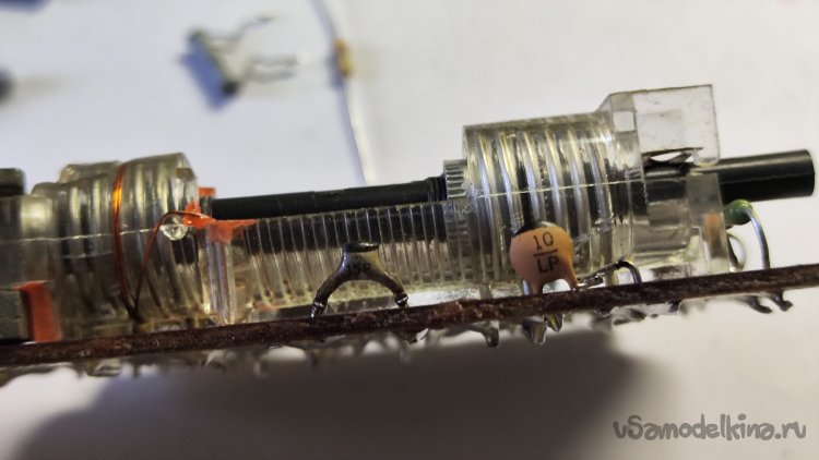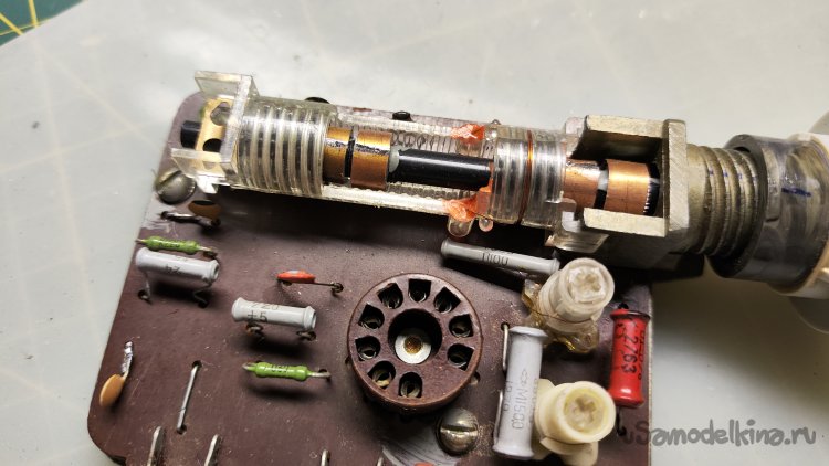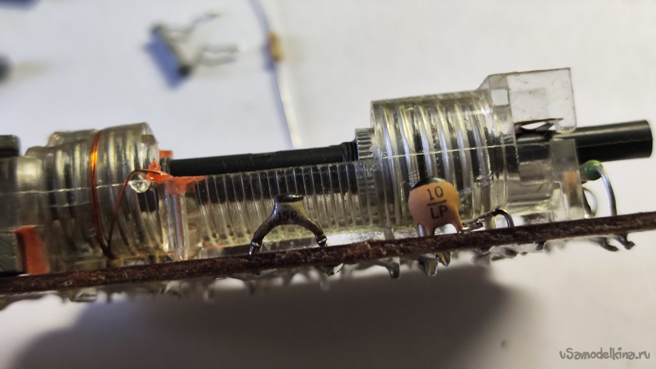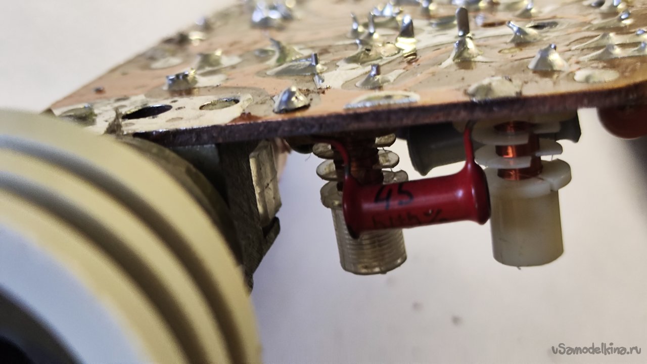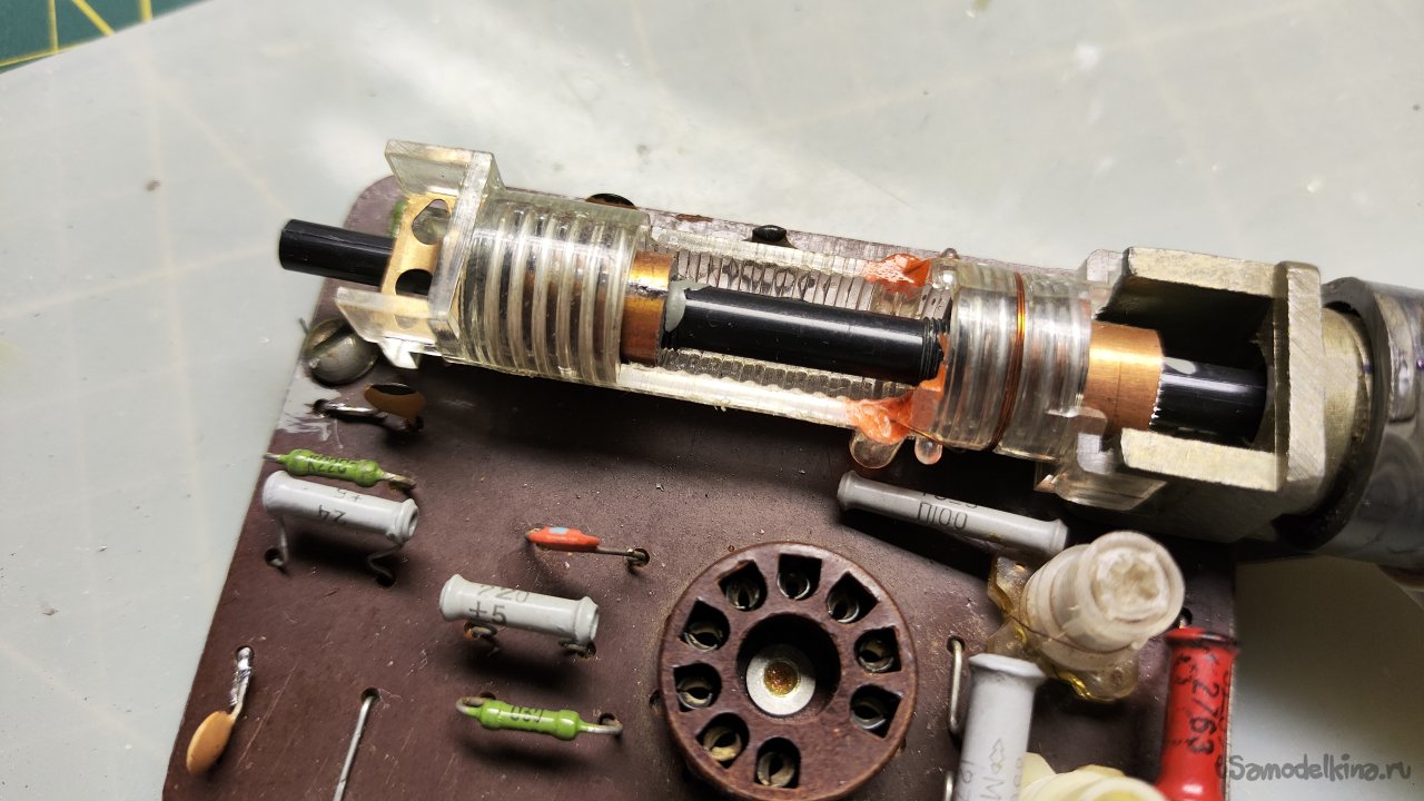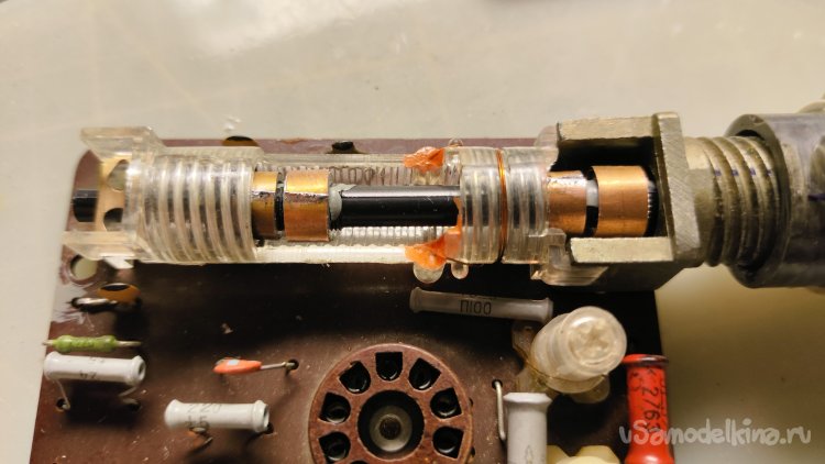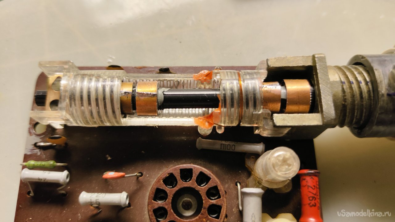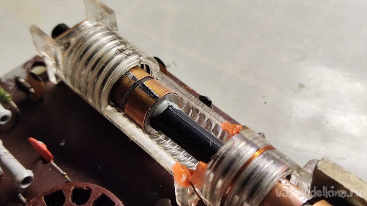 Ладно. Что можно сделать? Можно заменить сердечники вариометра на латунные. Идея такая себе, их где-то придется выточить, а потом как-то настроить все это дело без приборов. Если бы у вариометра было два сердечника, а лучше один... Но их четыре, они все разной длины и диаметра, стоят на оси по-разному.