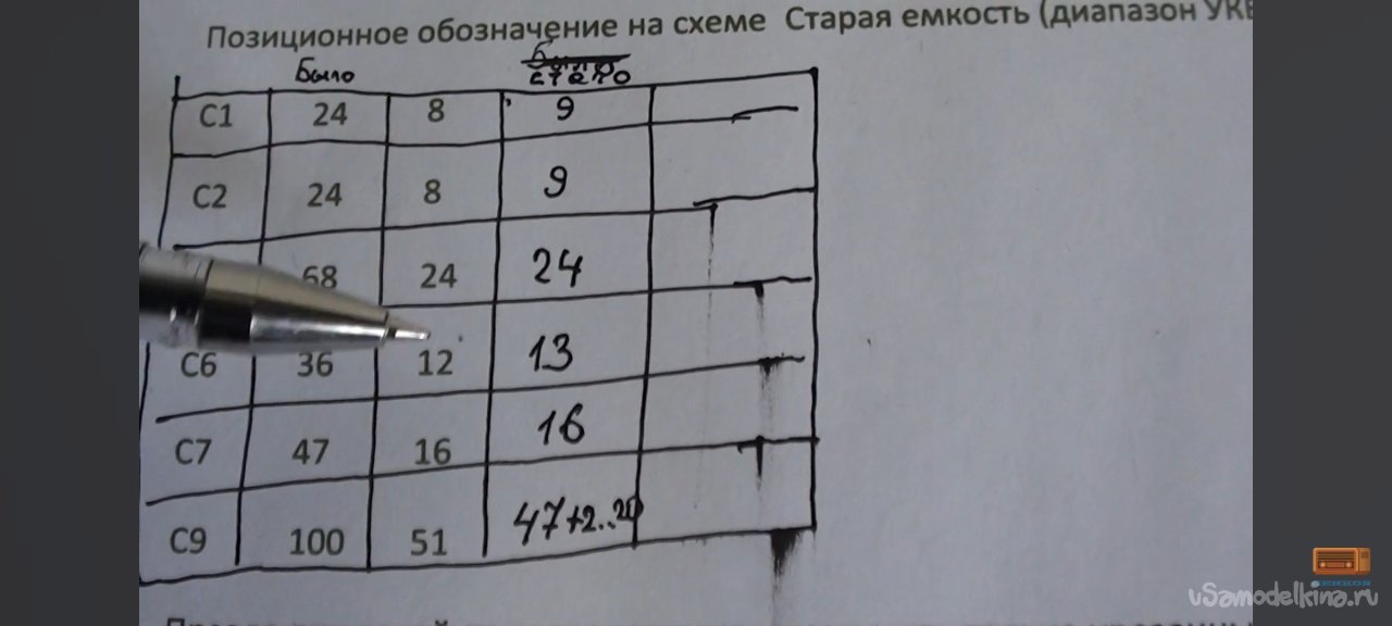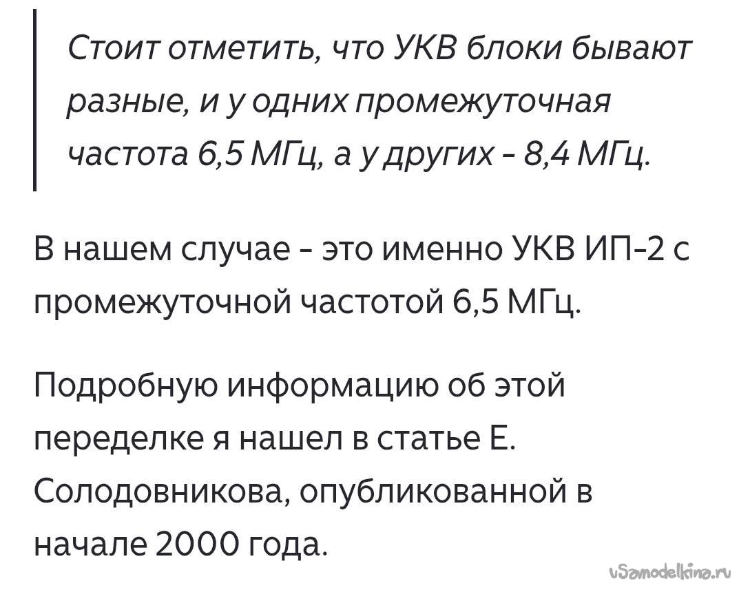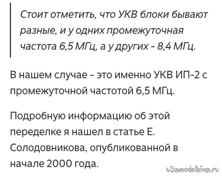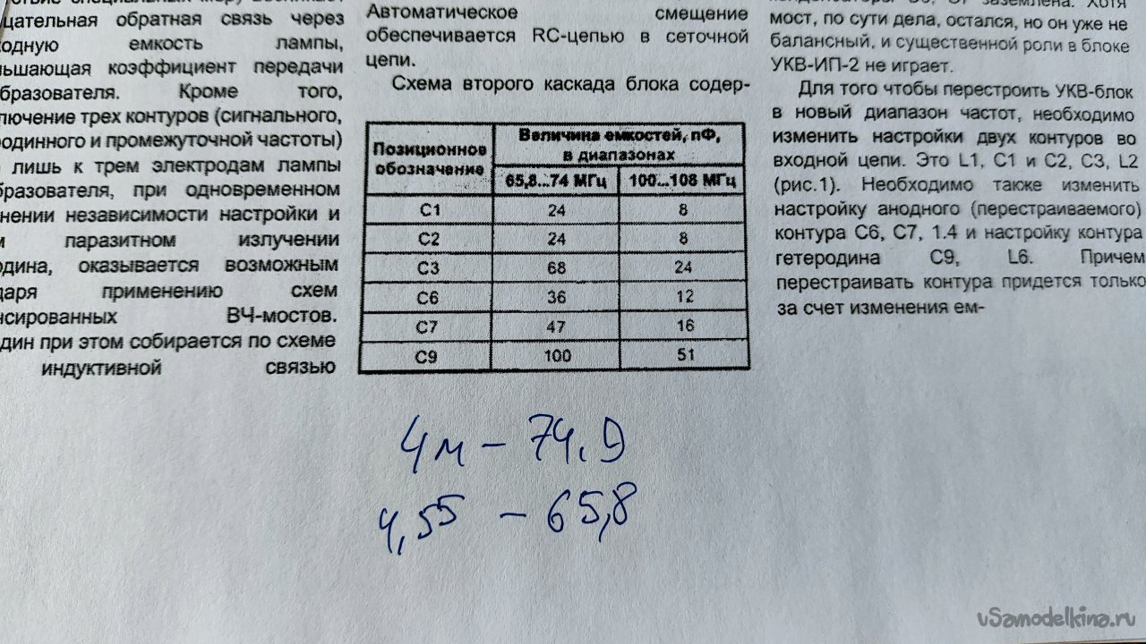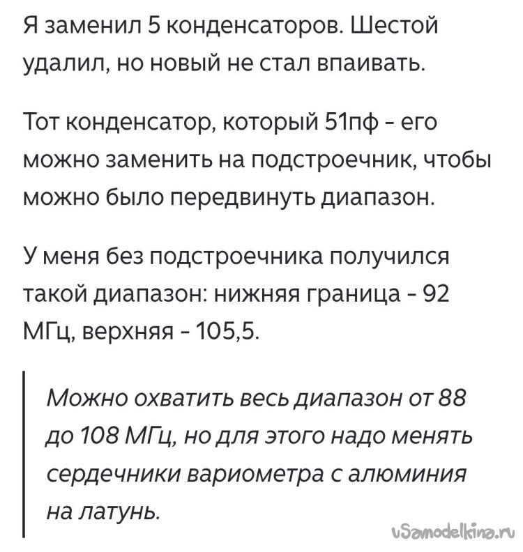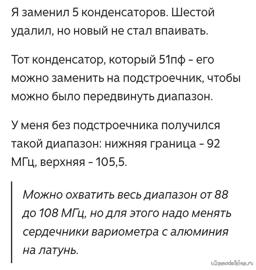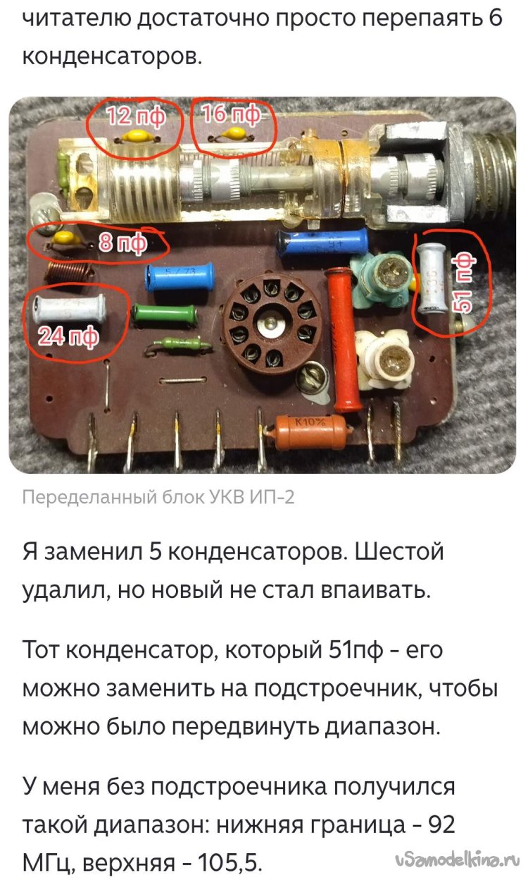 В поисках методов перестройки блока ИП-2 первой мне попалась статья на Дзене. Автор указывал, что необходимо поменять 6 конденсаторов, причем один из них на входе он вообще не ставил. С конденсатором 51 пФ он получил диапазон от 92 – 105 МГц. Вот выборочные копии экрана его статьи: