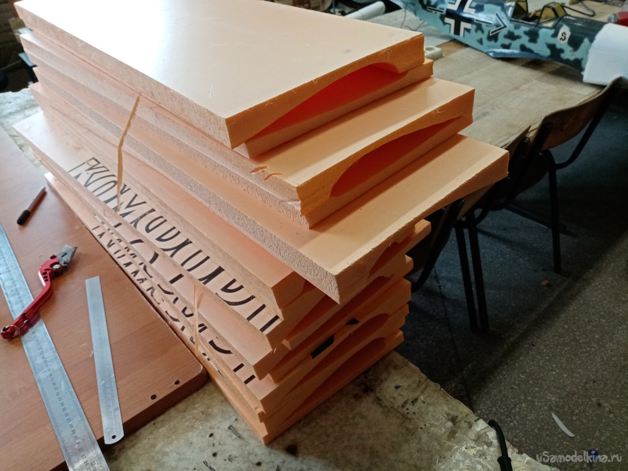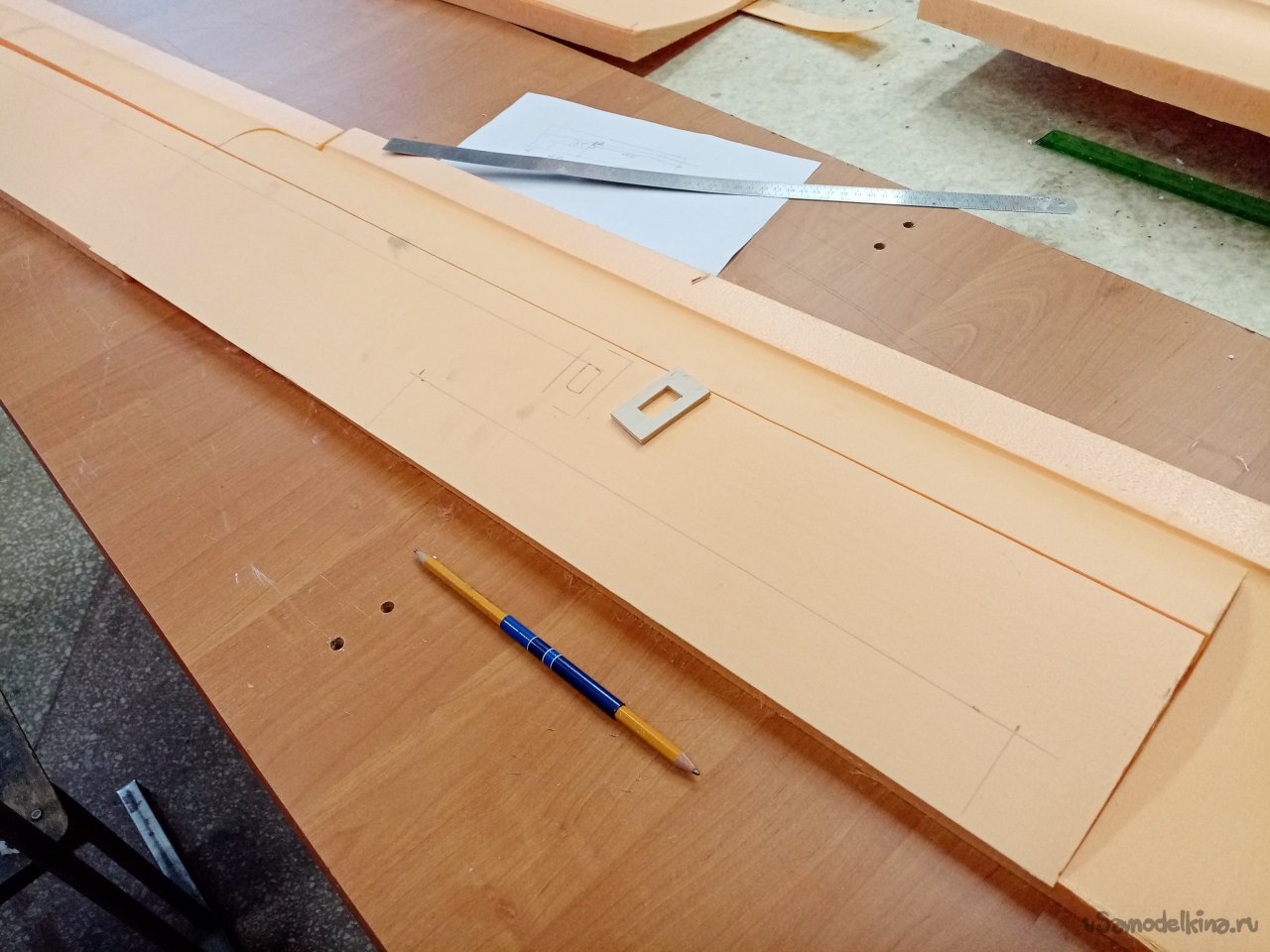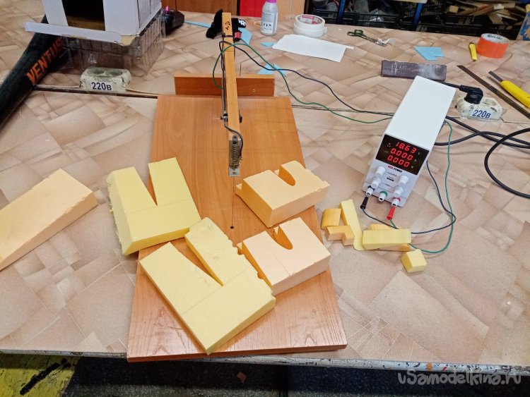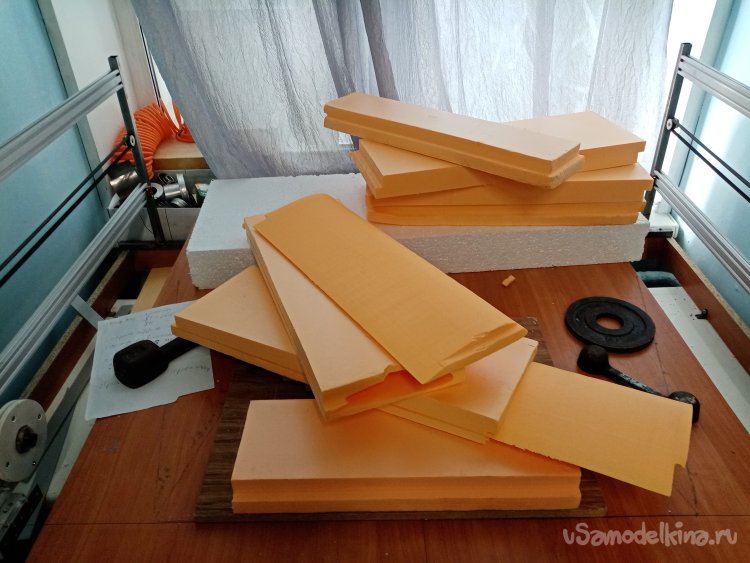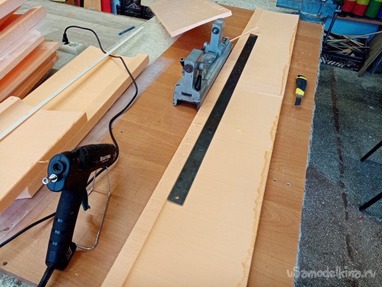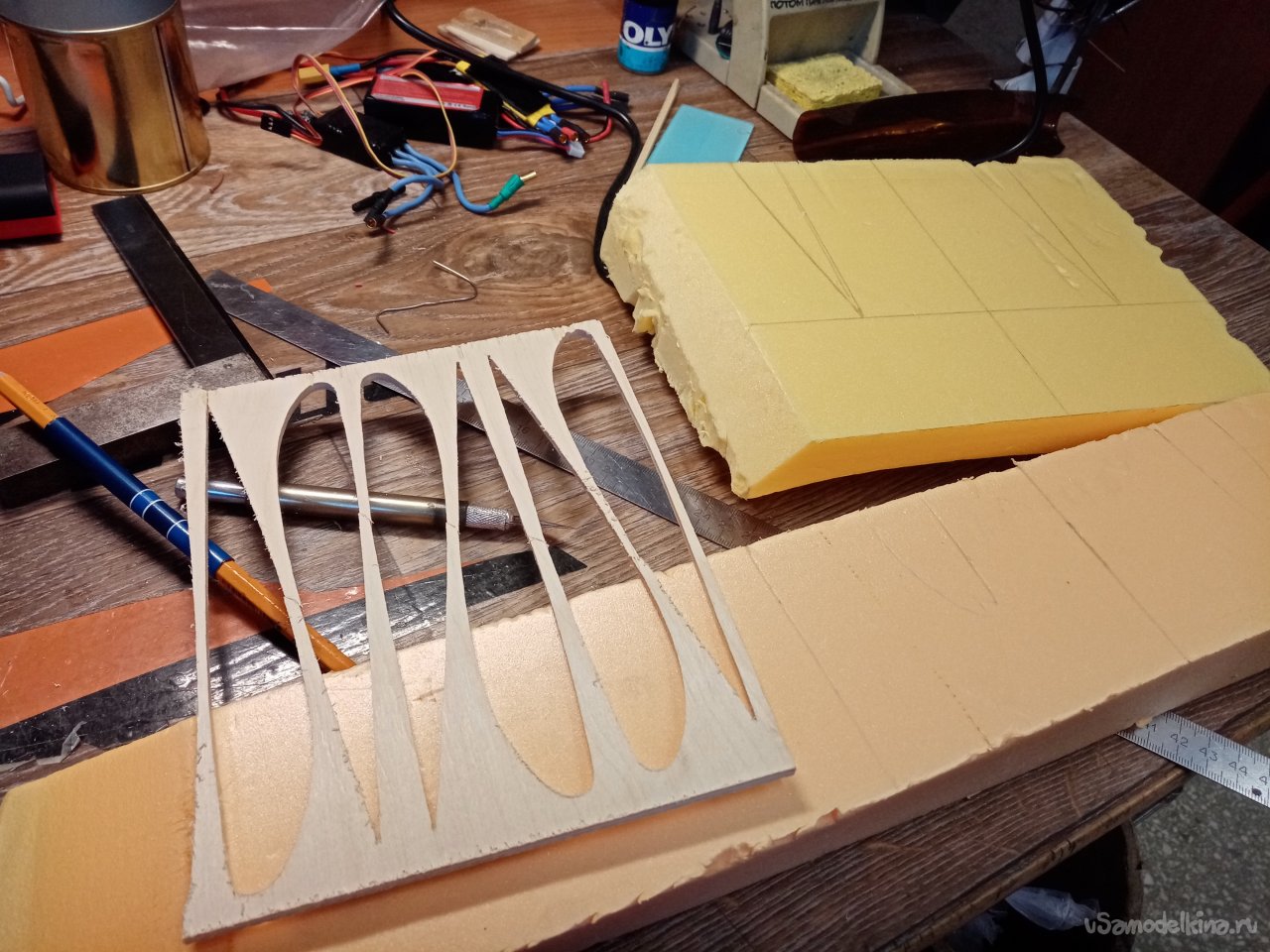 Чтобы склеивать половинки крыльев. Нужен стапель. Разрезаю остатки утеплителя после резки крыльев. Соединяю половинки и на таком импровизированном ложементе склеиваю половинки крыла при помощи отличного клея ПУР 500. После склейки и высыхания зачищаю поверхность. Размечаю положение рамочек установки сервоприводов и элементов усиления в центральной части крыло под болты крепления к фюзеляжу. Затем нужно разрезать готовое крыло для установки фанерного лонжерона. Процедуру провожу при помощи линейки и канцелярского ножа с выдвижным лезвием. Стараюсь резать строго вертикально. На маленьком станочке напилил фанерные заготовки элементов усиления. Лобзиком нарезал рамок под установку сервоприводов.