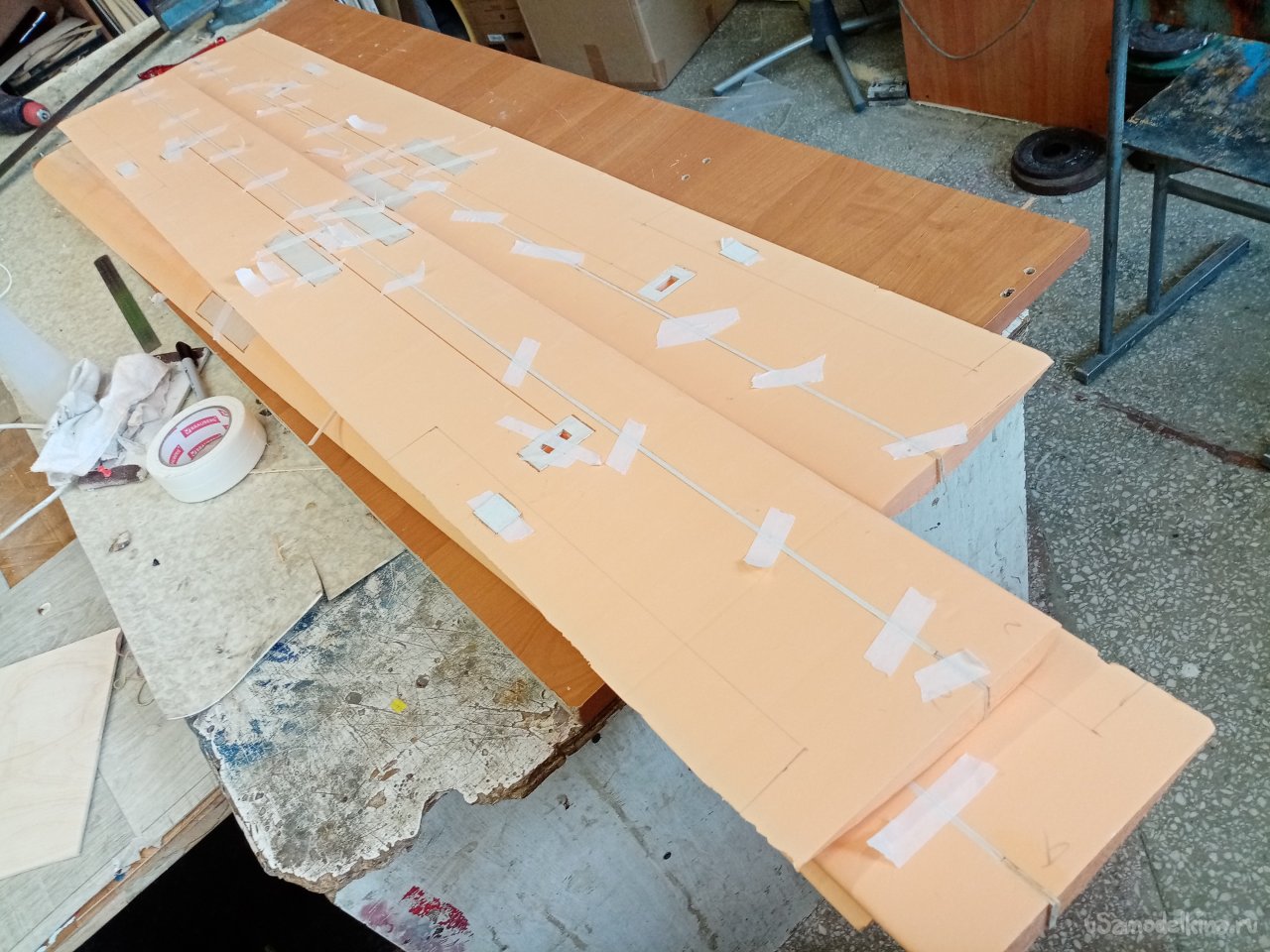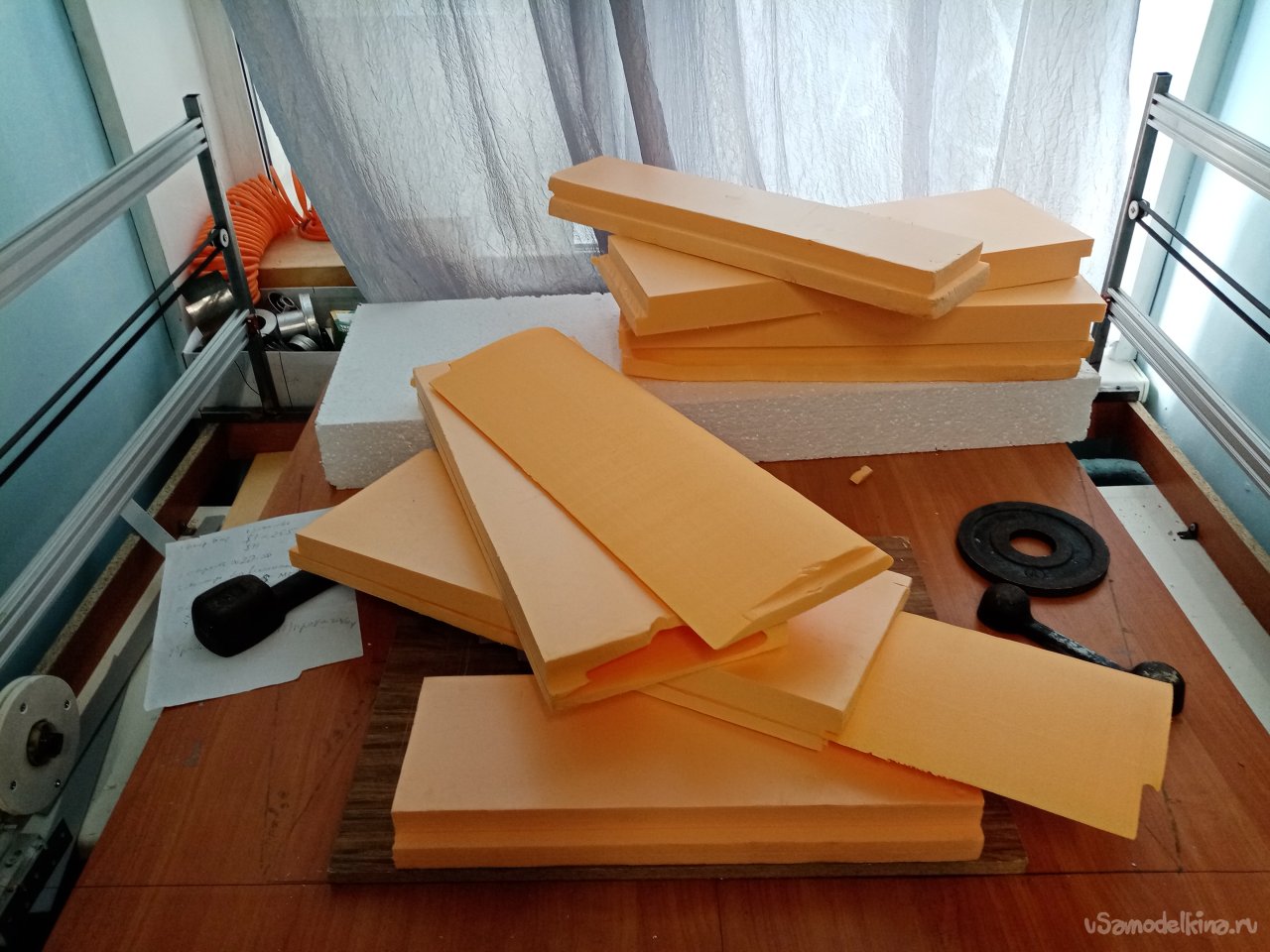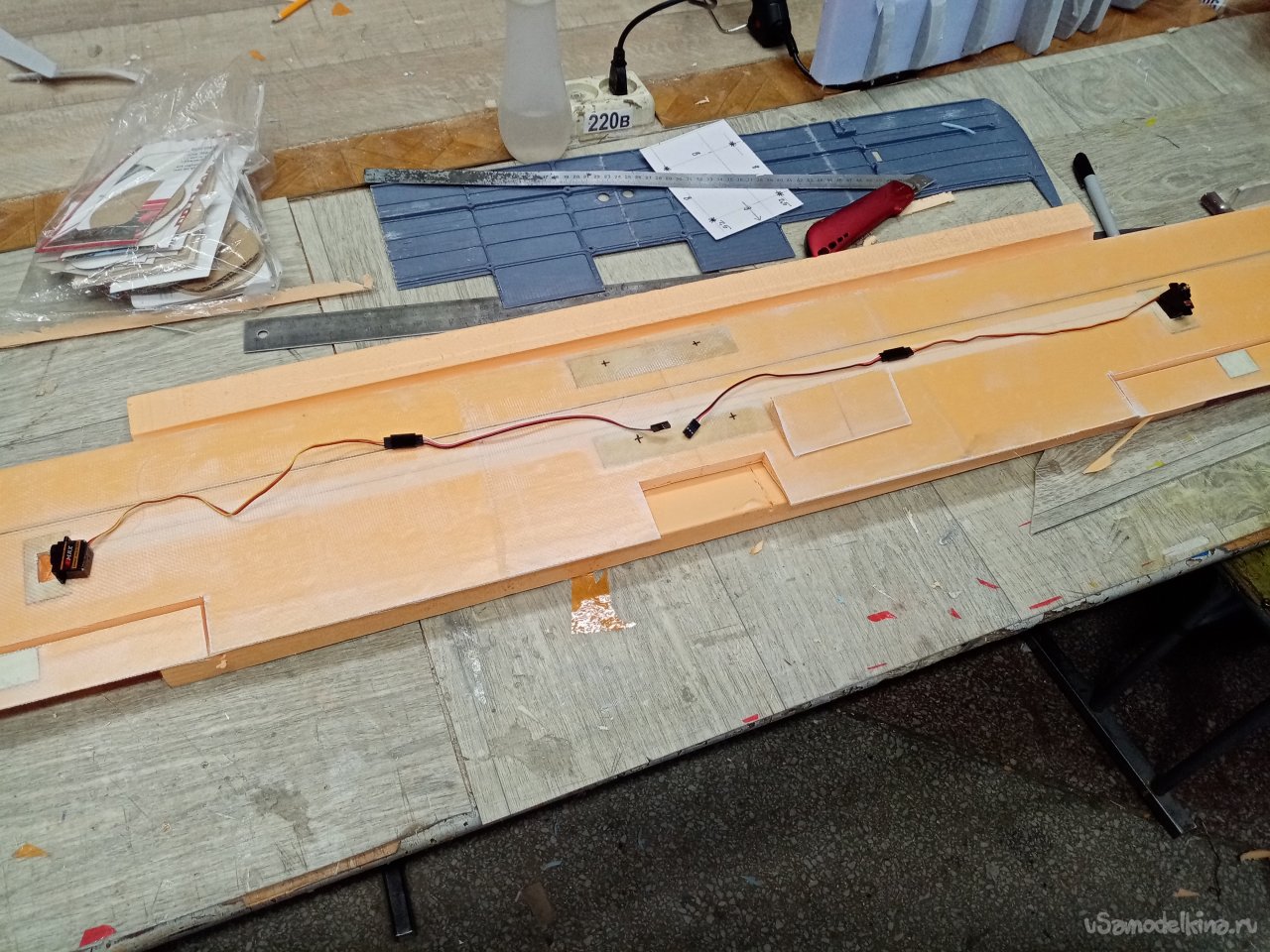 Чтобы склеивать половинки крыльев. Нужен стапель. Разрезаю остатки утеплителя после резки крыльев. Соединяю половинки и на таком импровизированном ложементе склеиваю половинки крыла при помощи отличного клея ПУР 500. После склейки и высыхания зачищаю поверхность. Размечаю положение рамочек установки сервоприводов и элементов усиления в центральной части крыло под болты крепления к фюзеляжу. Затем нужно разрезать готовое крыло для установки фанерного лонжерона. Процедуру провожу при помощи линейки и канцелярского ножа с выдвижным лезвием. Стараюсь резать строго вертикально. На маленьком станочке напилил фанерные заготовки элементов усиления. Лобзиком нарезал рамок под установку сервоприводов.