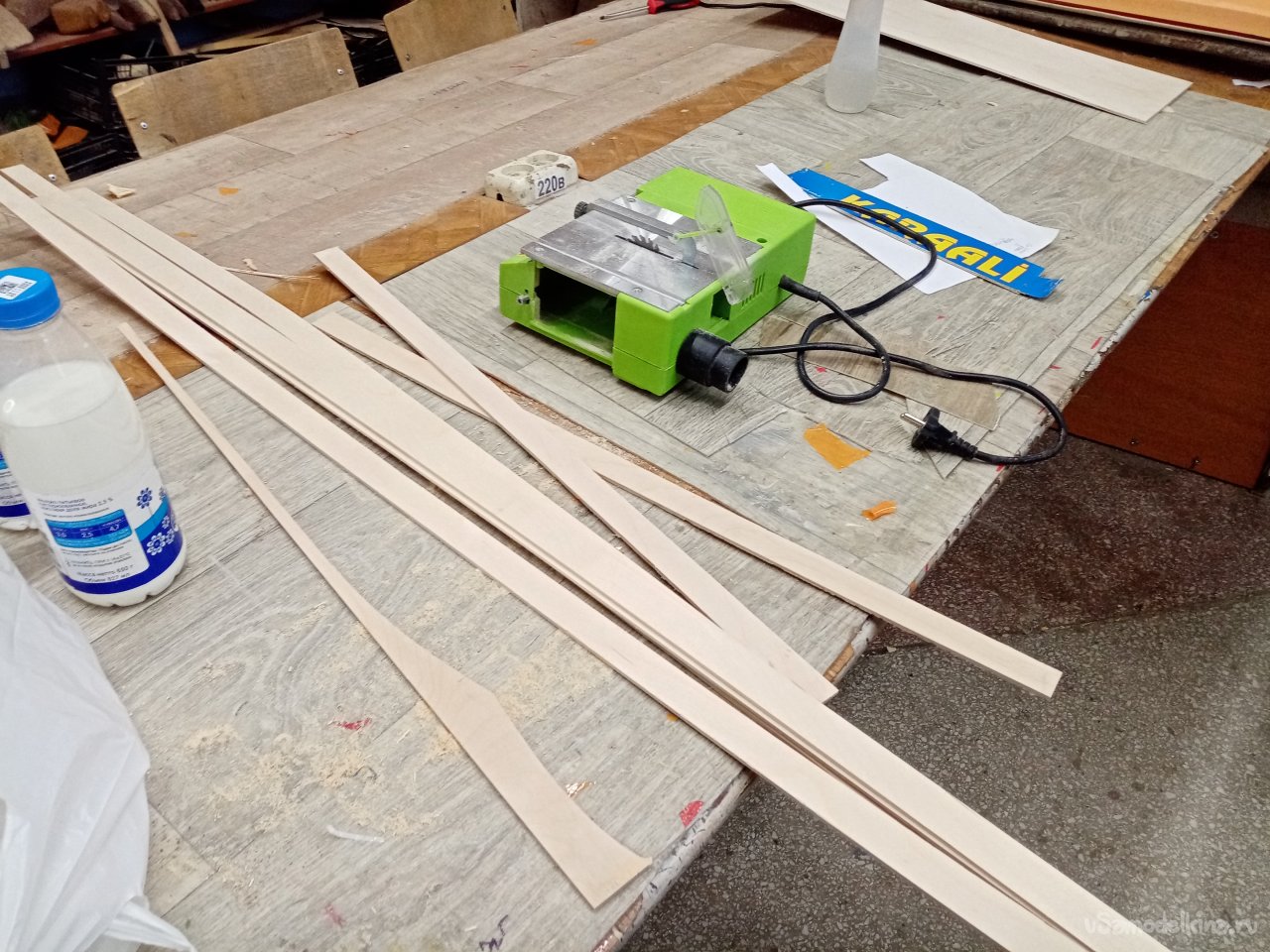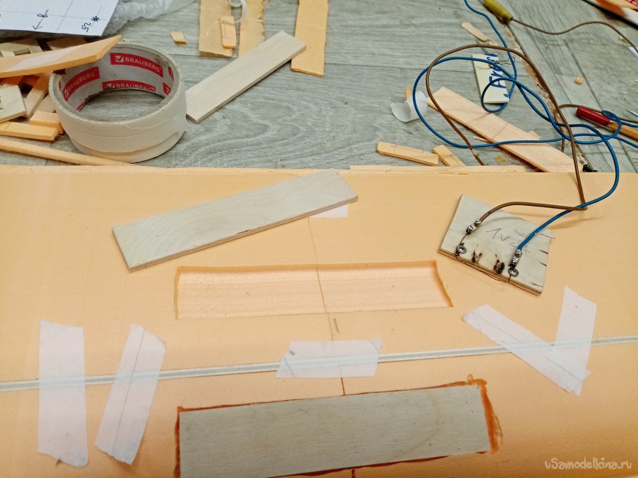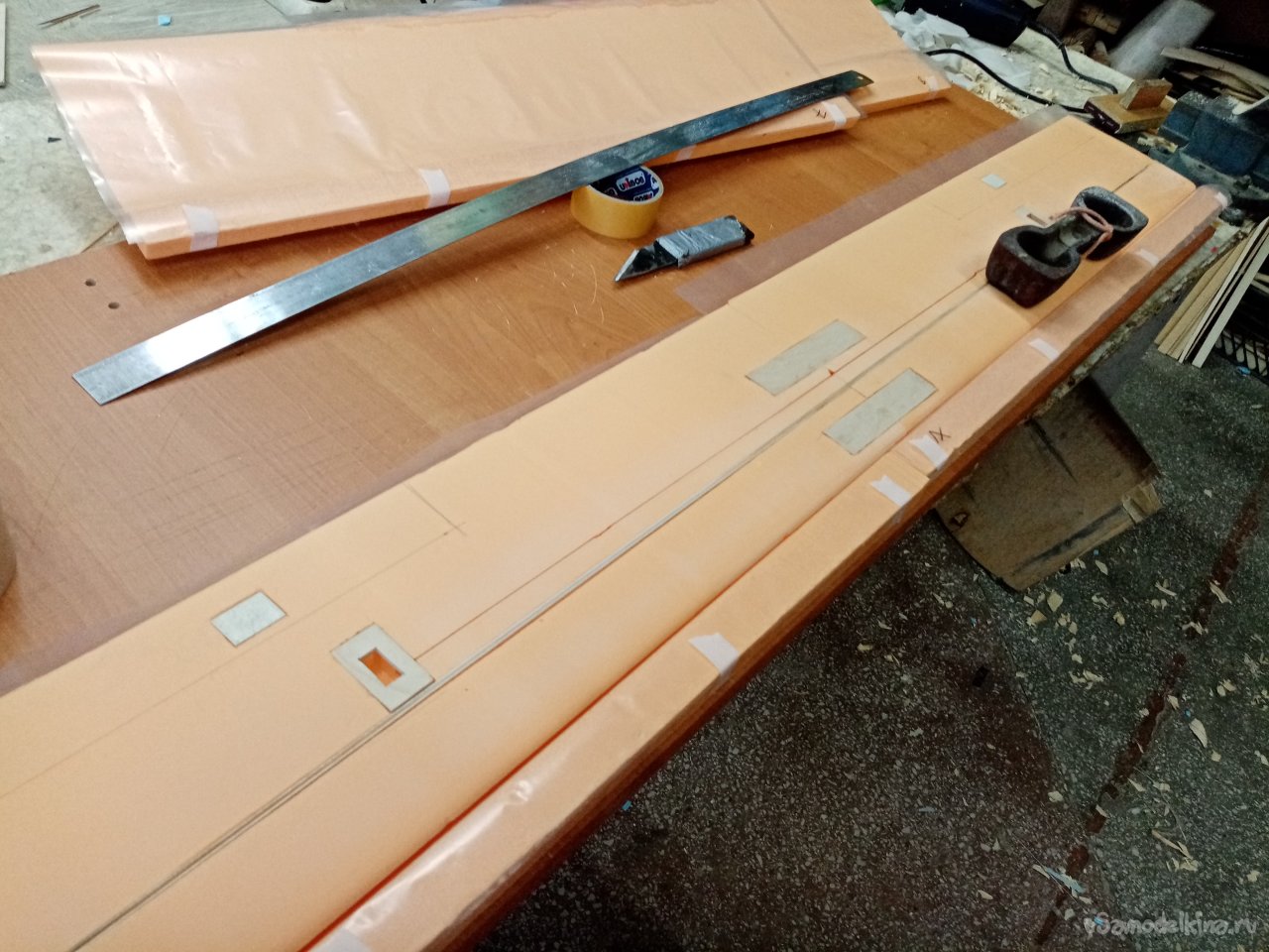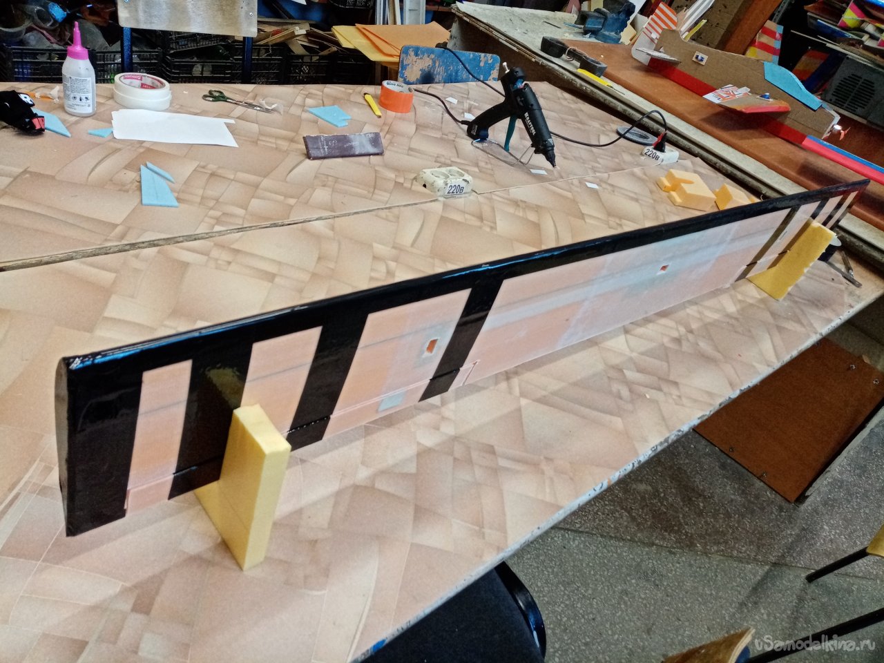 Чтобы склеивать половинки крыльев. Нужен стапель. Разрезаю остатки утеплителя после резки крыльев. Соединяю половинки и на таком импровизированном ложементе склеиваю половинки крыла при помощи отличного клея ПУР 500. После склейки и высыхания зачищаю поверхность. Размечаю положение рамочек установки сервоприводов и элементов усиления в центральной части крыло под болты крепления к фюзеляжу. Затем нужно разрезать готовое крыло для установки фанерного лонжерона. Процедуру провожу при помощи линейки и канцелярского ножа с выдвижным лезвием. Стараюсь резать строго вертикально. На маленьком станочке напилил фанерные заготовки элементов усиления. Лобзиком нарезал рамок под установку сервоприводов.