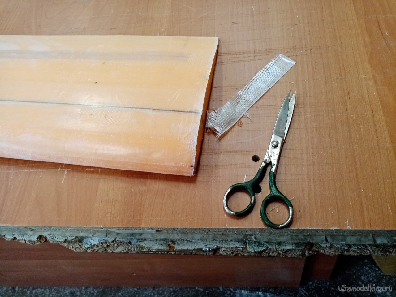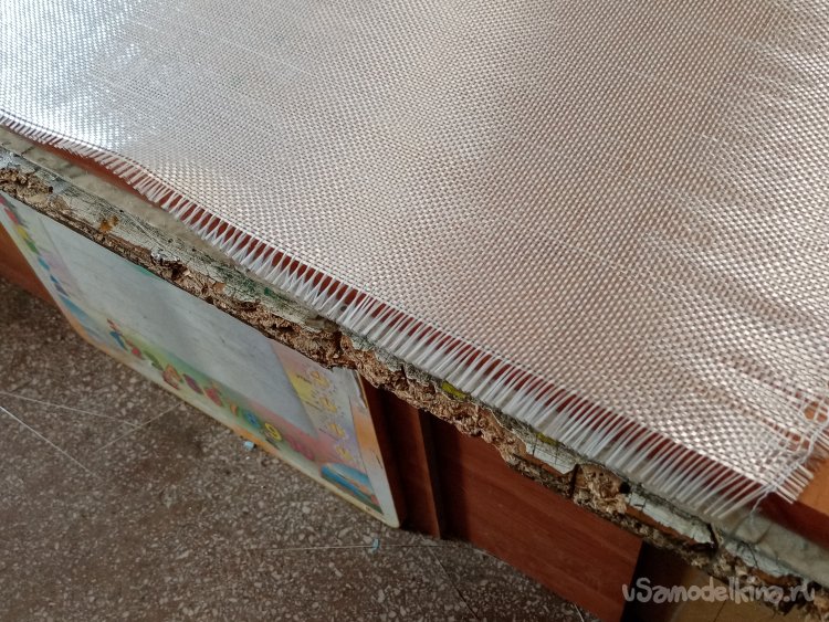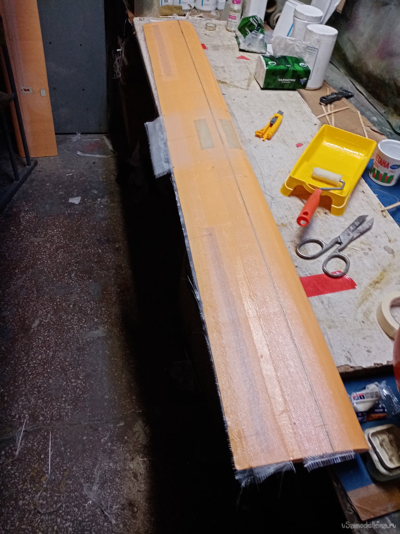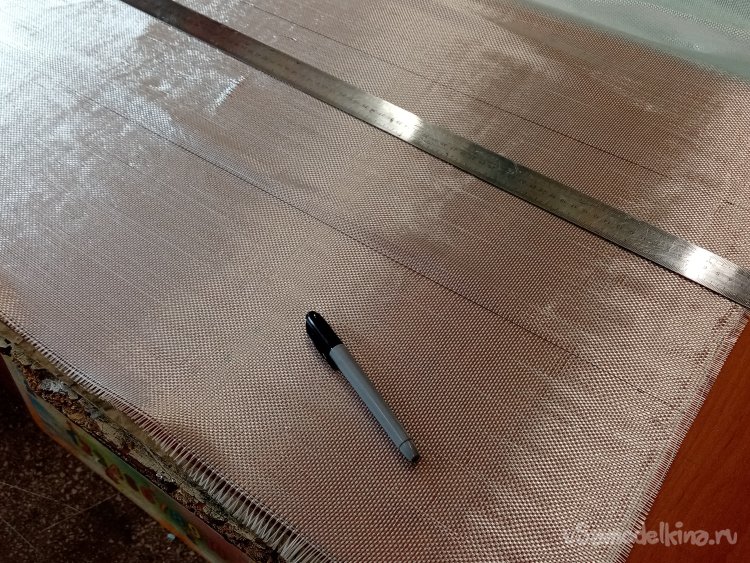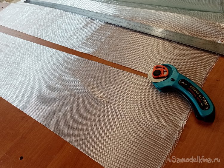 Крылья готовы. Формы готовы. Можно приступать к оклейки. Режу заготовки из стеклоткани.Сама процедура требует максимальной аккуратности. Поскольку буду применять стеклорогожу весом с 160 грамм. Она противная и жутко сыплется по краям. Работать трудно, зато самая дешевая. На стол укладываю большой и ровный мебельный щит. Из рулона отматываю некоторое количество ткани. Тщательно выравниваю по краю, не допуская перекосов материала. Отрезаю лохматый край.