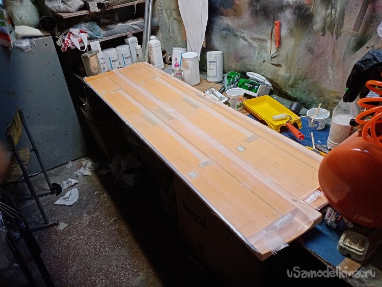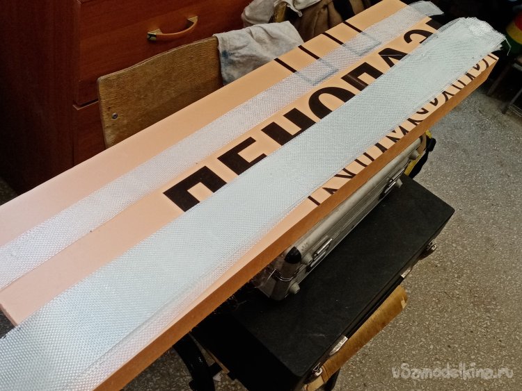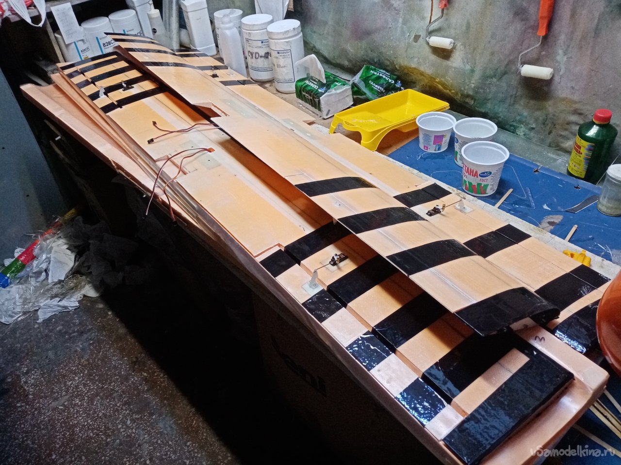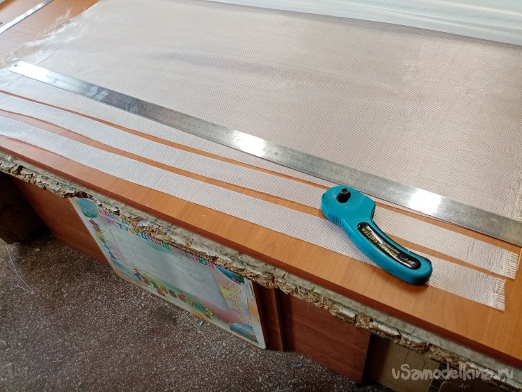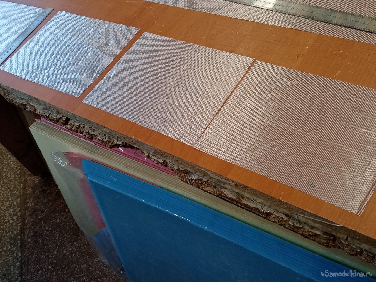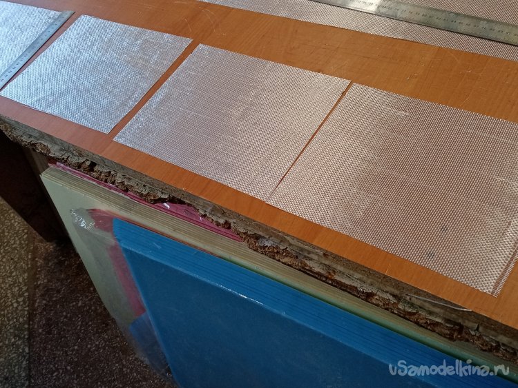 Крылья готовы. Формы готовы. Можно приступать к оклейки. Режу заготовки из стеклоткани.Сама процедура требует максимальной аккуратности. Поскольку буду применять стеклорогожу весом с 160 грамм. Она противная и жутко сыплется по краям. Работать трудно, зато самая дешевая. На стол укладываю большой и ровный мебельный щит. Из рулона отматываю некоторое количество ткани. Тщательно выравниваю по краю, не допуская перекосов материала. Отрезаю лохматый край.