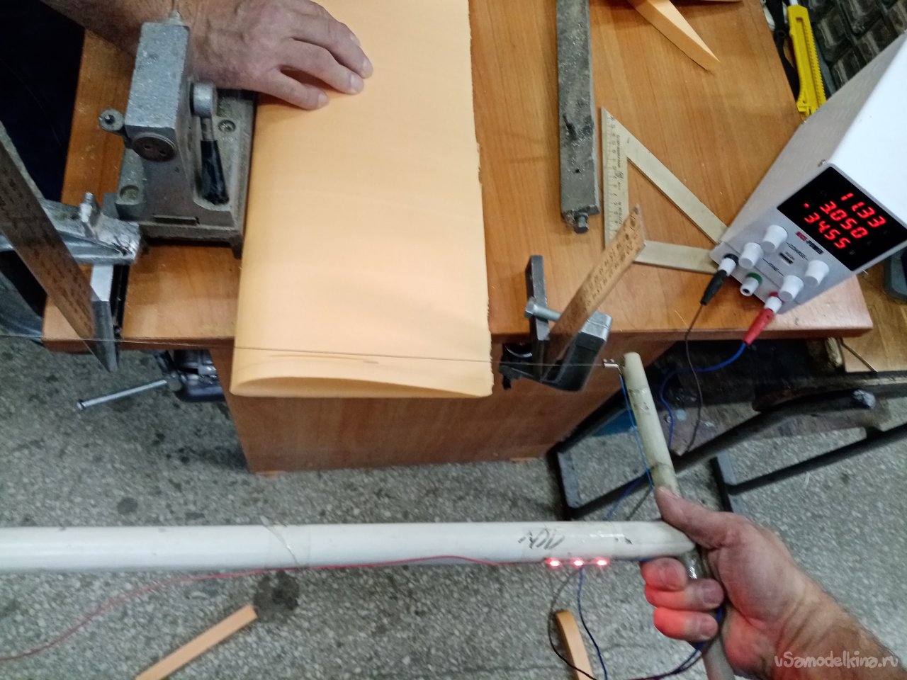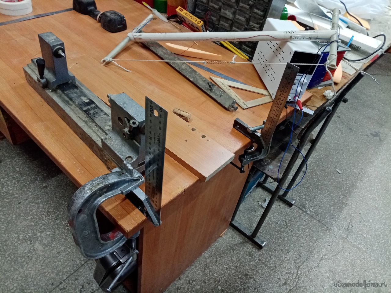 Для стыковки половинок крыла нужно торцевать заготовки и желательно точно. Поэтому на столе собираем прибор из двух металлических угольников и струбцин. При помощи лучковой пилы с нихромовой нитью точно режем торцы заготовок.