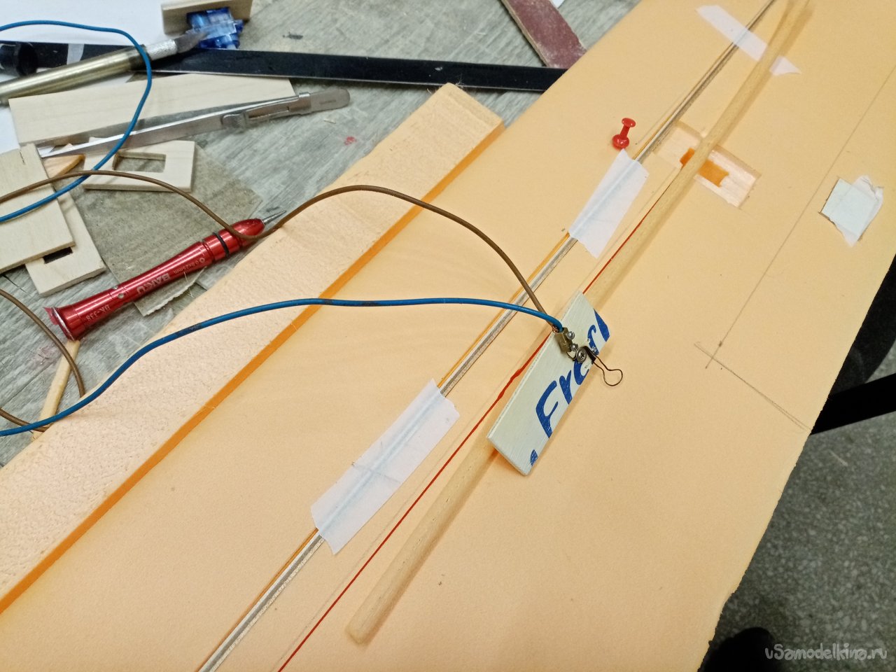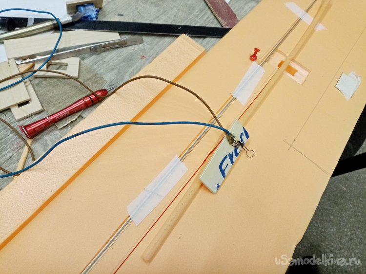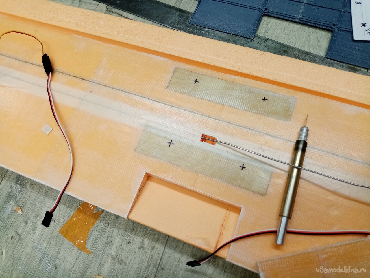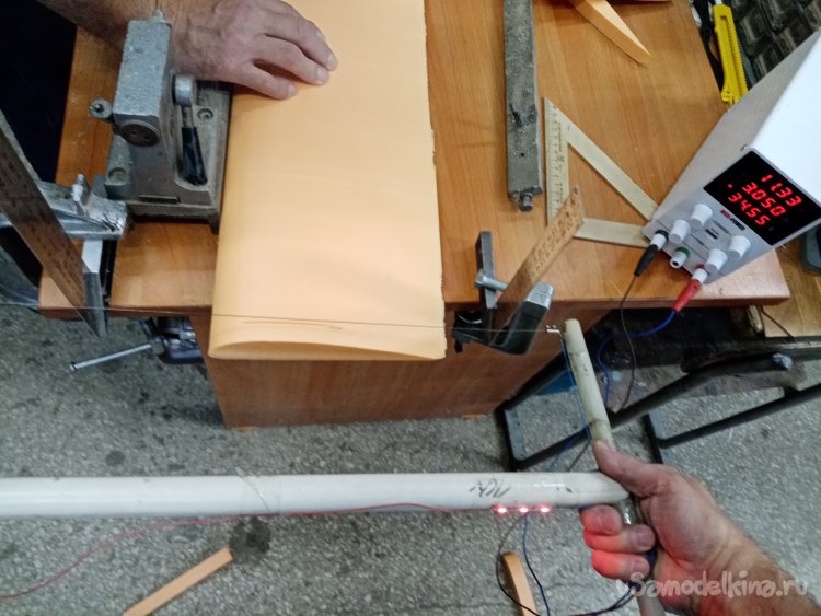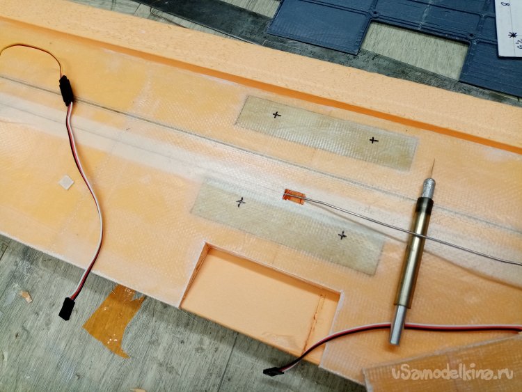 Последняя операция в подготовке к оклеиванию стеклотканью. Нужно прорезать в крыле каналы установки проводов управления к сервоприводам. Собрал из фанерки и кусочка нихрома колечко нужного диаметра. На пробном кусочке утеплителя корректирую размер. Достаточный для протаскивания кабеля с разъемами. Затем размечаю трассу на крыльях и прорезаю.