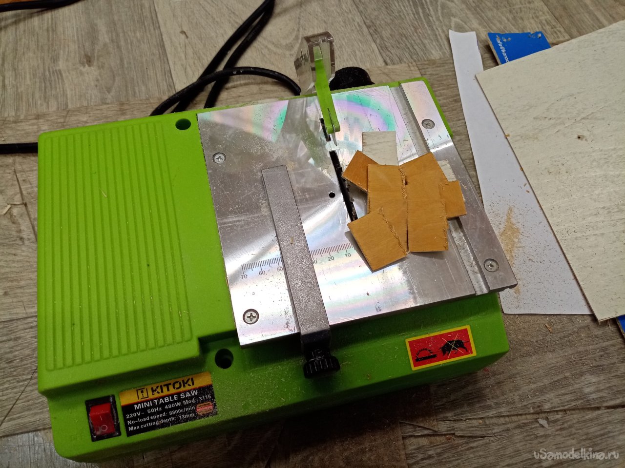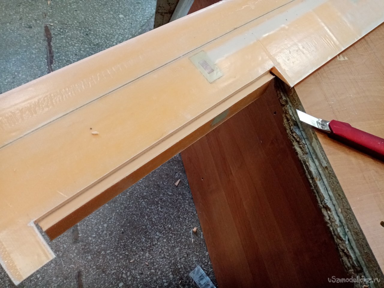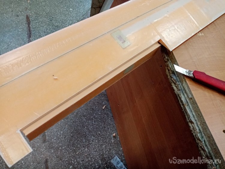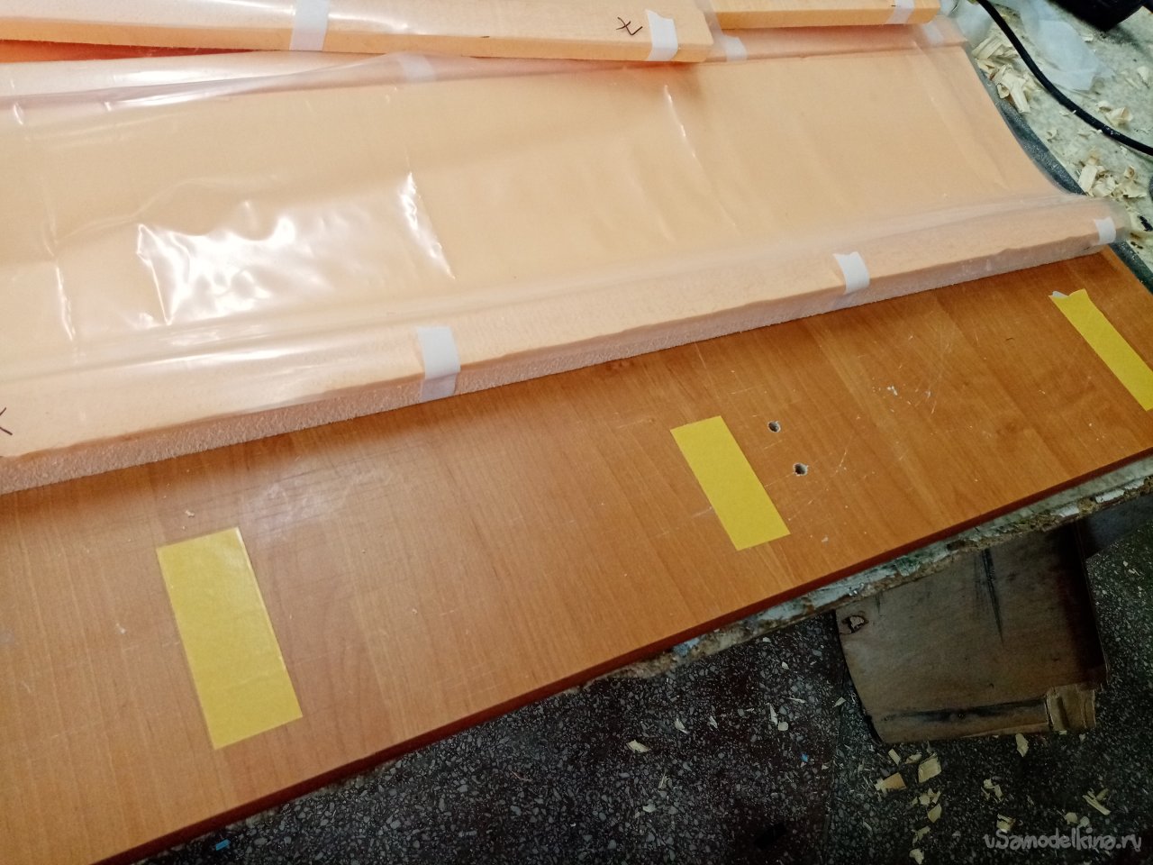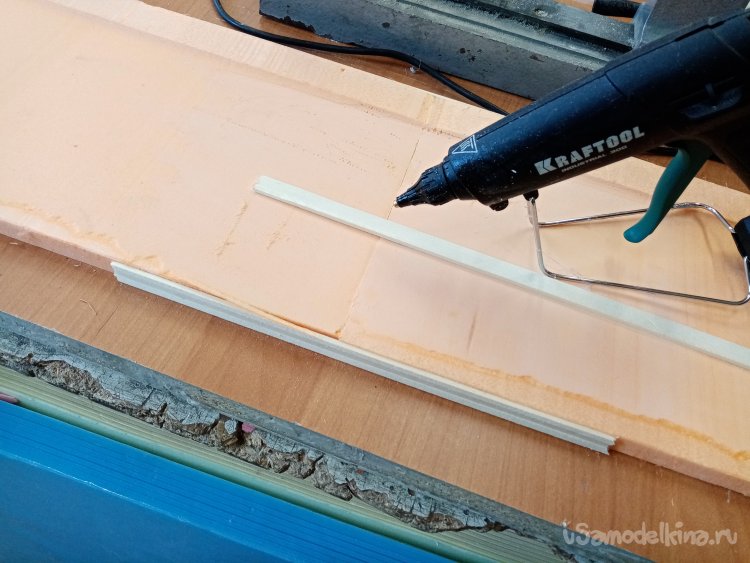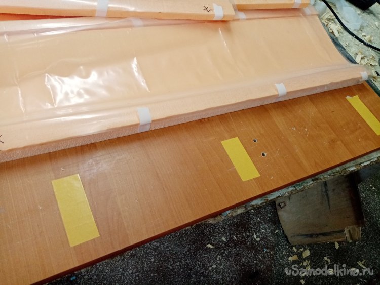 Поскольку нижнее пенопластовое ложе не очень прочное приклеиваю его на мебельный щит при помощи двухстороннего скотча.