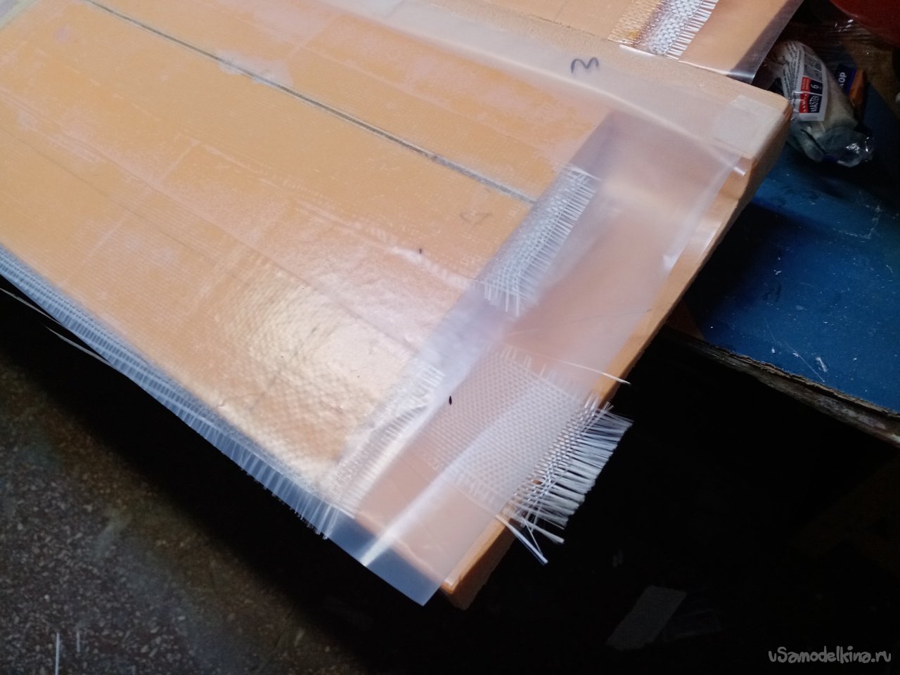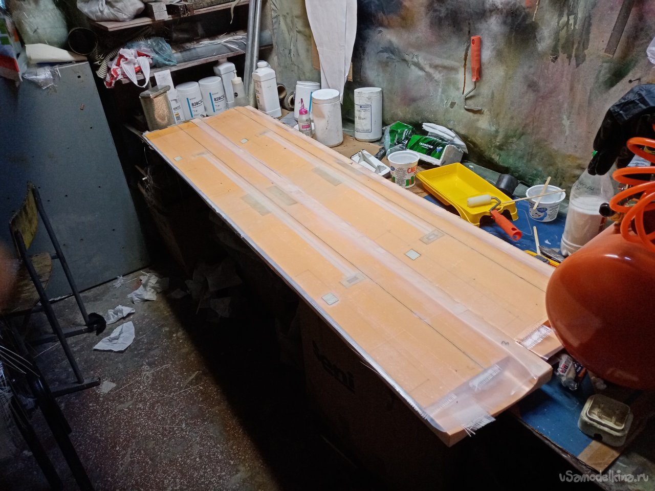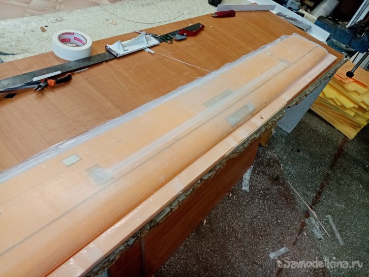И так, одна сторона готова. Приношу полосу пленки. Намазанную с одной стороны разделительной ваксой. Вот этой стороной нужно ее положить на крыло. Нужен инструмент. Конкретно резиновый мягкий валик. Процедура следующая. Укладываю кончик пленки на конец крыла. Вторая половина висит, держу рукой. Прилип кончик к смоле. Валиком прикатываю пленку к поверхности. Слежу, чтобы не было воздушных пузырьков. Ответственная процедура. Оторвать пленку и переложить не получится. Смола уже приклеилась к поверхности. Все уложил, прикатал валиком. Приношу мебельный щит со стапелем. Аккуратно укладываю крыло пленкой на пенопласт.