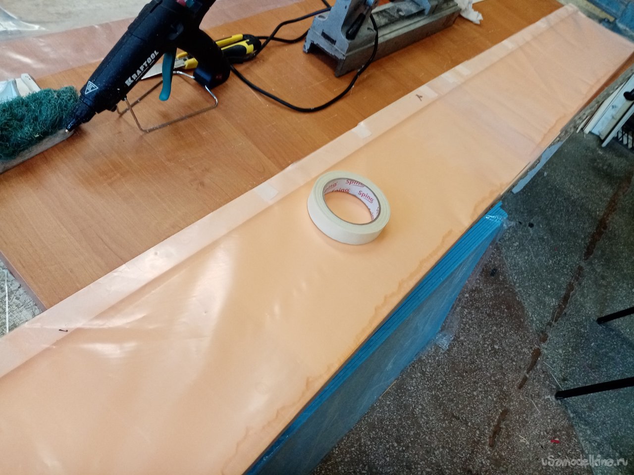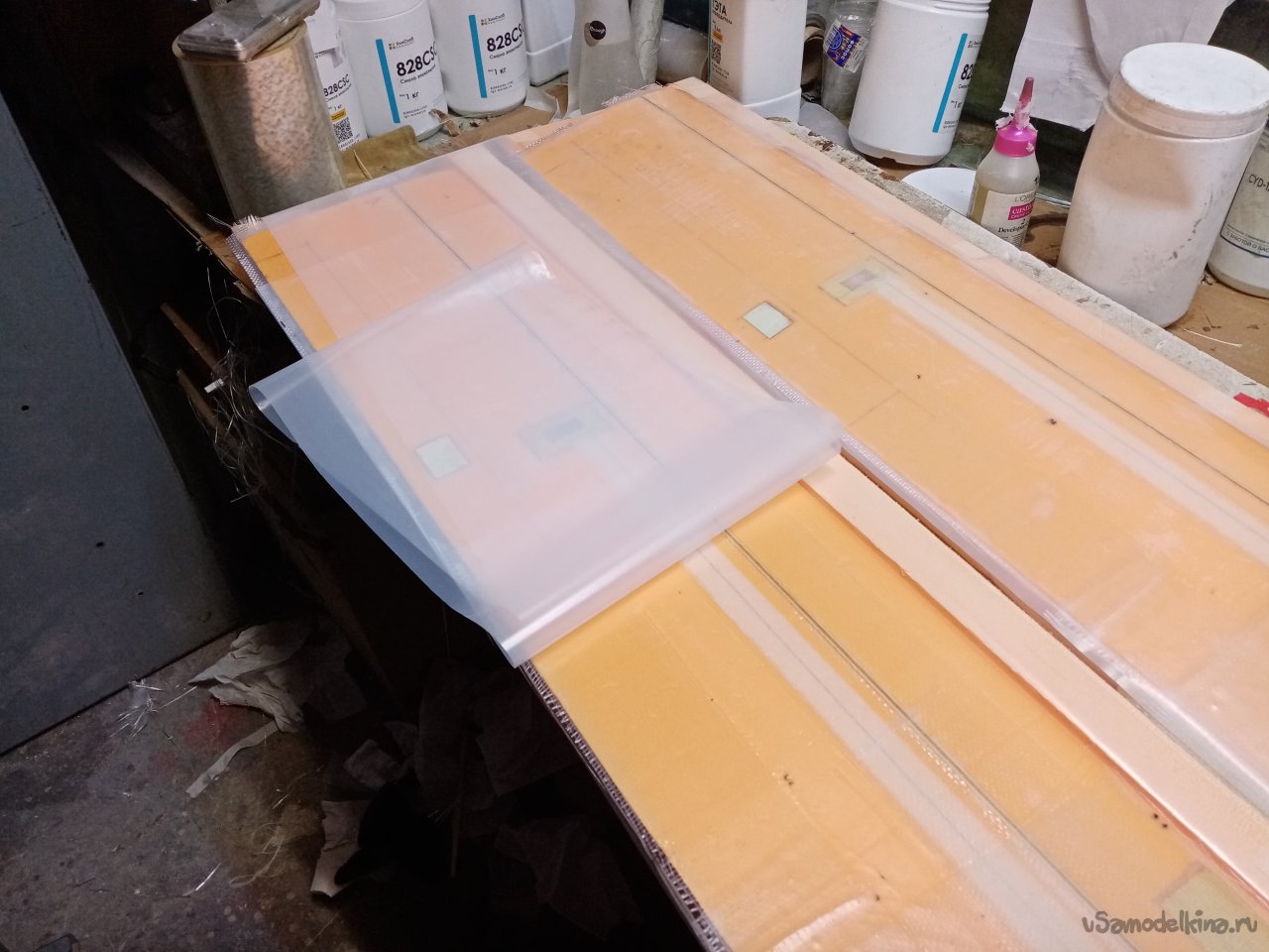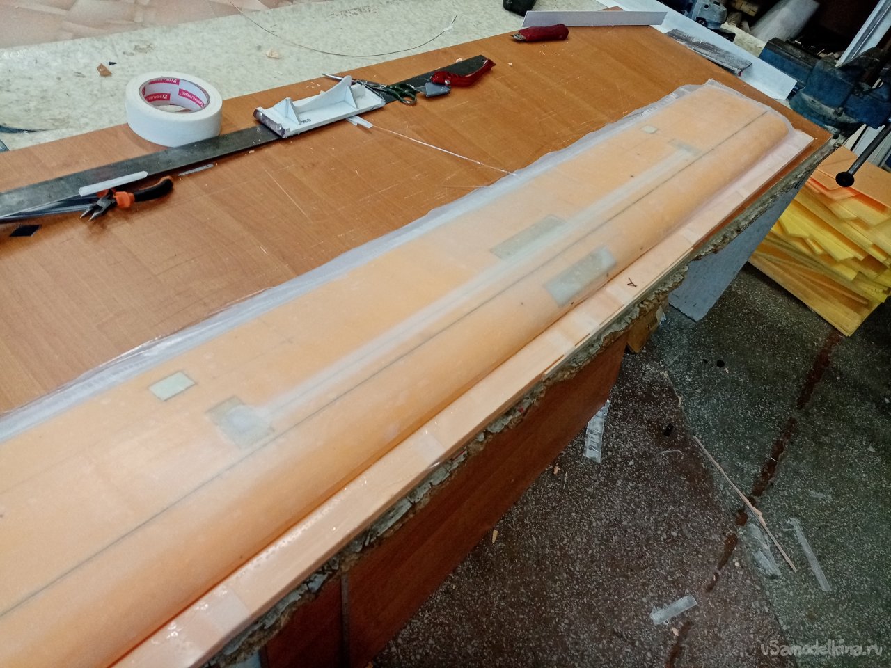 И так, одна сторона готова. Приношу полосу пленки. Намазанную с одной стороны разделительной ваксой. Вот этой стороной нужно ее положить на крыло. Нужен инструмент. Конкретно резиновый мягкий валик. Процедура следующая. Укладываю кончик пленки на конец крыла. Вторая половина висит, держу рукой. Прилип кончик к смоле. Валиком прикатываю пленку к поверхности. Слежу, чтобы не было воздушных пузырьков. Ответственная процедура. Оторвать пленку и переложить не получится. Смола уже приклеилась к поверхности. Все уложил, прикатал валиком. Приношу мебельный щит со стапелем. Аккуратно укладываю крыло пленкой на пенопласт.