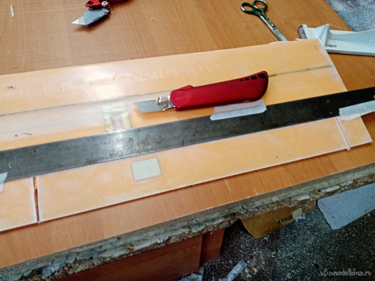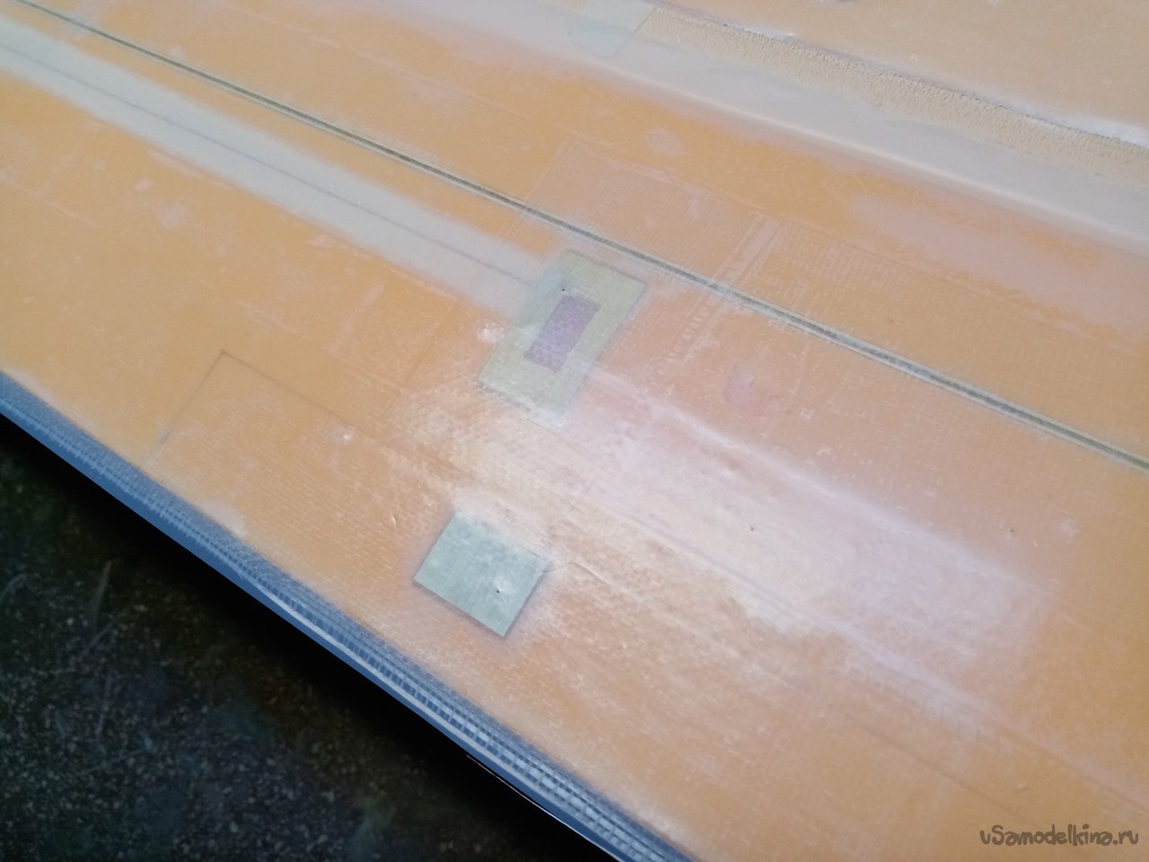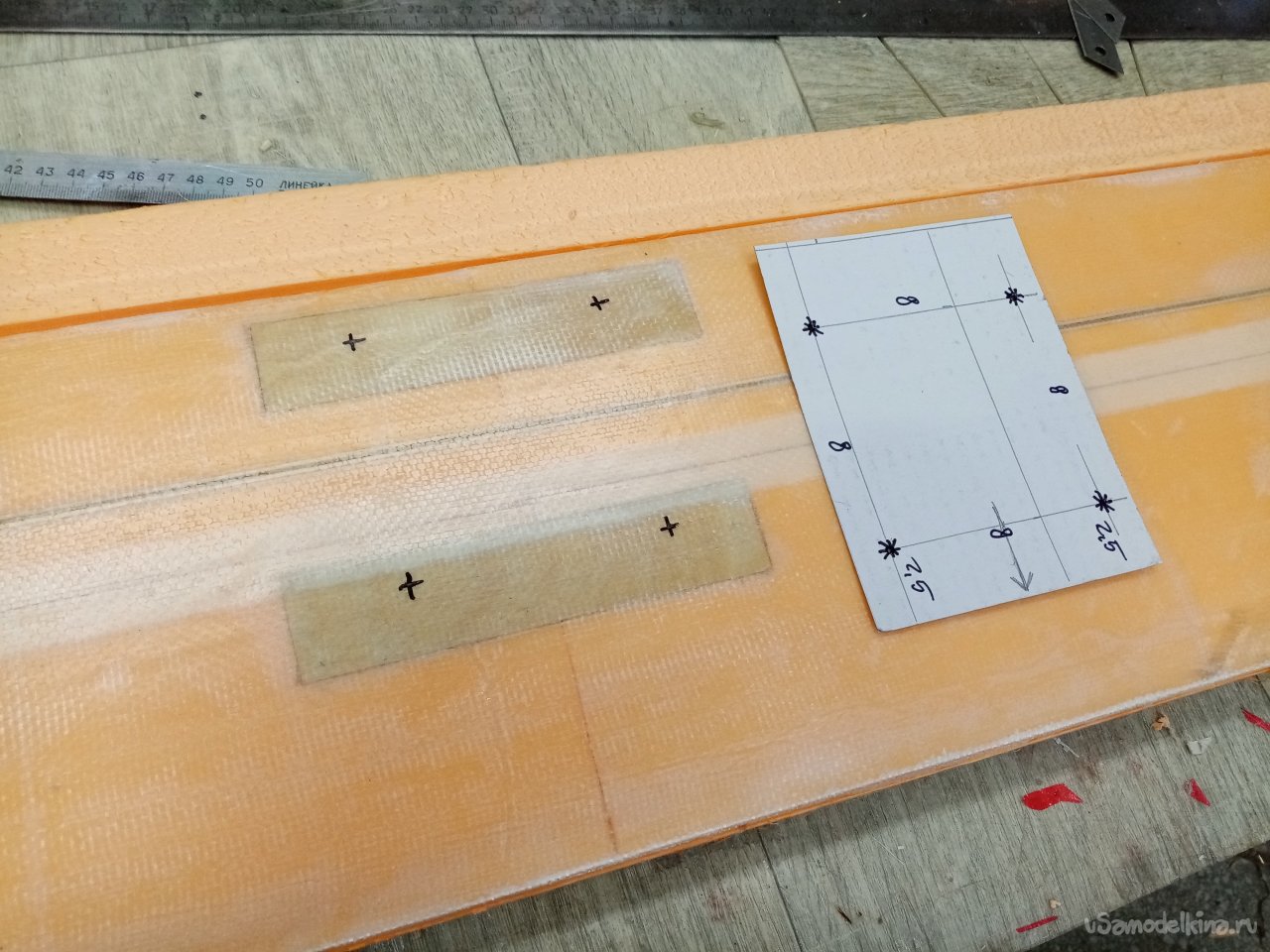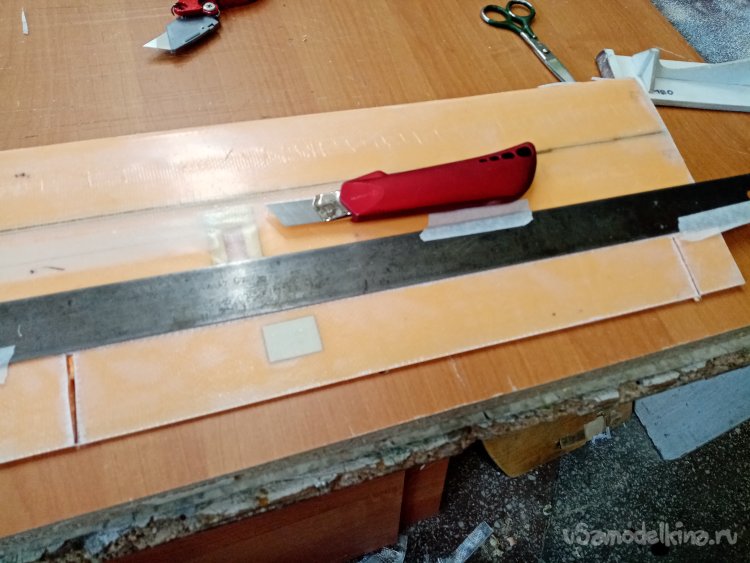 Режу очень аккуратно роликовым ножом по металлической линейке. Затем размечаю полоски на переднюю кромку и также режу. И прямоугольники усиления на середину крыла. В зону максимальной нагрузки. Где оно будет крепиться к фюзеляжу.