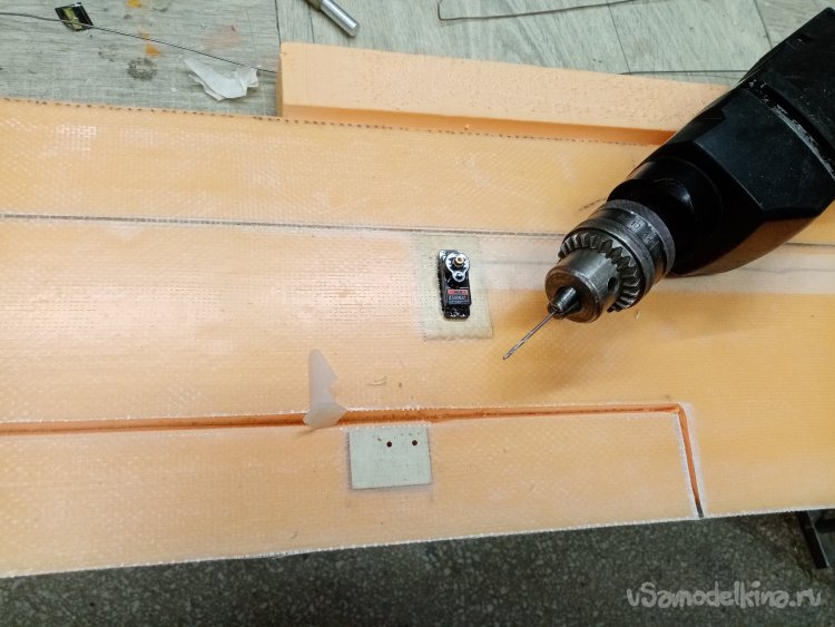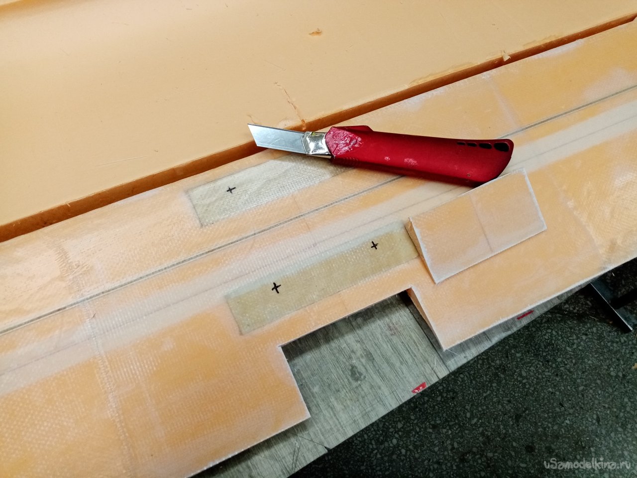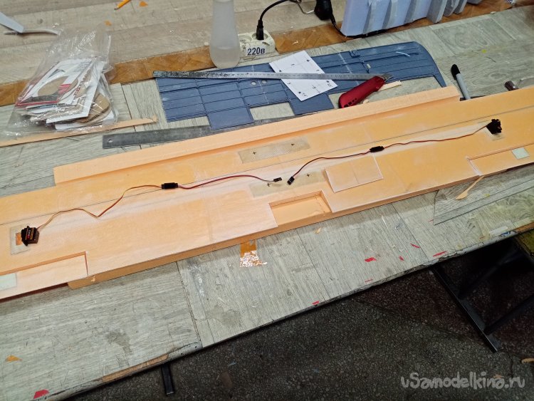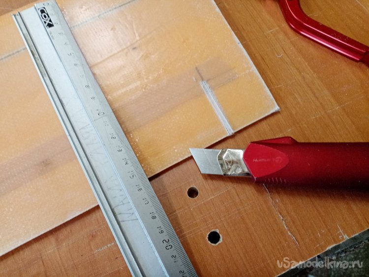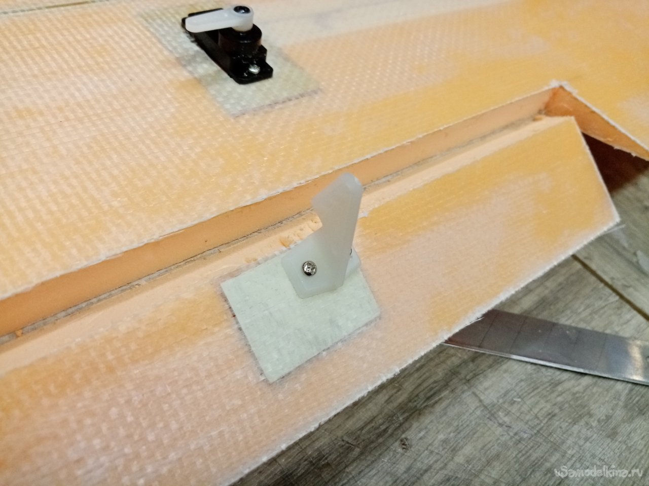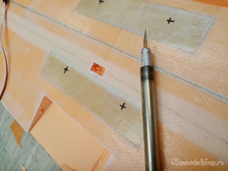 Треугольным ножом прорезаю отверстия под провода и сервоприводы.