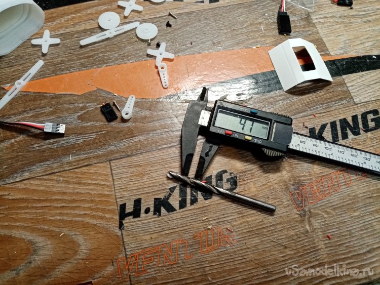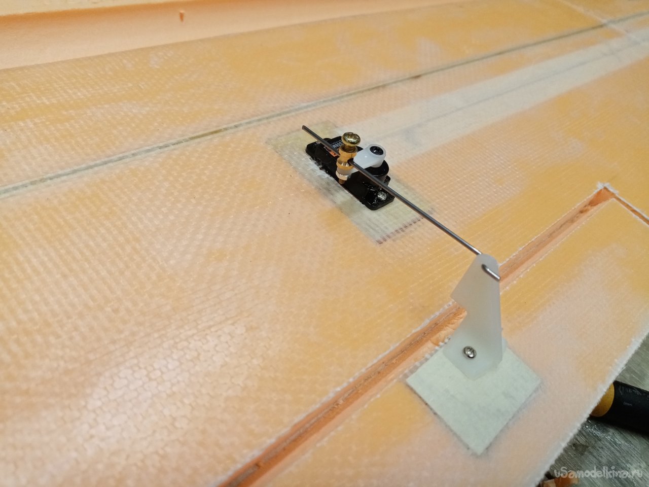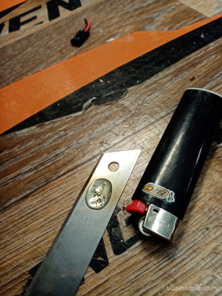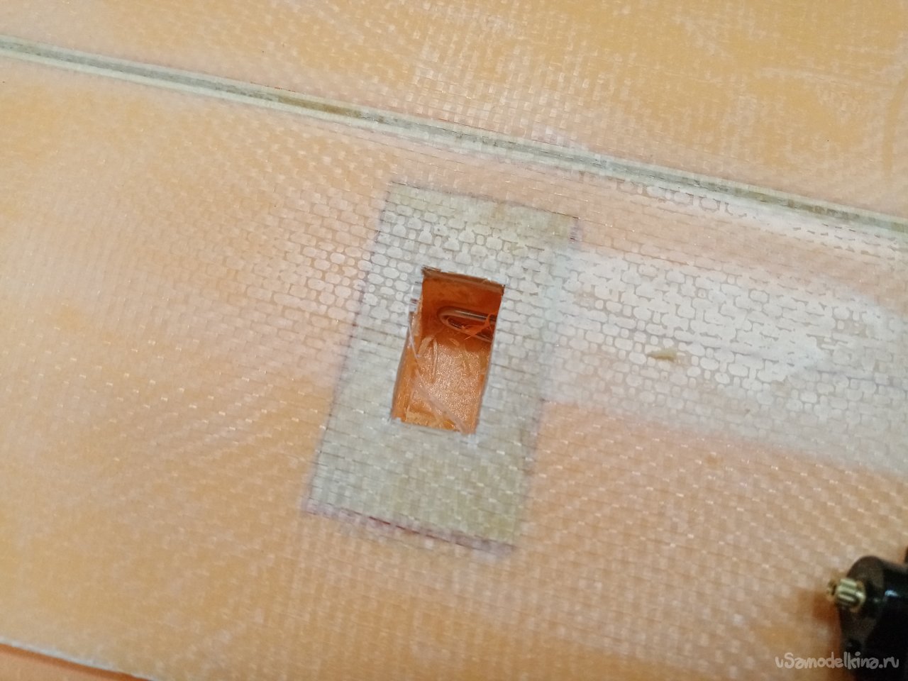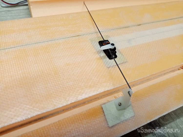 Треугольным ножом прорезаю отверстия под провода и сервоприводы.