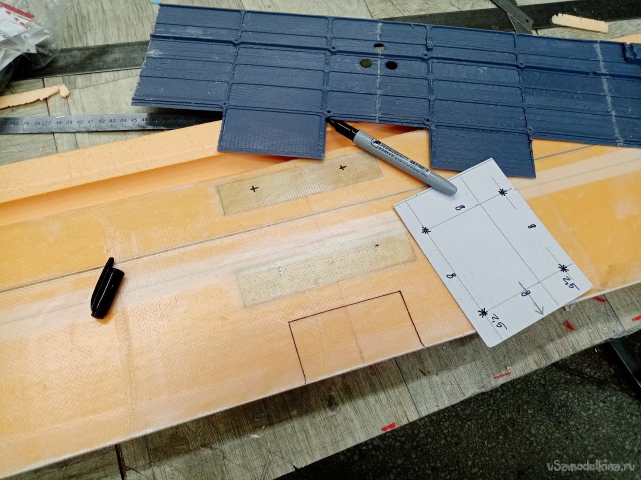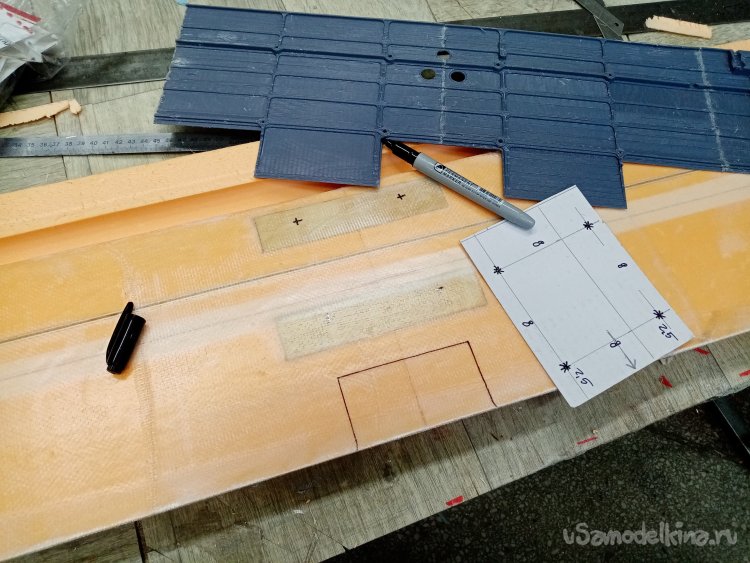 Размечаю на полосы по размеру крыла, наношу точки фломастером.