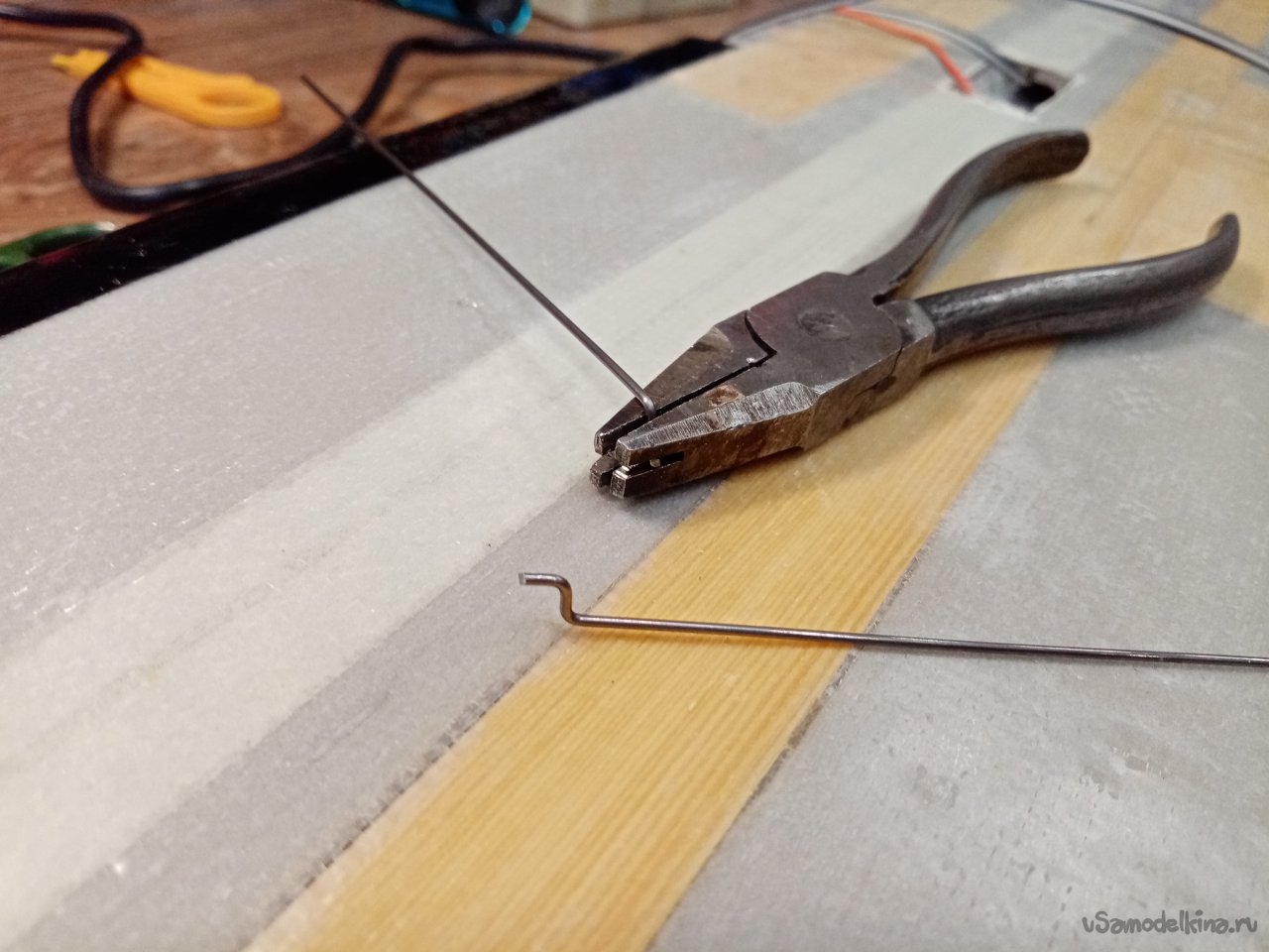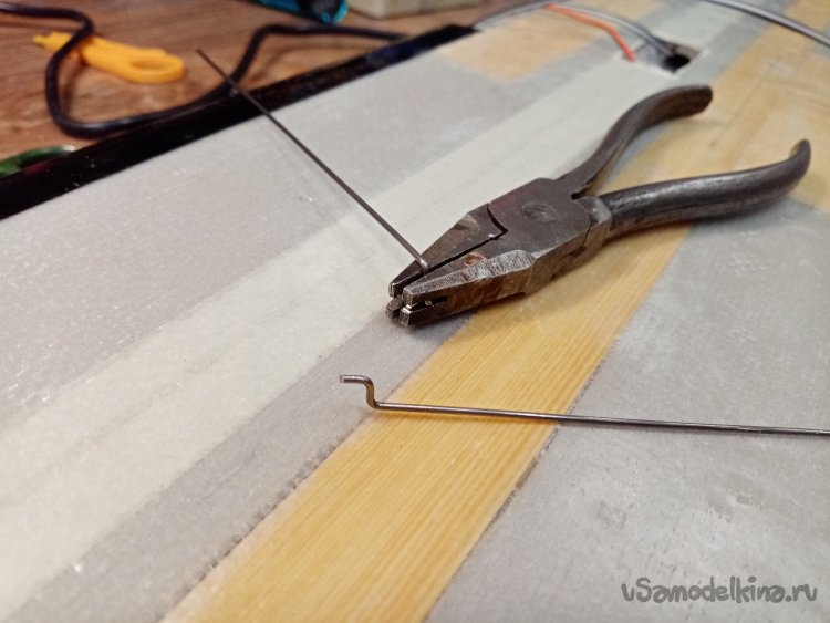 Принесли отличную проволоку для тяг и фиксаторы. Продолжаю процесс. При помощи самодельного приспособления из старых плоскогубцев сгибаю один кончик буквой «Г». Примеряю, отрезаю.