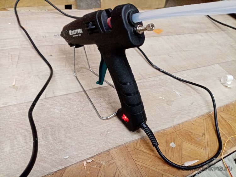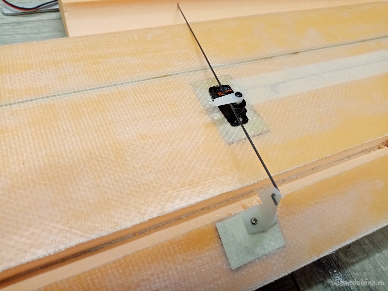 Нужно протянуть провода в прорезанные каналы. Воспользуюсь проволокой. Проталкиваю её до колодца сервопривода. К кончику закрепляю провод и протаскиваю обратно. И так 8 раз, просто и быстро.