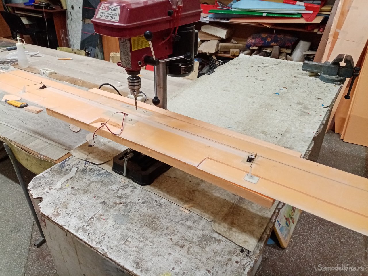 Нужно сверлить отверстия под крепления. Крыло большое. Тащу сверлильный станок на простор. Мне нужно строго вертикально. Нахожу сверло нужного диаметра.